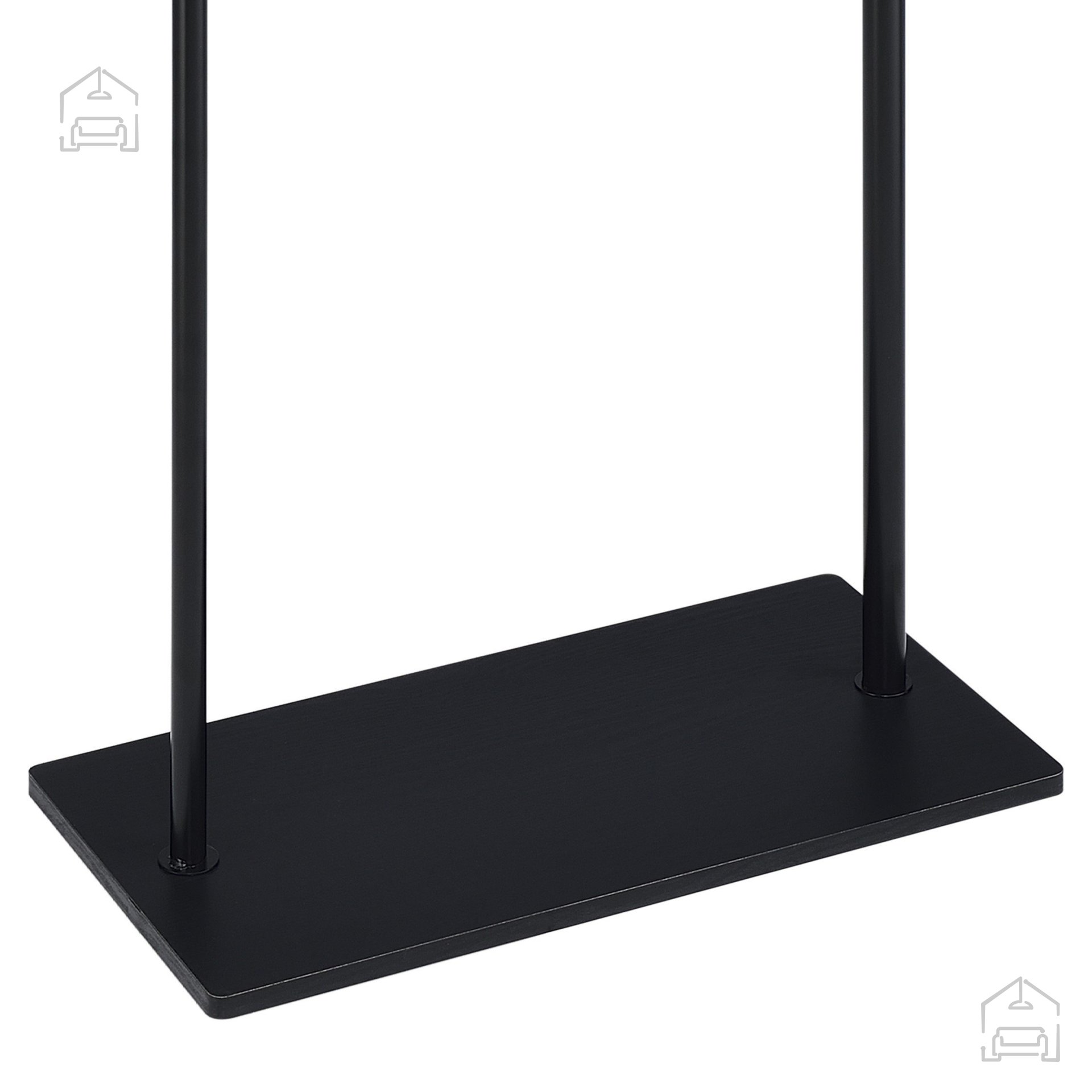 Podnožje stojala je izdelano iz velike, pravokotne lesene plošče črne barve, ki skrbi za stabilnost celotne konstrukcije. Težišče je optimalno porazdeljeno, tako da se stojalo ne nagiba niti pri večji obremenitvi. Konstrukcija je razstavljiva (K/D), kar pomeni, da jo je mogoče hitro sestaviti ali razstaviti brez posebnega orodja. To je še posebej priročno pri selitvah, shranjevanju ali prenosu med prostori.