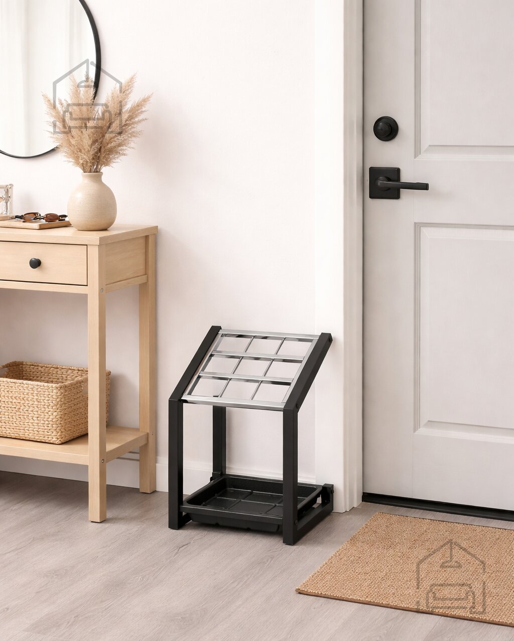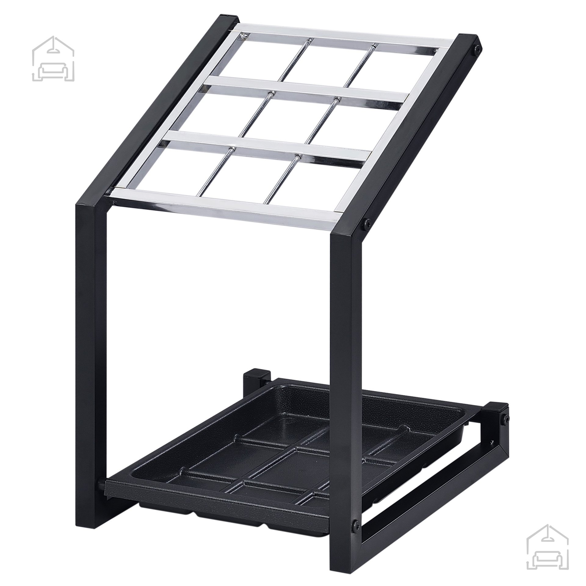 To elegantno in funkcionalno stojalo za dežnike združuje sodoben dizajn ter praktično zasnovo, ki poskrbi za urejen vhodni prostor. Zasnovano je tako, da učinkovito shrani mokre dežnike ter prepreči kapljanje vode po tleh. Izdelano je iz kakovostnih jeklenih cevi v kombinaciji črne prašno barvane in kromirane površine, kar mu daje trpežen, industrijsko sodoben videz in dolgo življenjsko dobo. Stojalo je stabilno, kompaktno in enostavno za čiščenje, zato je primerno tako za dom kot za poslovne prostore.