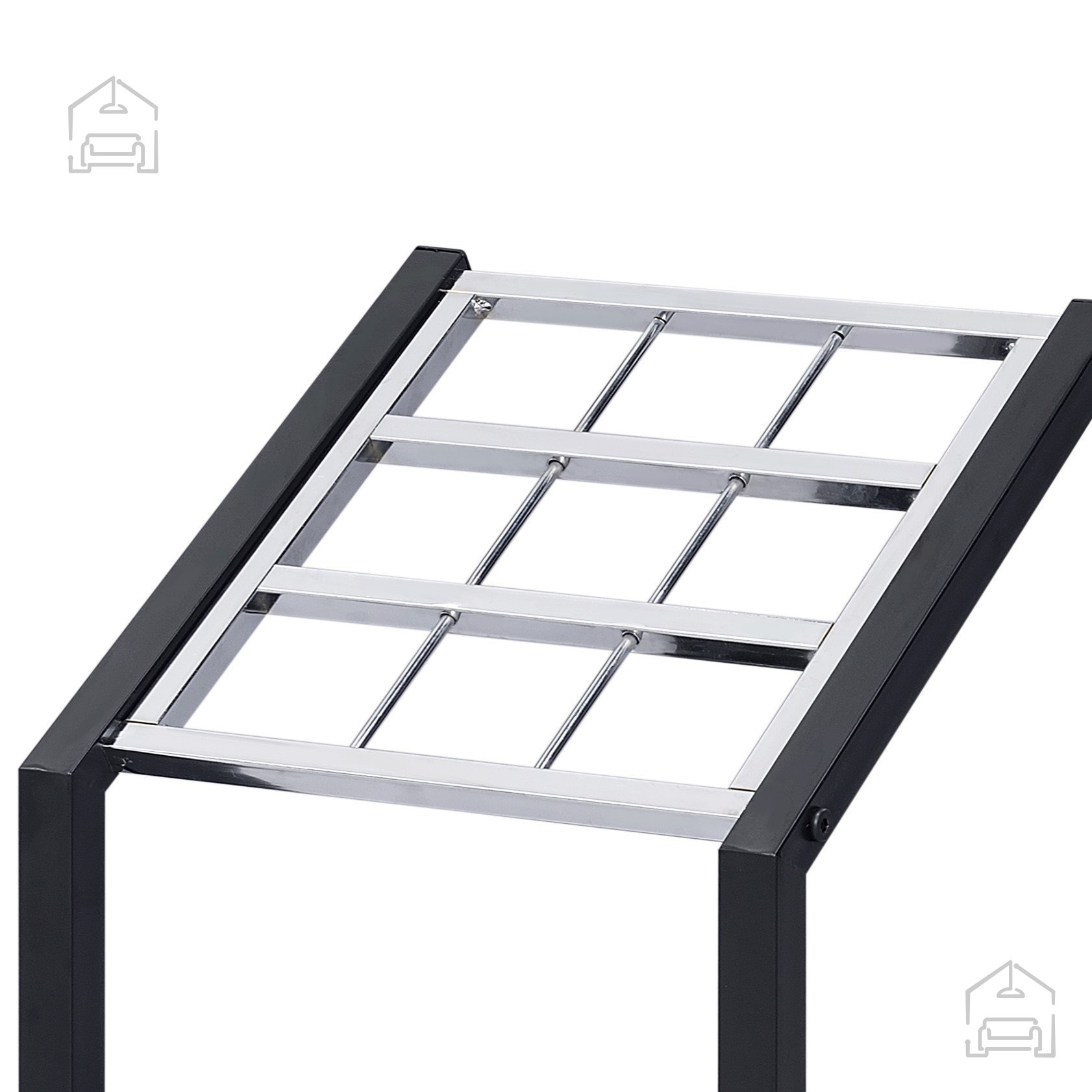 Konstrukcija stojala je zasnovana iz kovine, natančneje jeklenih cevi, ki zagotavljajo visoko stabilnost in odpornost proti vsakodnevni uporabi. Črna prašno barvana površina ščiti pred obrabo, medtem ko kromirani elementi dodajo pridih elegance in sodobnosti. Takšna kombinacija materialov omogoča, da se stojalo lepo vključi v različne stile notranje opreme – od minimalističnih do industrijskih interierjev.