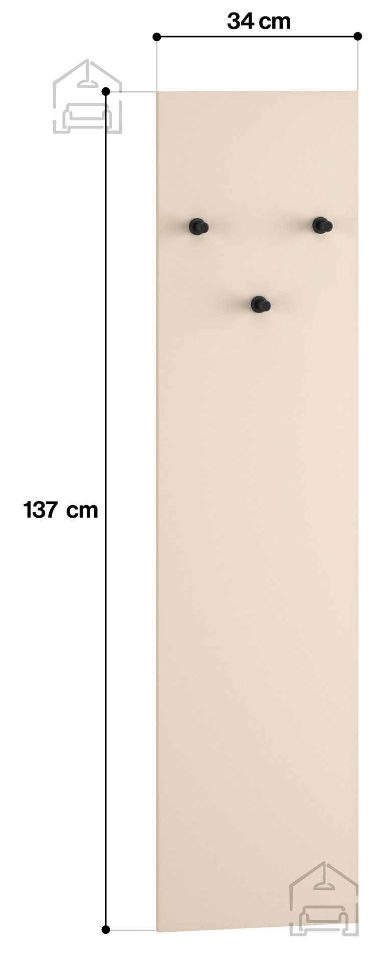 Obešalnik Sophie 18 znamke ML Meble združuje estetiko sodobnega dizajna in funkcionalnost, ki jo potrebuje vsaka predsoba. S svojo višino 137 cm, širino 34 cm in globino 2 cm je ta model idealen za manjše prostore, kjer je pomembno izkoristiti vsak centimeter, ne da bi pri tem žrtvovali eleganco. Izdelan je iz kakovostne iverne plošče, ki jo dopolnjujejo trpežni kovinski kavlji, zato je izdelek hkrati lahek in trden. Površina v nežnem odtenku kašmirja ustvarja občutek topline in prijaznosti, medtem ko ABS robovi zagotavljajo dodatno odpornost proti udarcem in vsakodnevni obrabi.