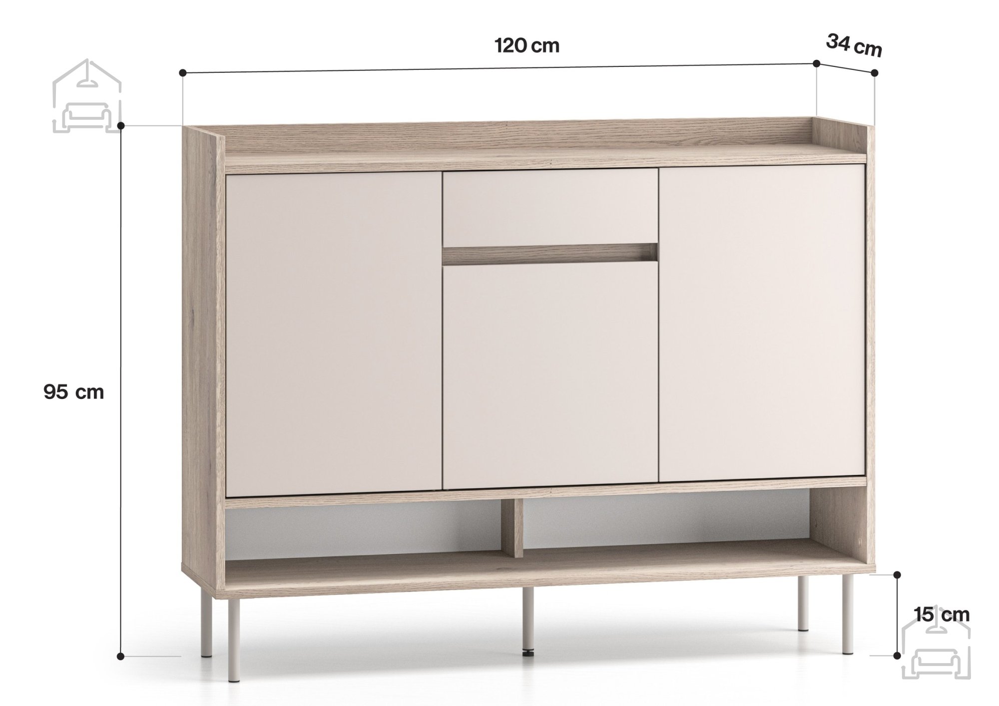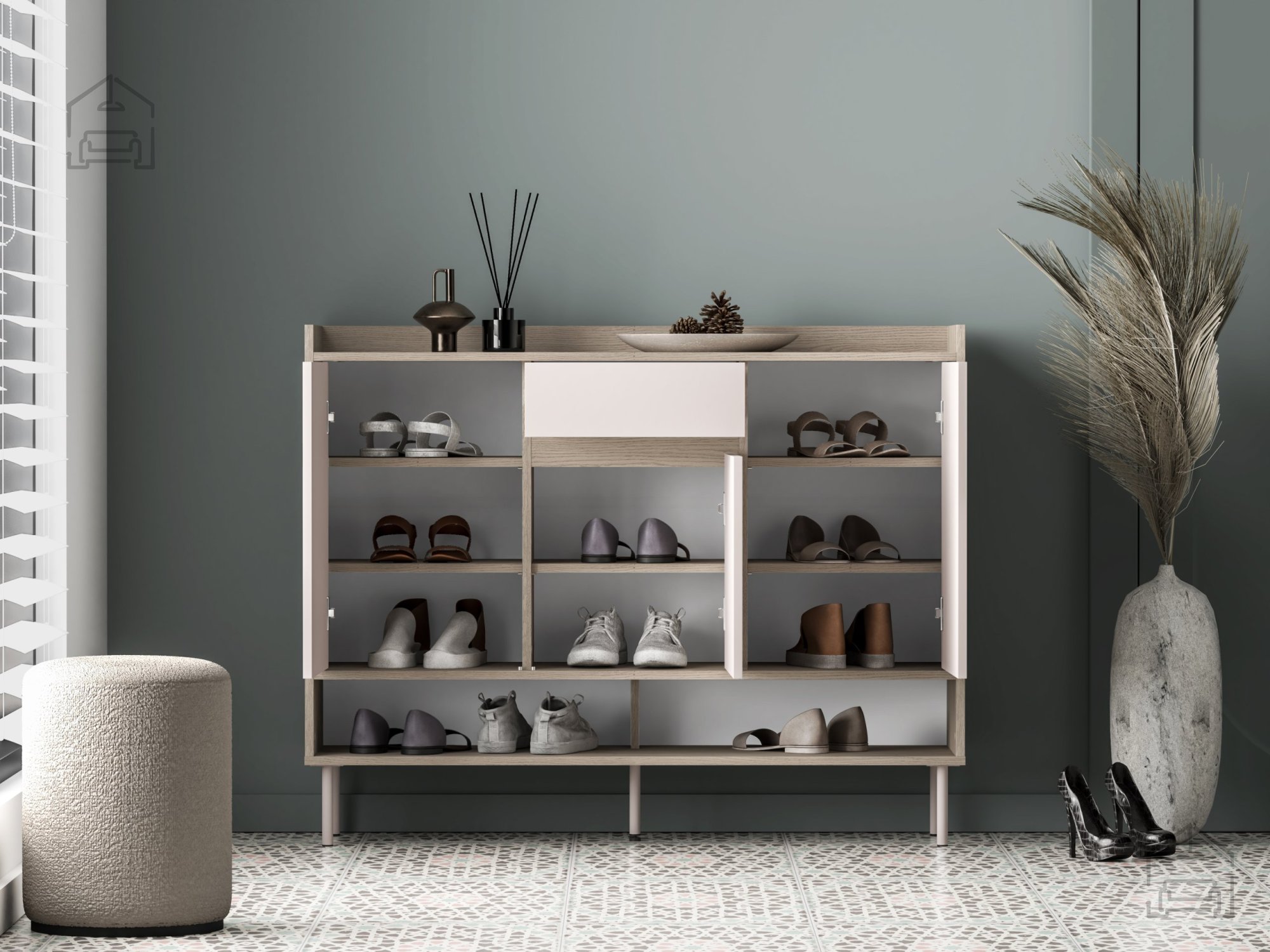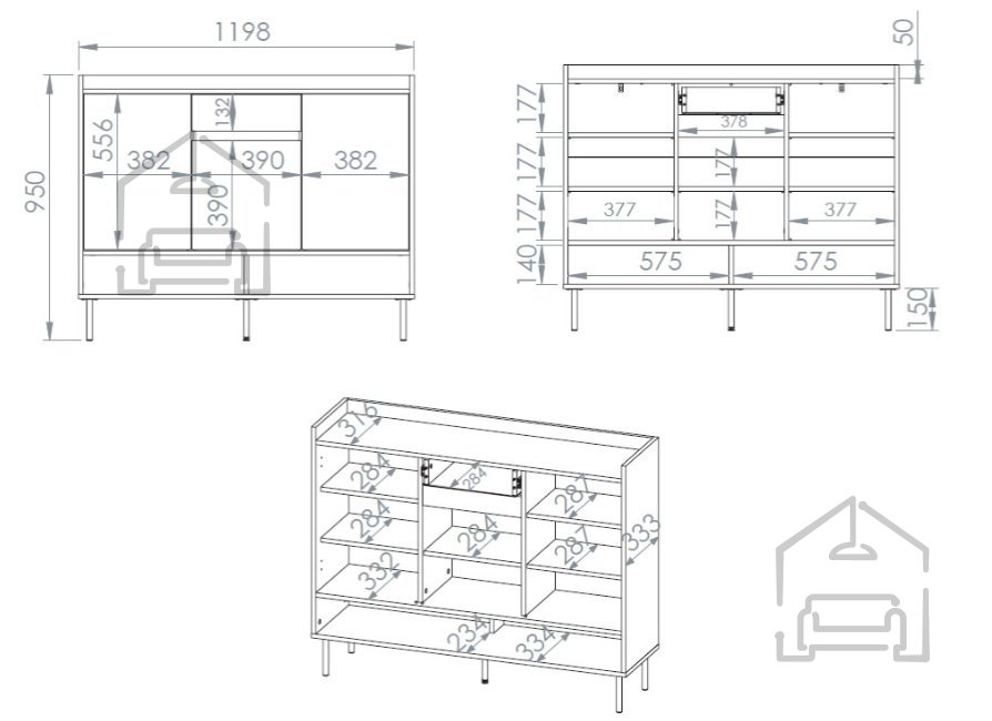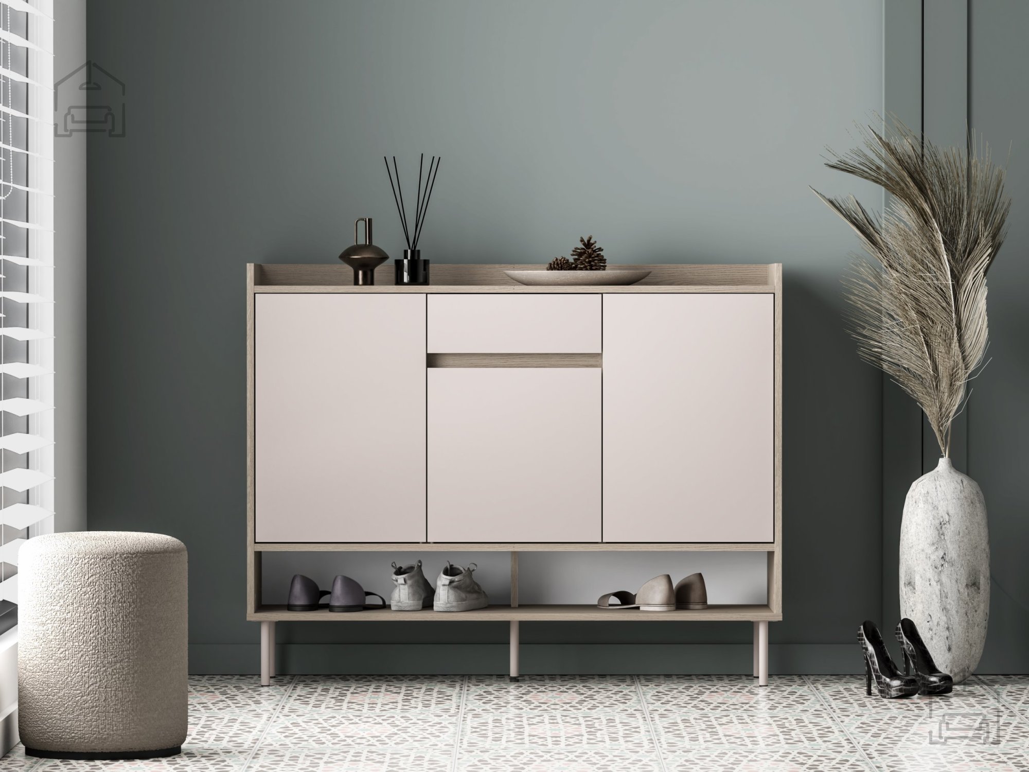 Omara za čevlje Voco 02 se ponaša z dimenzijami 120x34x95 cm, kar omogoča optimalno razmerje med prostornostjo in kompaktnostjo. Zaradi svoje širine nudi dovolj prostora za več parov čevljev, hkrati pa ne zavzame preveč prostora v predsobi. Trije enakomerno razporejeni predelki za shranjevanje omogočajo pregledno organizacijo obutve – od vsakodnevnih čevljev do elegantnih parov za posebne priložnosti.