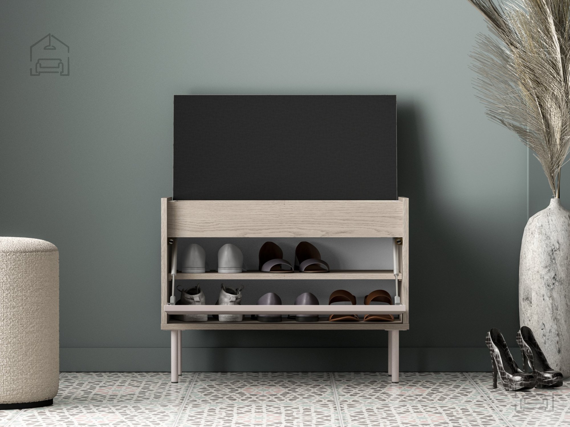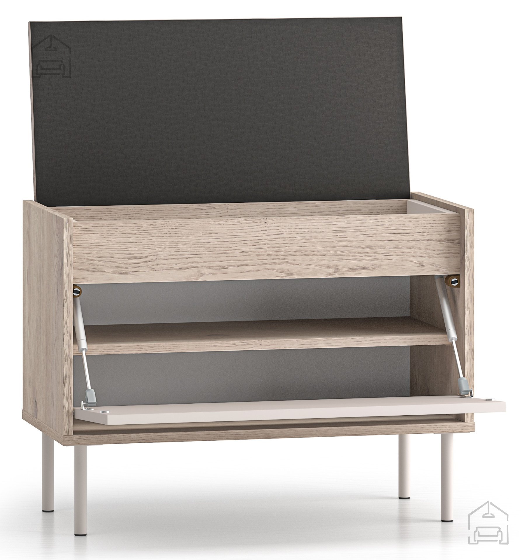 Model Voco 06 je zasnovan z mislijo na vsakodnevno uporabo in enostaven dostop do obutve. Zgornji del skriva praktičen predal, ki je primeren za shranjevanje manjših dodatkov, kot so ščetke, kreme ali copati. Spodnji del, opremljen s plinskim dvižnim mehanizmom, omogoča lahek dostop do notranjega prostora, kjer je mogoče shraniti več parov čevljev. Dvižni sistem deluje gladko in tiho, kar povečuje udobje uporabe ter zmanjšuje obrabo materialov.