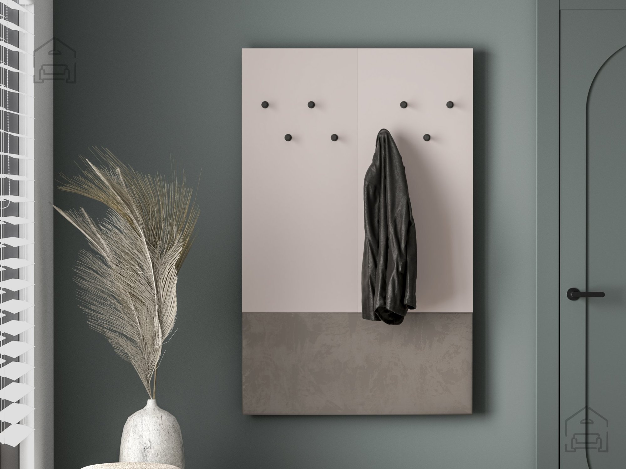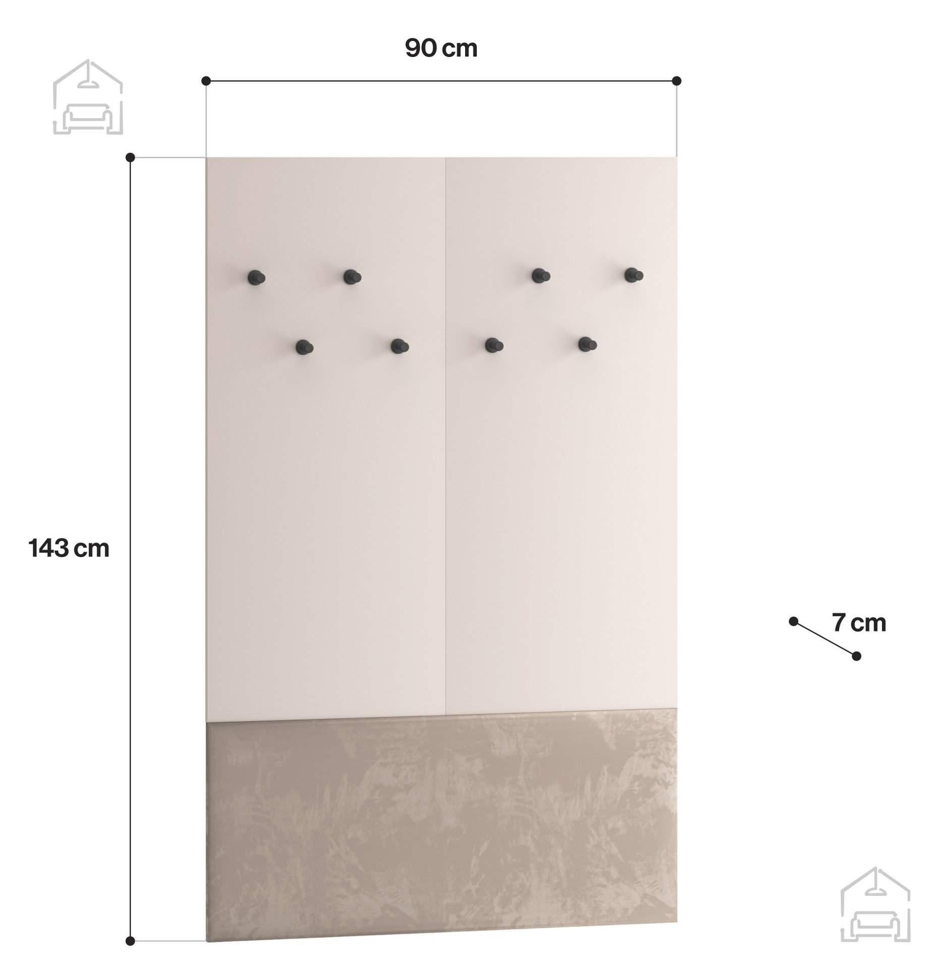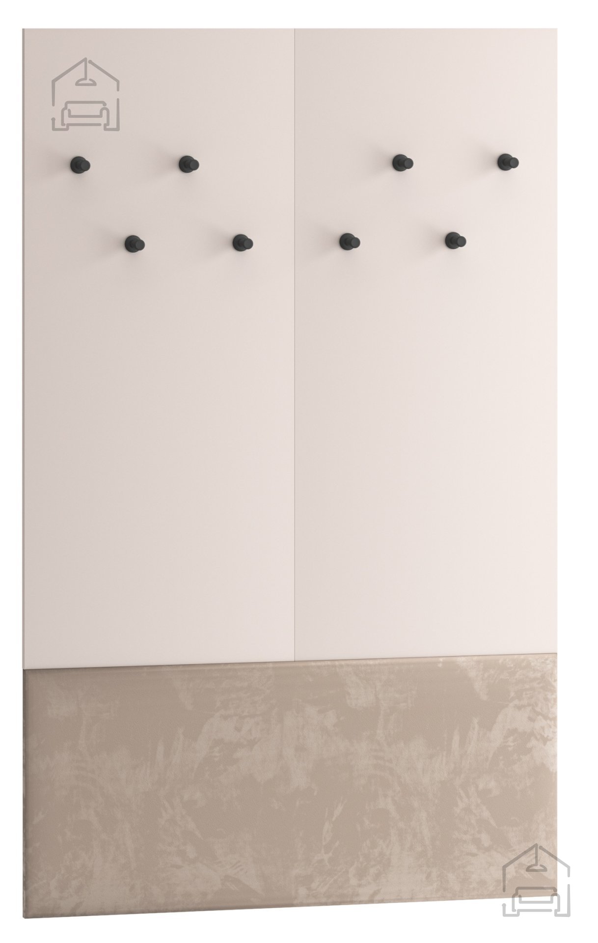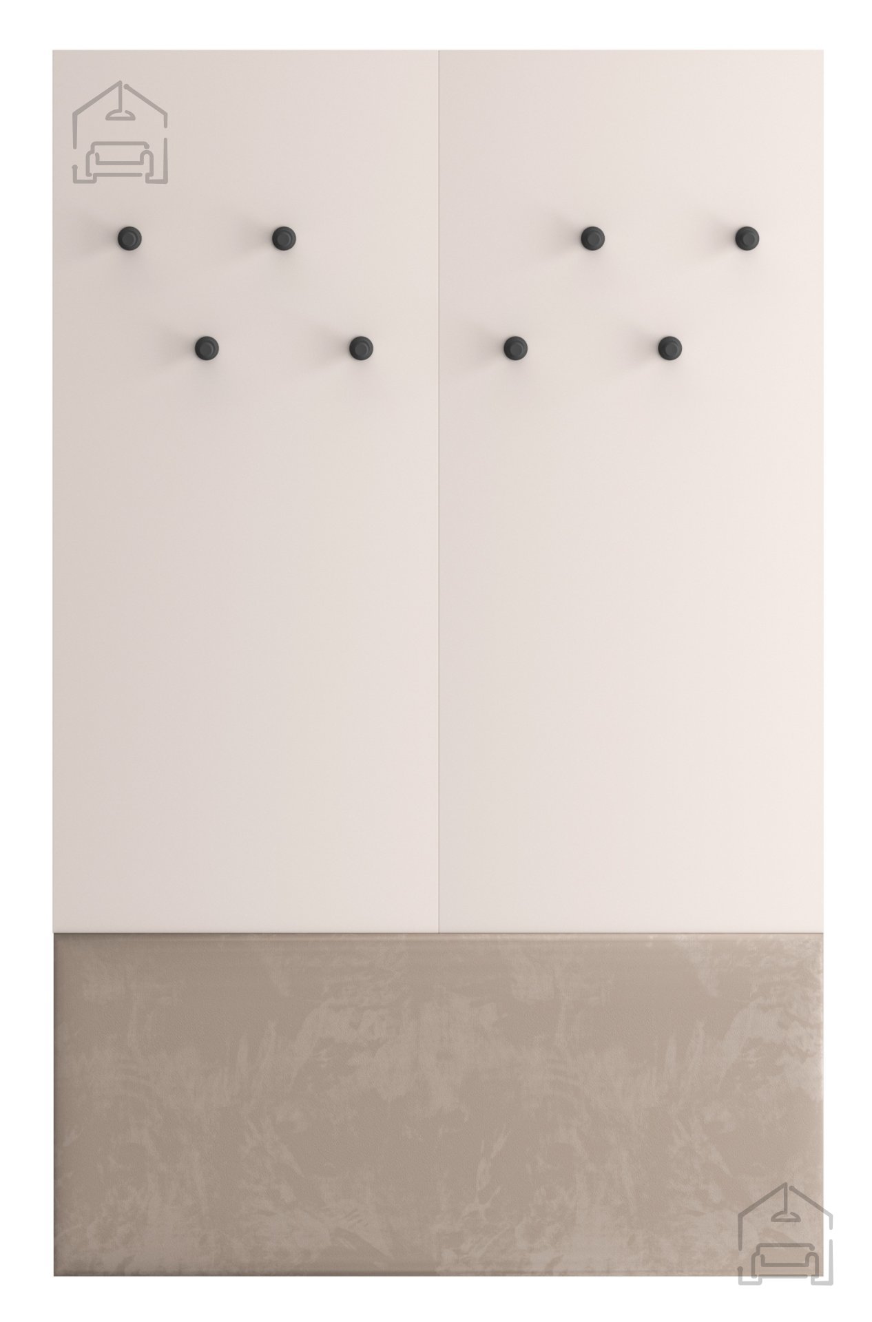 Obešalnik Voco 07 znamke ML Meble je eleganten in funkcionalen dodatek za sodobne predsobe ali garderobne prostore. Izdelan je iz kakovostne laminirane plošče debeline 16 mm, kar zagotavlja trdnost in dolgo življenjsko dobo, medtem ko žametna tkanina na površini doda pridih mehkobe in prestiža. Barvna kombinacija kašmirja in bež žameta ustvarja prijetno in toplo vzdušje, ki se zlahka ujema z drugimi kosi pohištva v domu.