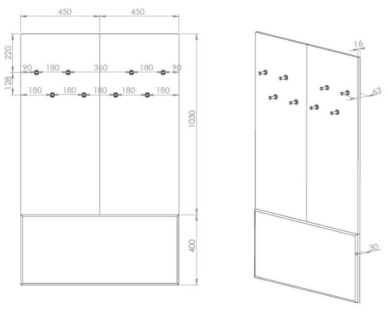 Ohišje obešalnika je izdelano iz trpežne laminirane plošče debeline 16 mm, ki je odporna na praske in vlago ter enostavna za čiščenje. ABS robovi dodatno ščitijo robove pred obrabo in mehanskimi poškodbami, kar povečuje trajnost izdelka. Sprednja površina je prevlečena z žametno tkanino, ki daje mehko in prijetno teksturo ter hkrati deluje estetsko privlačno. Takšna kombinacija materialov povezuje praktičnost in eleganco, kar je značilno za kolekcije poljskega proizvajalca ML Meble.
