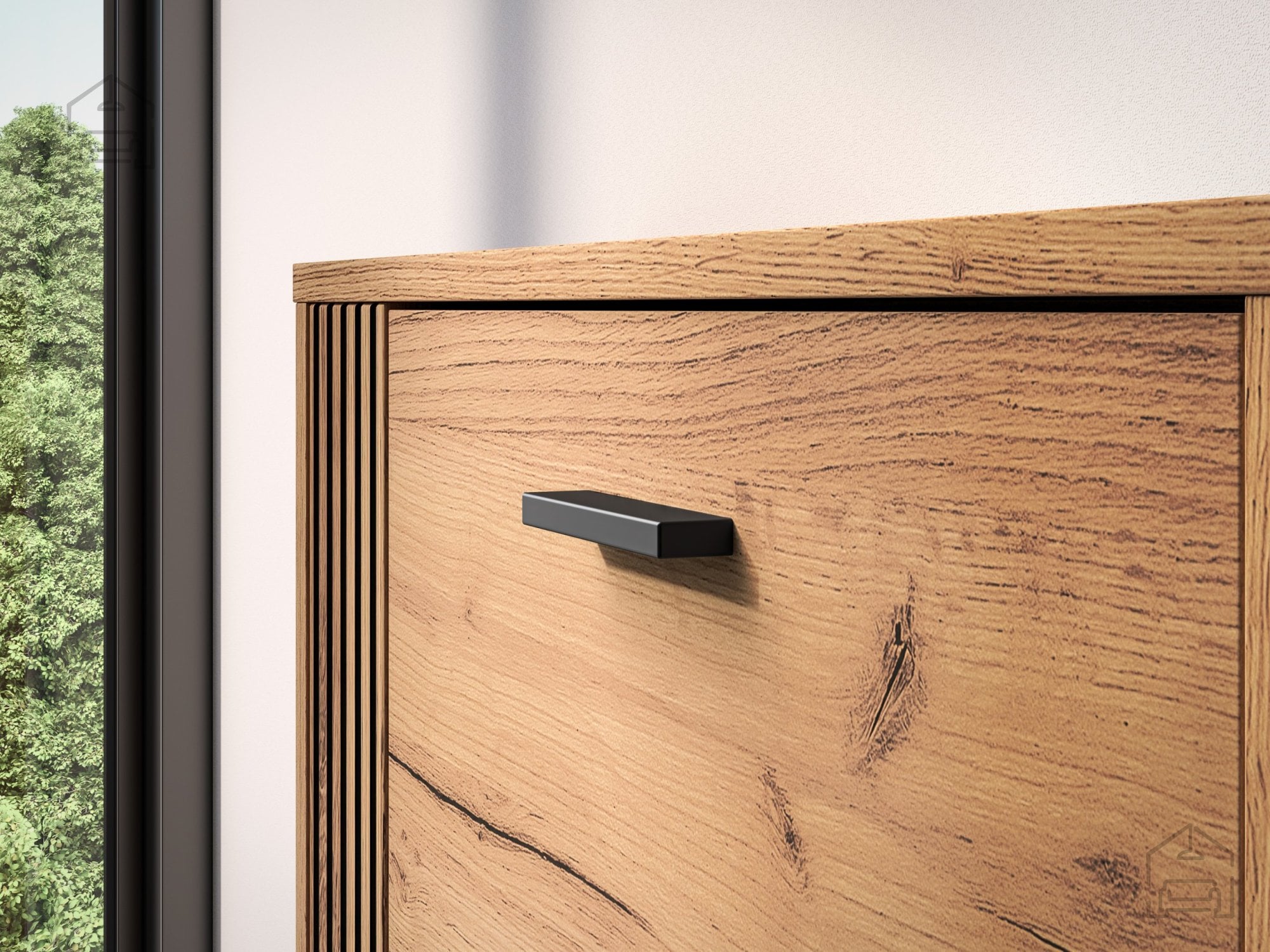 Kombinacija barv gold craft hrast in črne tvori harmoničen kontrast, ki se lepo ujema z različnimi slogi notranje opreme – od minimalističnih do industrijskih. Črne vertikalne letvice na levi strani omare ustvarjajo vizualno dinamiko ter dodajo element sodobne elegance. Takšna omara ne služi le kot funkcionalni kos pohištva, ampak tudi kot dekorativni poudarek v prostoru.