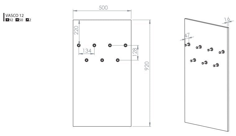 Obešalnik Vasco 12 je zasnovan tako, da omogoča urejeno shranjevanje oblačil, torb in drugih vsakodnevnih predmetov. Zaradi ozke globine 2 cm se lepo prilega steni, ne da bi zavzemal veliko prostora. Višina 92 cm omogoča udoben dostop do kljuk in obešalnih mest, širina 50 cm pa ponuja dovolj prostora za več kosov oblačil hkrati. Ta model se odlično ujema z drugimi elementi iz kolekcije Vasco, kar omogoča enoten videz notranje opreme.