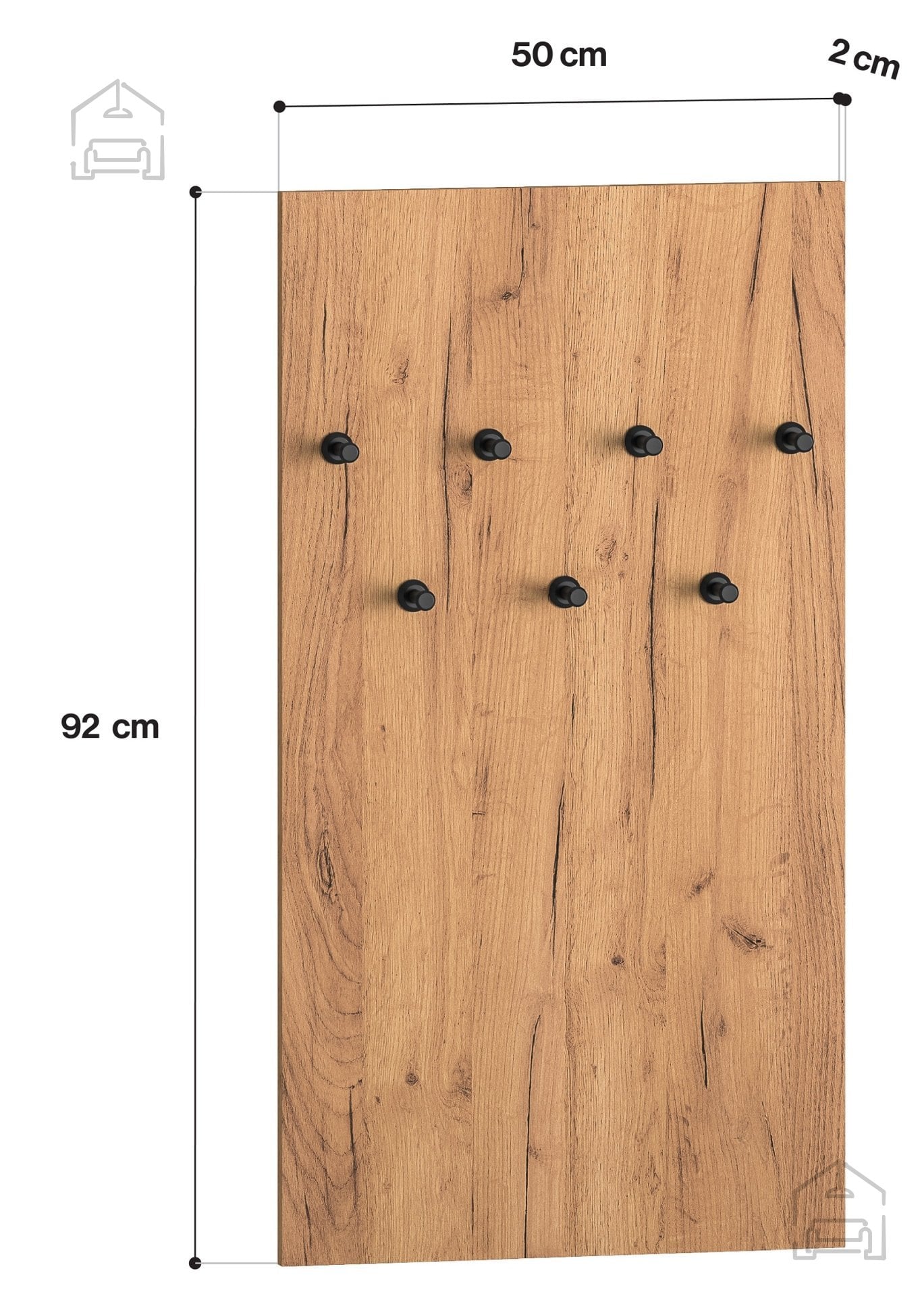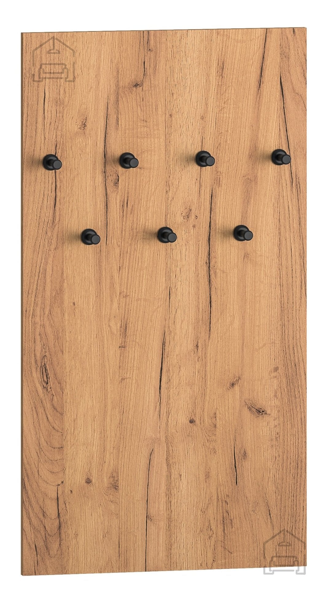 Izdelava iz iverne plošče prinaša stabilnost in enostavno vzdrževanje. Površina v odtenku gold craft hrast ustvarja občutek topline in naravnosti, medtem ko črna barva dodaja sodoben, industrijski pridih. Takšna kombinacija se lepo poda tako k svetlim kot tudi k temnejšim stenam, zato se obešalnik zlahka vključi v različne stile notranje opreme – od skandinavskega minimalizma do modernih urbanih prostorov.