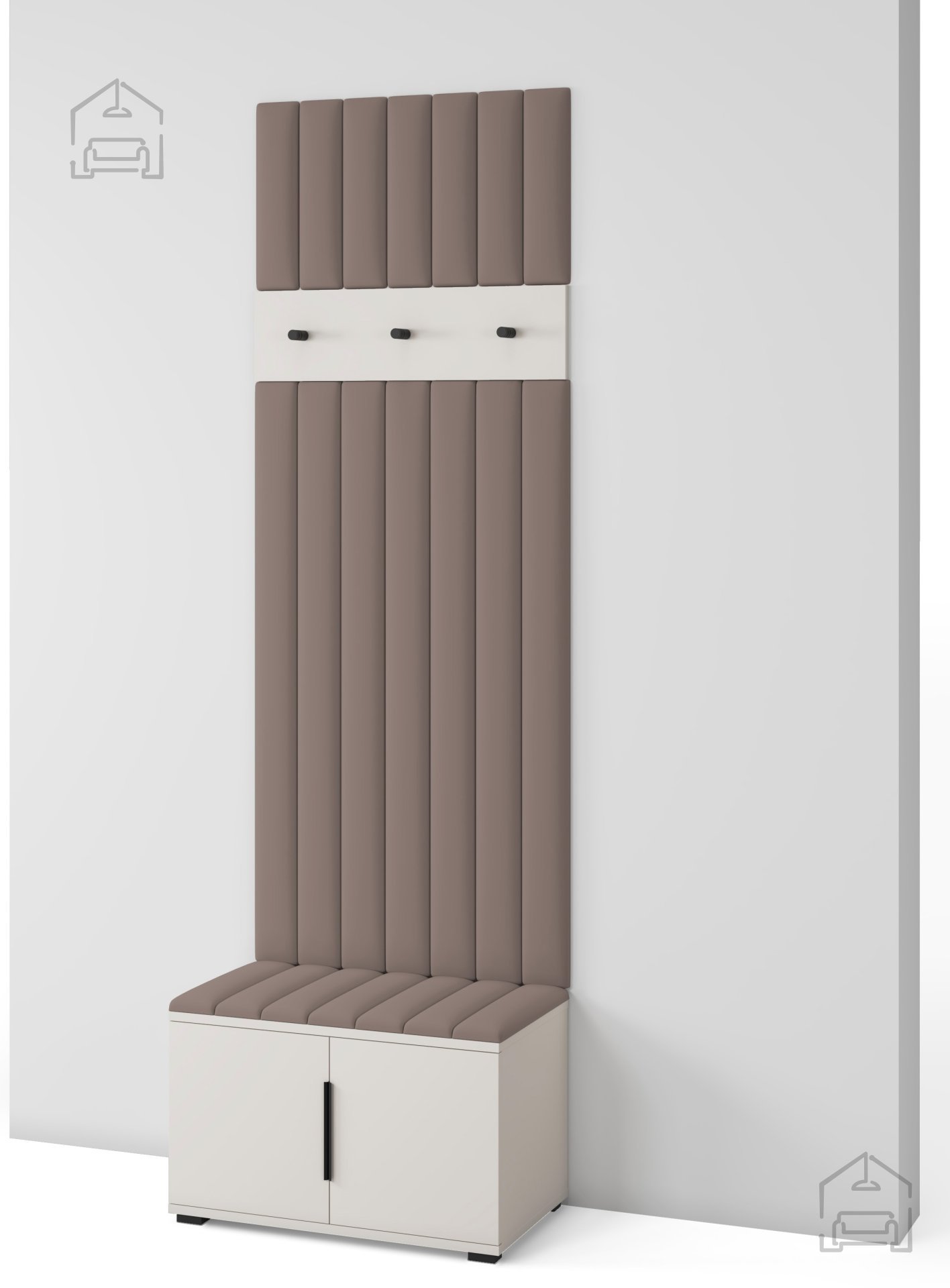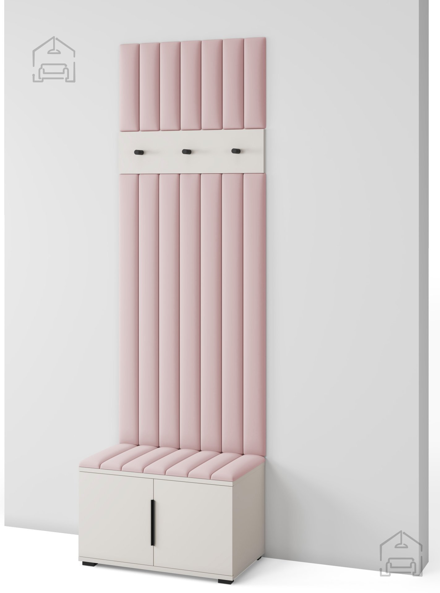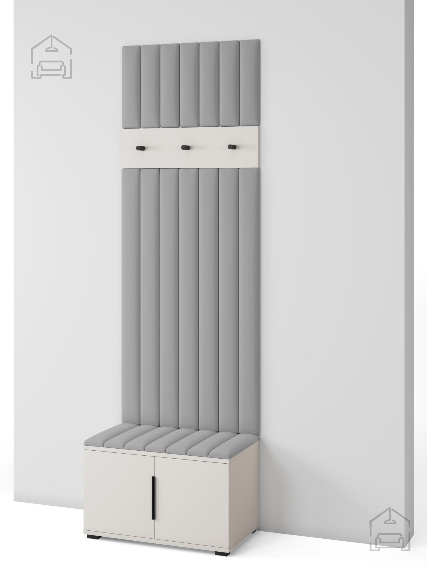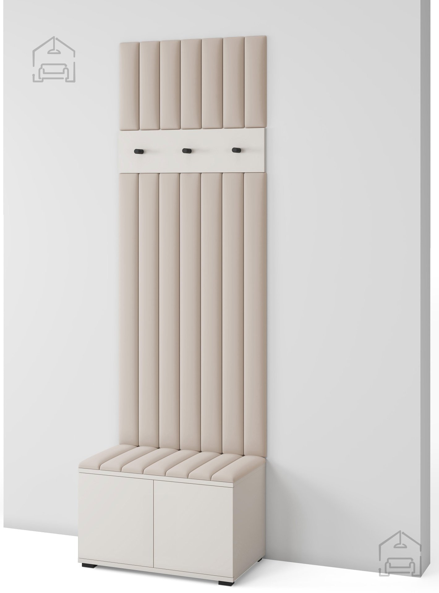 Komplet za hodnik Bianco 16 – PKMebel je premišljena izbira za vse, ki cenijo urejenost, funkcionalnost in eleganten videz. Poljska izdelava zagotavlja kakovost, barva kašmir pa poskrbi, da prostor deluje toplo in vabljivo. S kombinacijo garderobnega modula, obešalnika in oblazinjenih plošč je ta komplet popolna rešitev za sodoben dom, kjer je vsaka podrobnost pomembna.