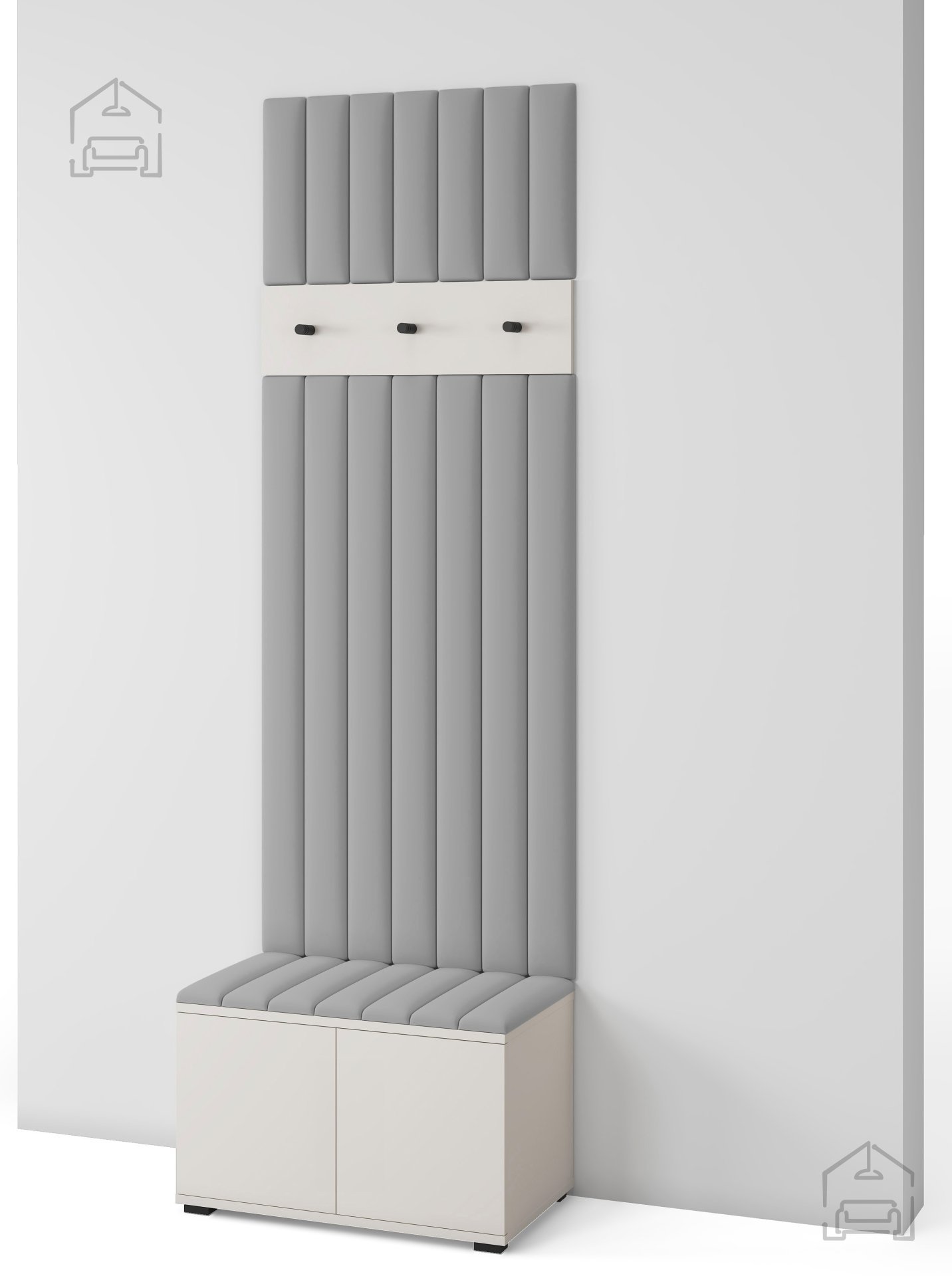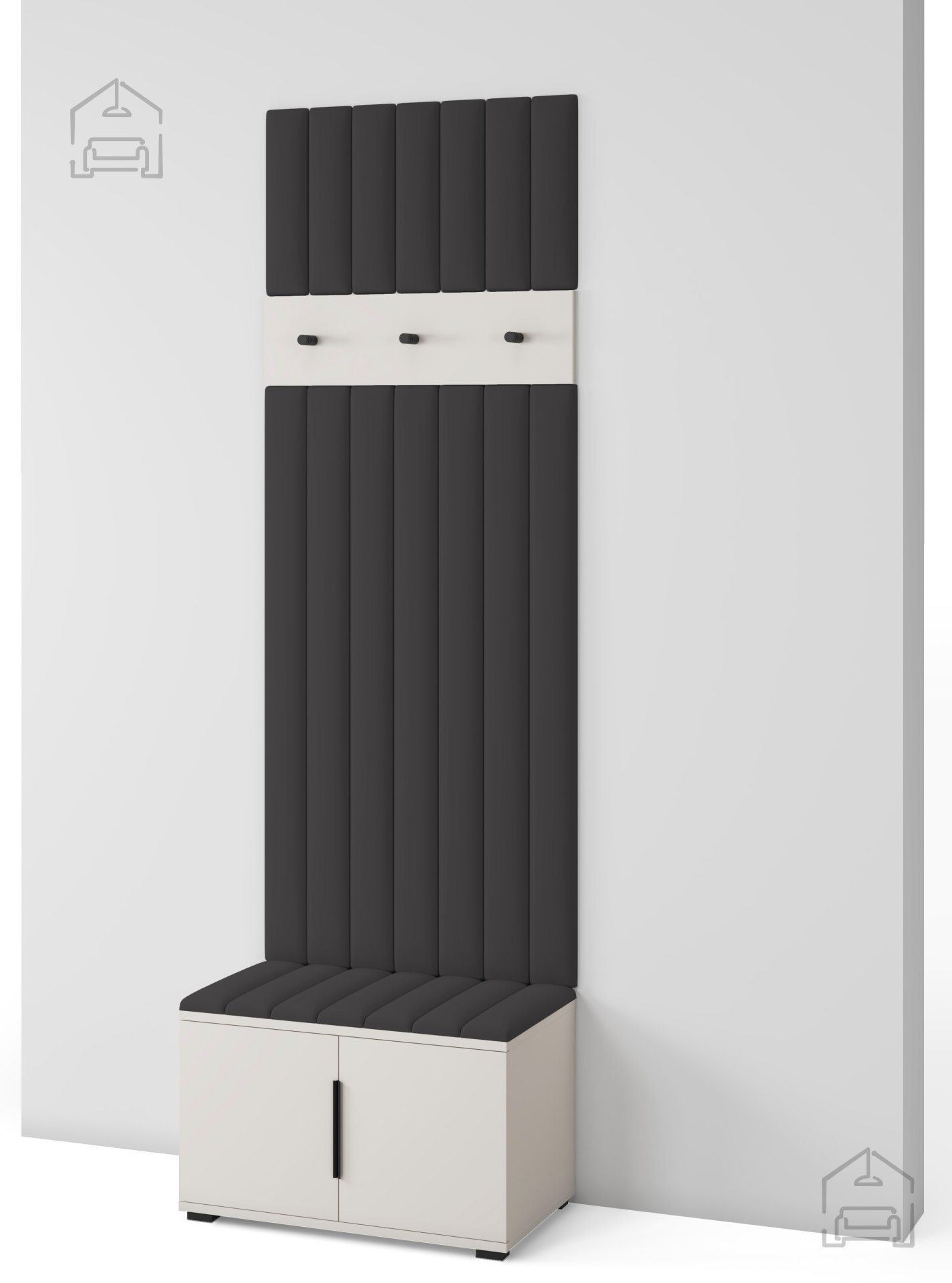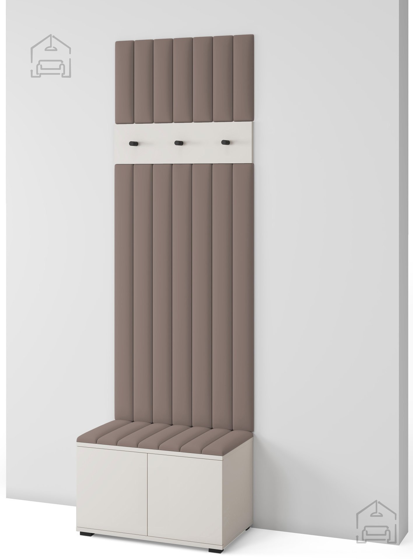 Komplet za hodnik Bianco 16 – PKMebel je premišljena izbira za vse, ki cenijo urejenost, funkcionalnost in eleganten videz. Poljska izdelava zagotavlja kakovost, barva kašmir pa poskrbi, da prostor deluje toplo in vabljivo. S kombinacijo garderobnega modula, obešalnika in oblazinjenih plošč je ta komplet popolna rešitev za sodoben dom, kjer je vsaka podrobnost pomembna.