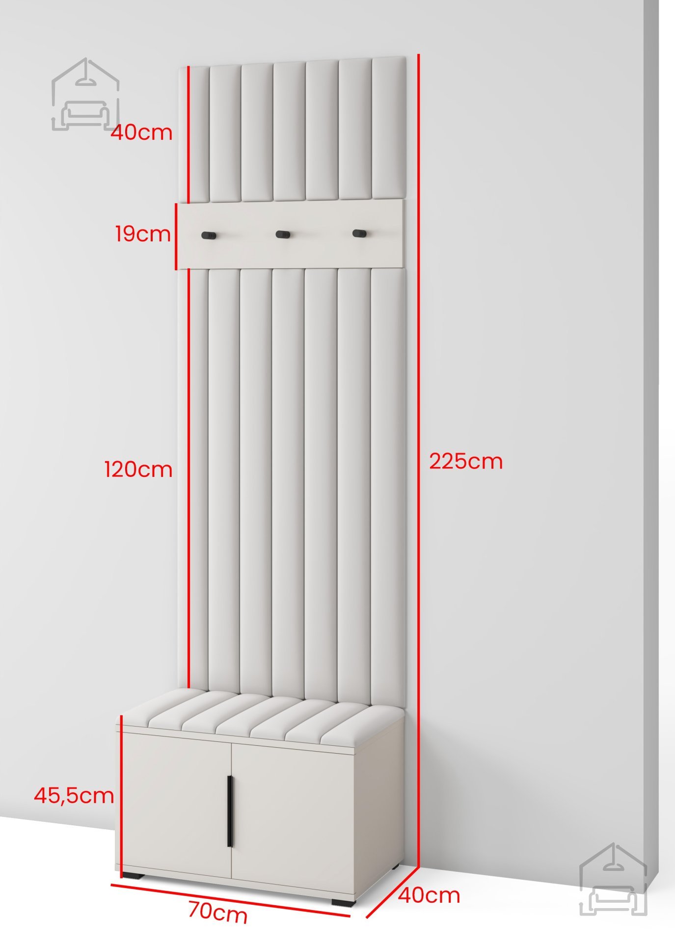 Dimenzije 70x40x225 cm omogočajo, da komplet enostavno postavite v različne tipe hodnikov – od ozkih in dolgih do bolj kvadratnih. Modularna sestava omogoča tudi določeno prilagoditev postavitve posameznih elementov. Zaradi uravnoteženih mer in svetle barve komplet vizualno ne obremenjuje prostora, temveč ga optično poveča.