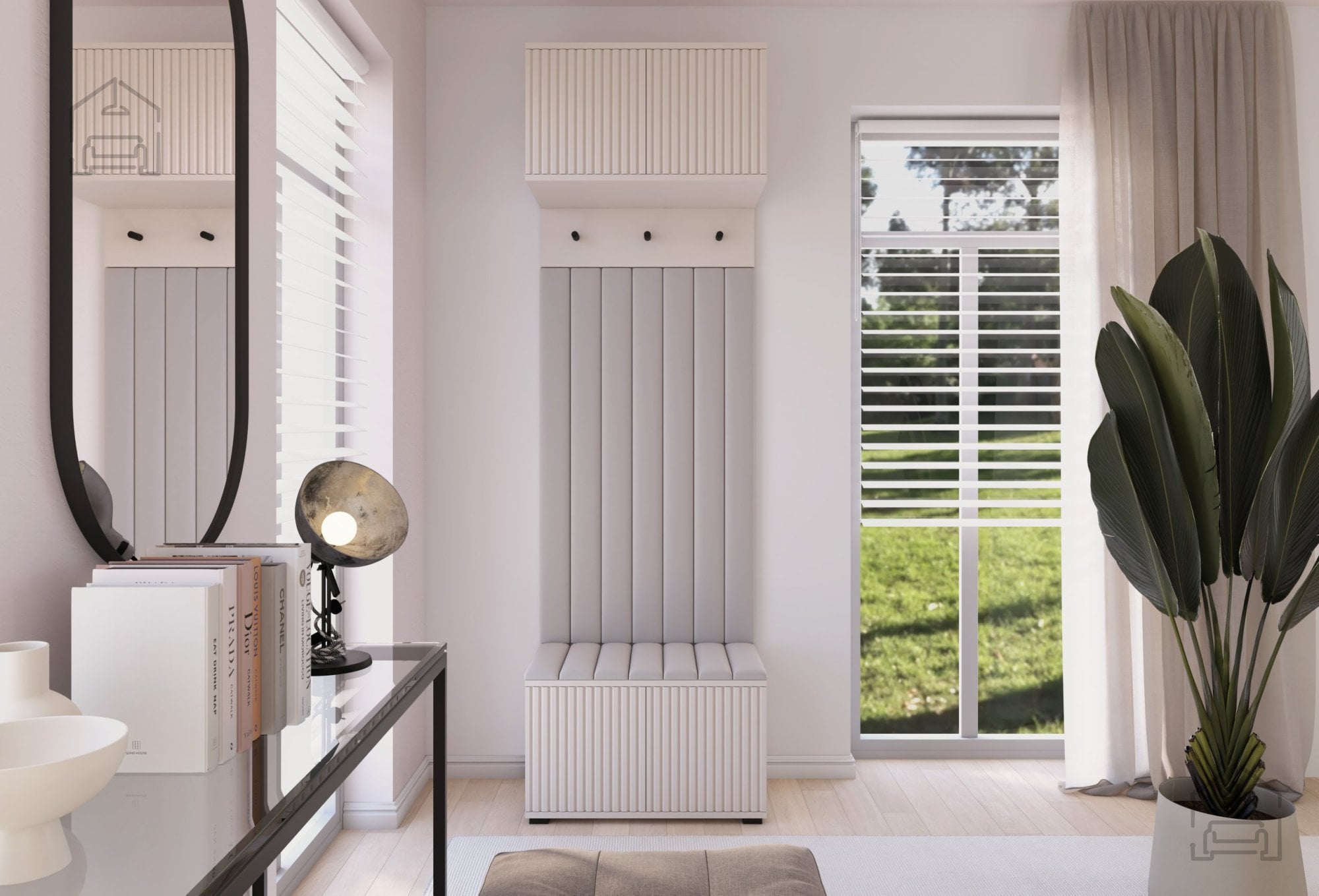 Oblazinjeni paneli v tkanini Trinity 02 dopolnjujejo izgled in hkrati prispevajo k večjemu udobju. Poleg estetske vrednosti zagotavljajo tudi zvočno izolacijo, saj mehka površina blaži odboje zvoka. Panele se pritrdi neposredno na steno ali na omarico s pomočjo lepila, kar omogoča hitro in čisto montažo brez vidnih pritrdilnih elementov.