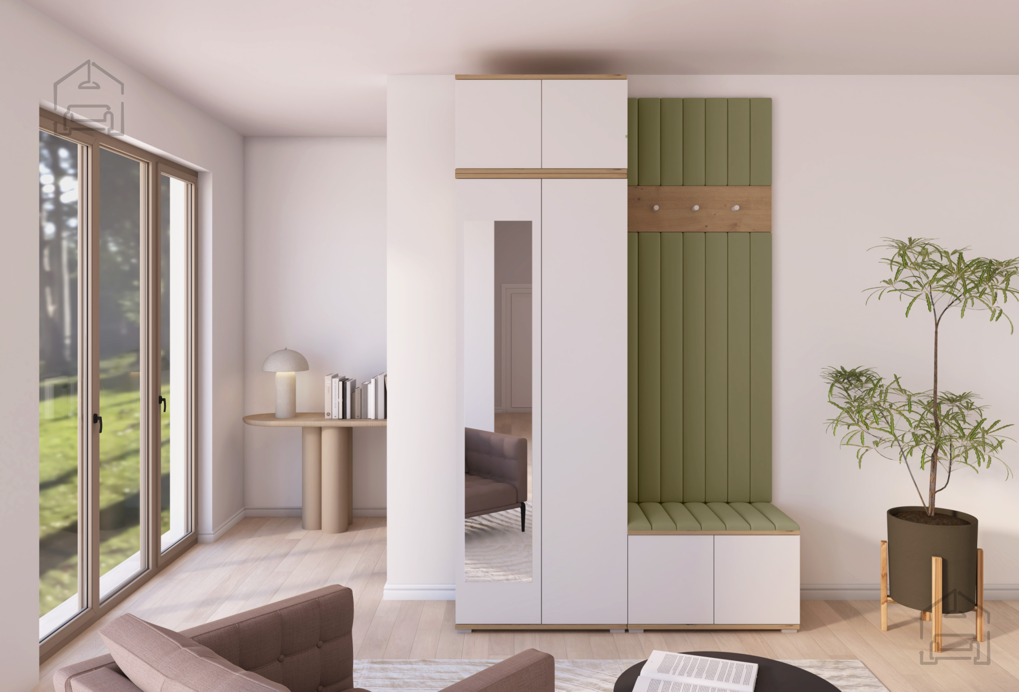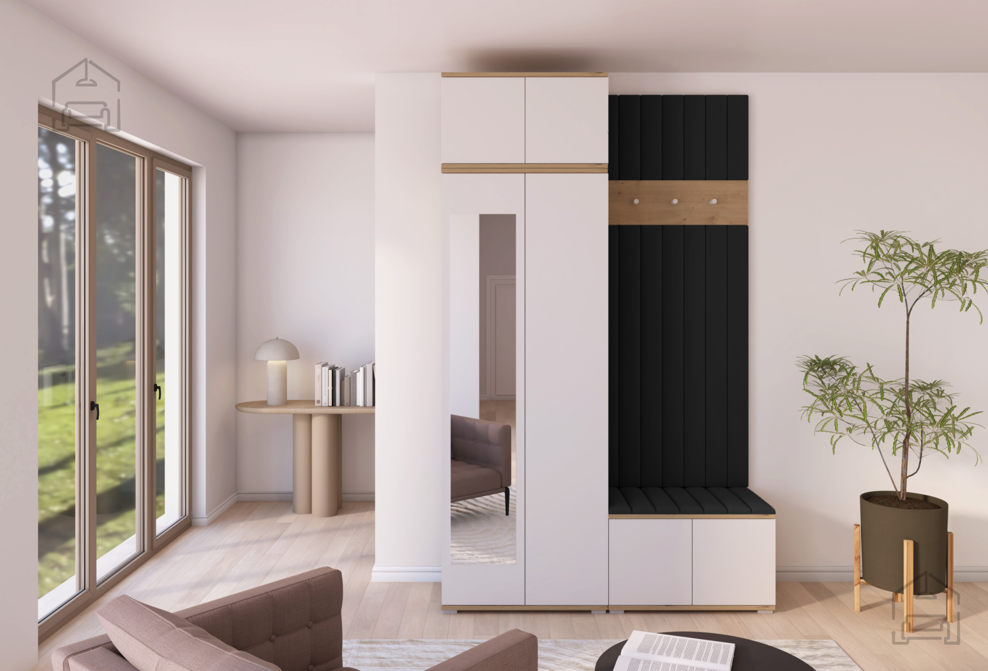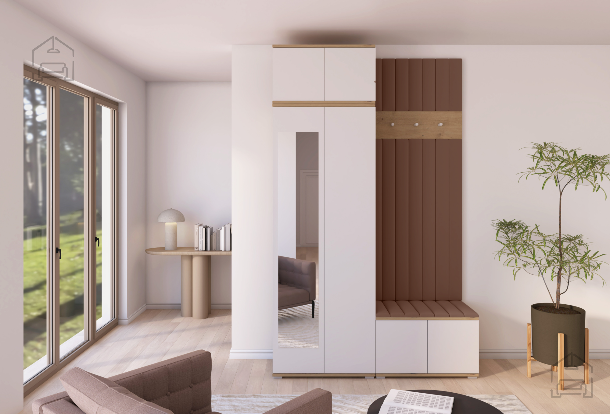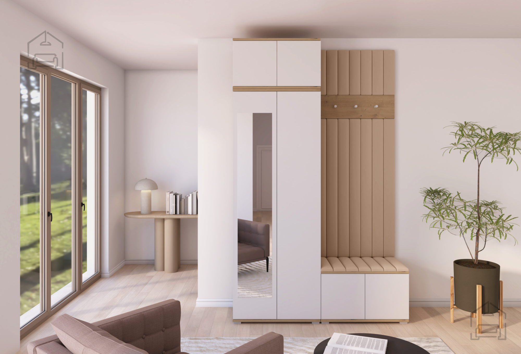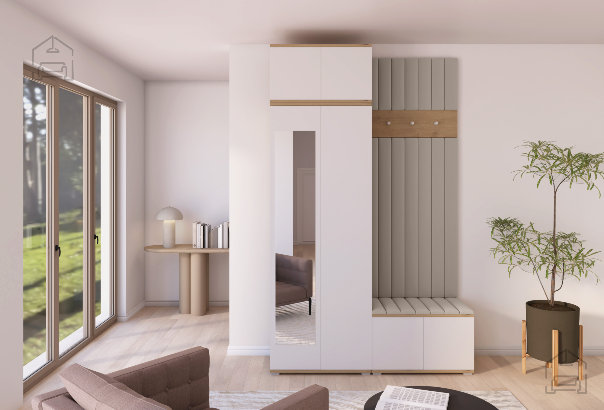 Vsak del kompleta je zasnovan z mislijo na vsakodnevno uporabo. Obešalniki nudijo dovolj prostora za zgornja oblačila, omara pa pomaga ohranjati red in čistočo. Sedežni del poveča udobje pri obuvanju, medtem ko sistem odpiranja na pritisk omogoča hitro in enostavno uporabo brez potrebe po klasičnih ročajih. Tak pristop ne le poenostavi čiščenje, temveč tudi ohranja čist, minimalističen videz pohištva.