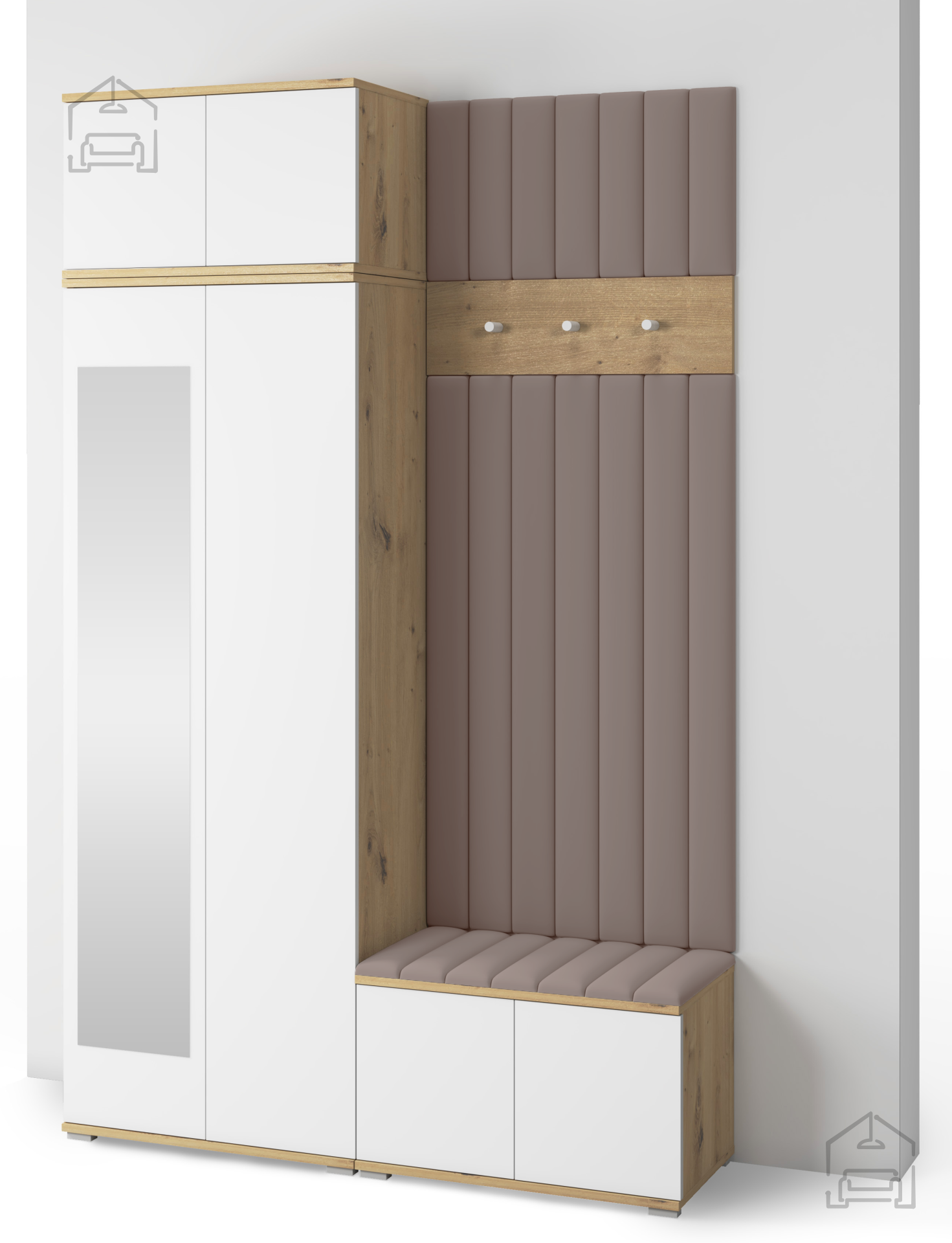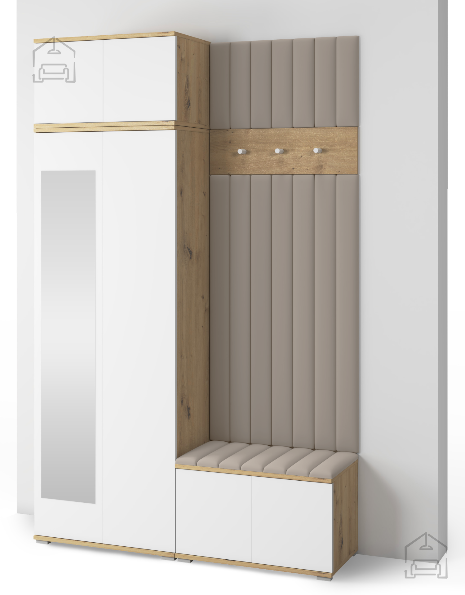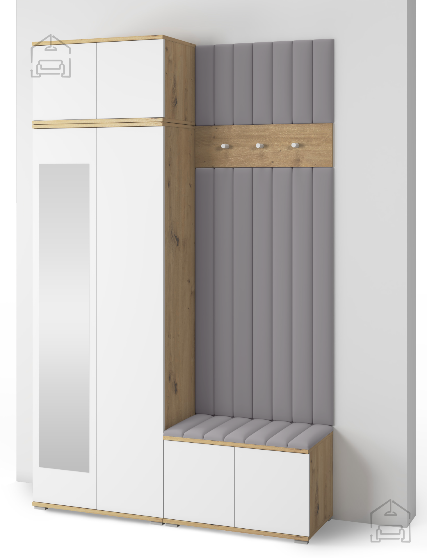 Korpus v odtenku hrasta artisan poudari naravni značaj prostora, medtem ko bele fronte vizualno razširijo hodnik in mu dodajo svežino. Minimalističen videz brez ročajev, ki ga omogoča sistem odpiranja na pritisk, prispeva k sodobni estetiki in enostavni uporabi. Za stabilnost in lahkotnost konstrukcije skrbijo plastične nogice v srebrni barvi, visoke 2 cm, ki hkrati omogočajo lažje čiščenje tal pod pohištvom.