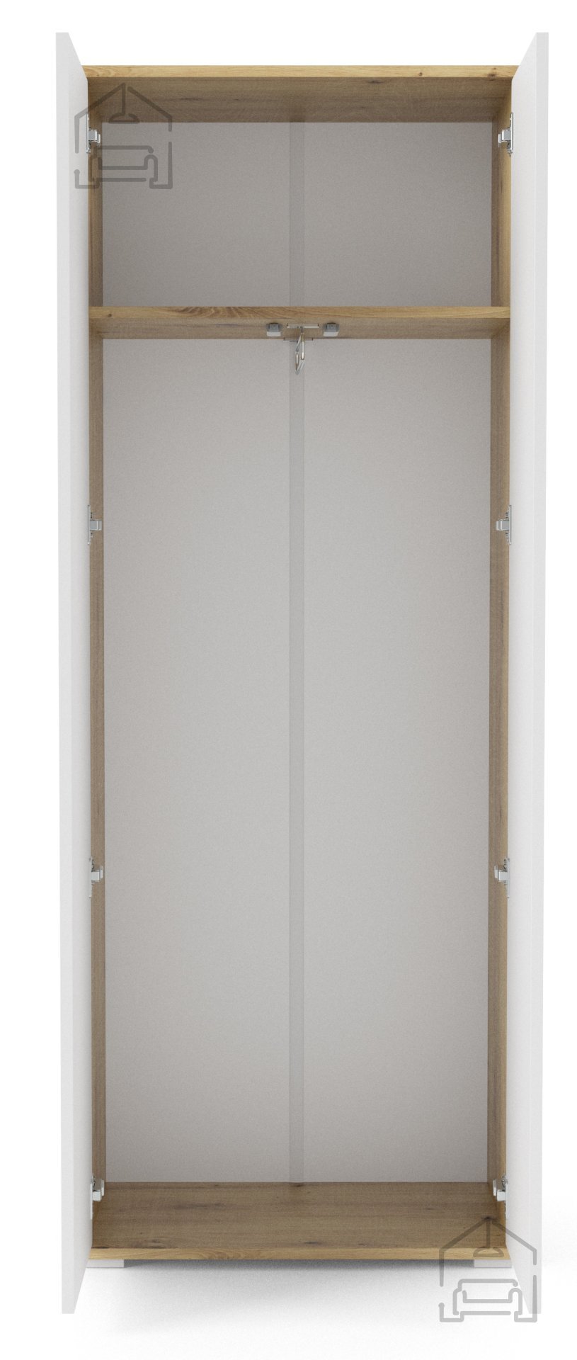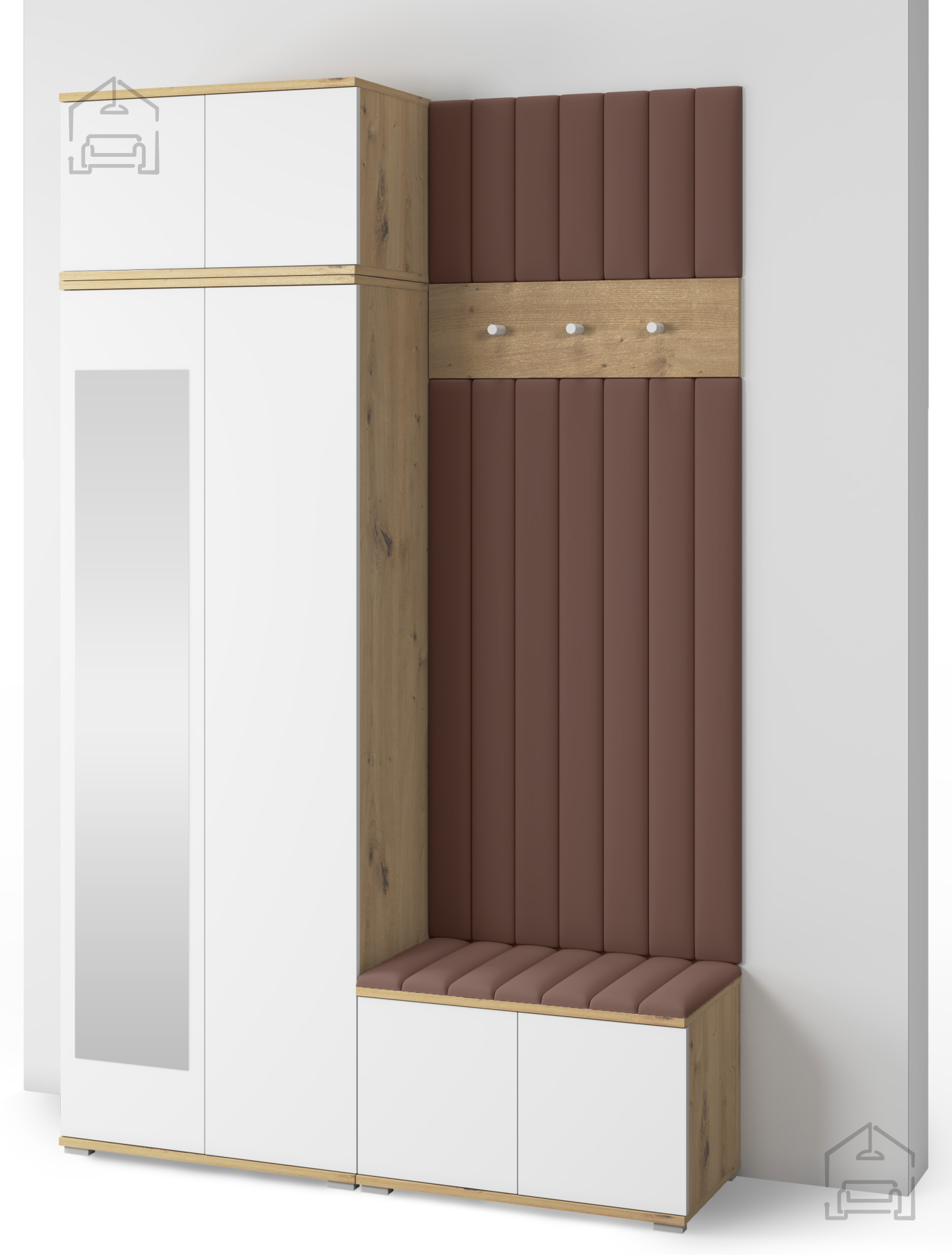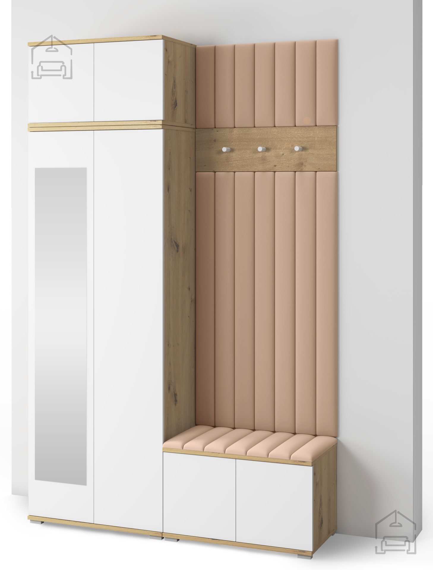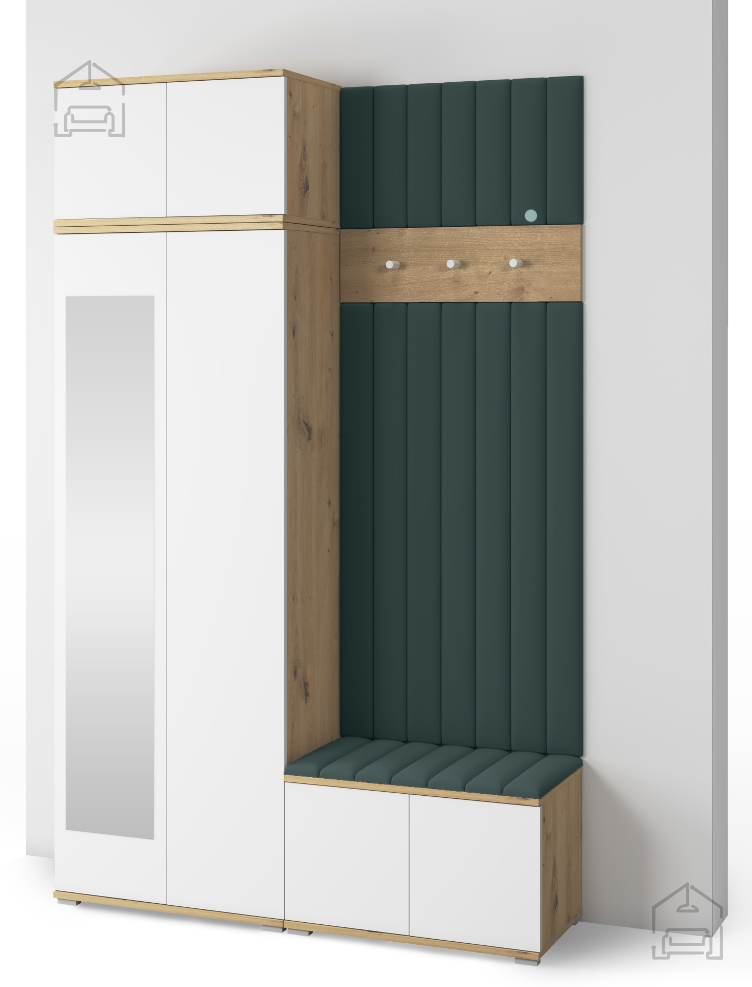 Korpus v odtenku hrasta artisan poudari naravni značaj prostora, medtem ko bele fronte vizualno razširijo hodnik in mu dodajo svežino. Minimalističen videz brez ročajev, ki ga omogoča sistem odpiranja na pritisk, prispeva k sodobni estetiki in enostavni uporabi. Za stabilnost in lahkotnost konstrukcije skrbijo plastične nogice v srebrni barvi, visoke 2 cm, ki hkrati omogočajo lažje čiščenje tal pod pohištvom.