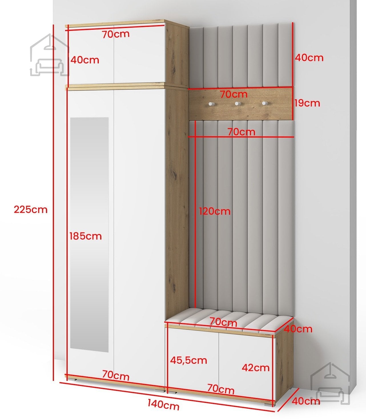 Celotni komplet s svojimi 140x40x225 cm dimenzijami omogoča optimalno prilagoditev različnim tlorisom hodnikov. Omogoča postavitev ob glavni steni, kjer lahko vse komponente delujejo kot celota, ali modularno razporeditev posameznih delov po potrebi prostora. Višina 225 cm zagotavlja dovolj prostora za obešanje daljših oblačil, medtem ko širina in globina nudita dovolj shranjevalnih površin, ne da bi vizualno obremenili prostor.
