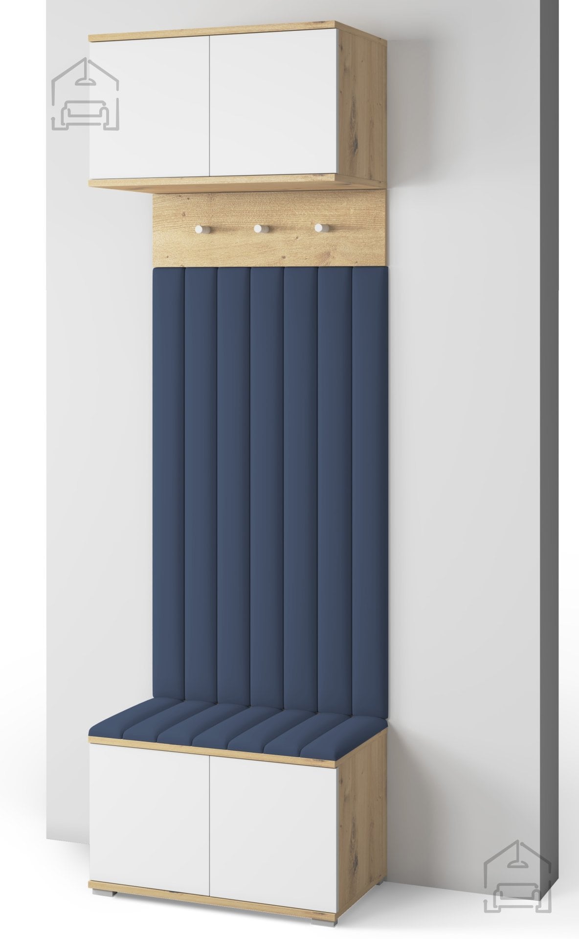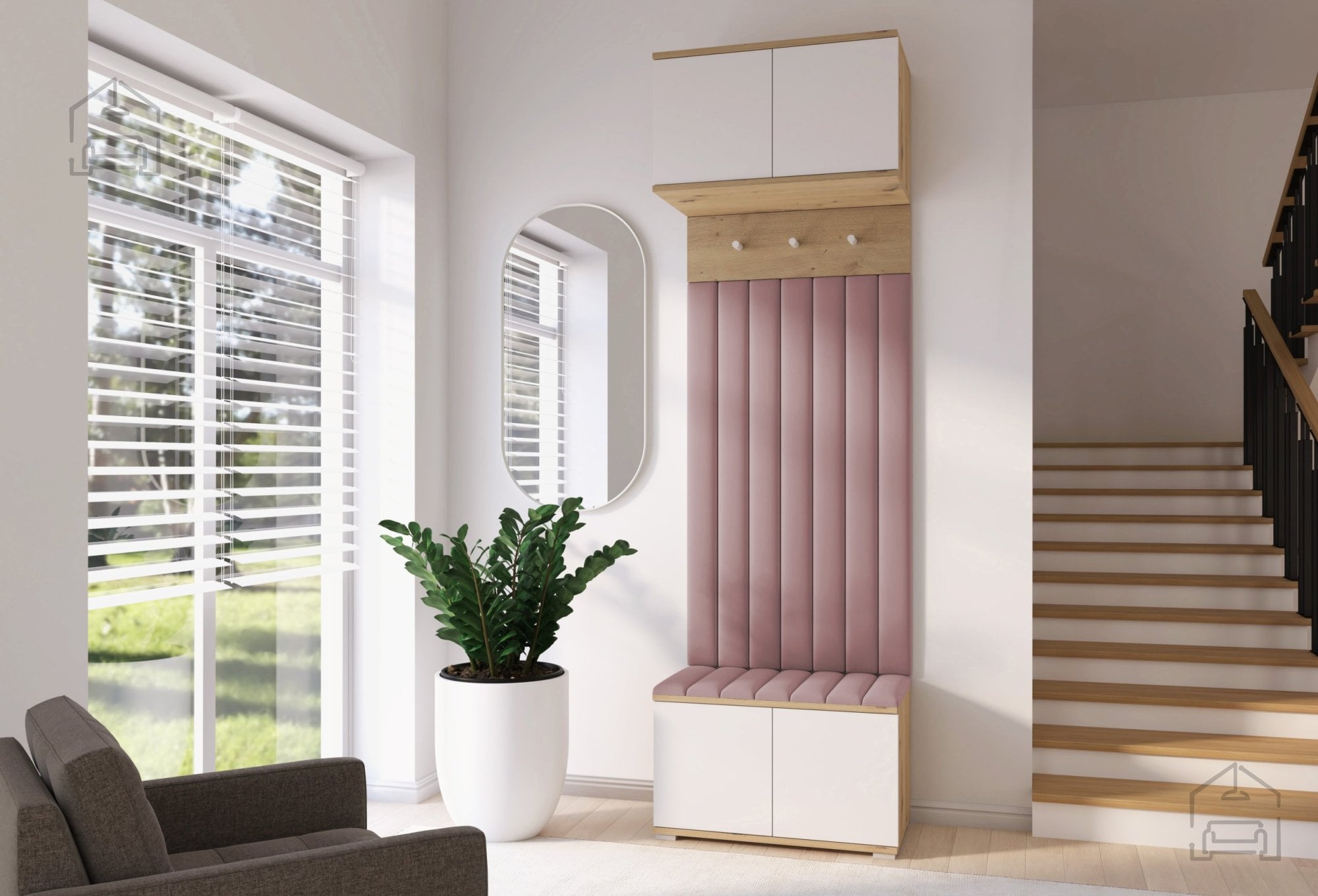 Kombinacija hrasta artisan in bele barve ustvarja uravnotežen kontrast, ki se lepo poda k številnim slogom opreme – od minimalističnega do skandinavskega ali modernega. Bela barva vizualno poveča prostor, medtem ko topli toni hrasta prinašajo občutek domačnosti. Oblazinjene plošče dodajo teksturo in vizualno razgibanost, zato komplet ni le praktičen, temveč tudi dekorativen element prostora.
