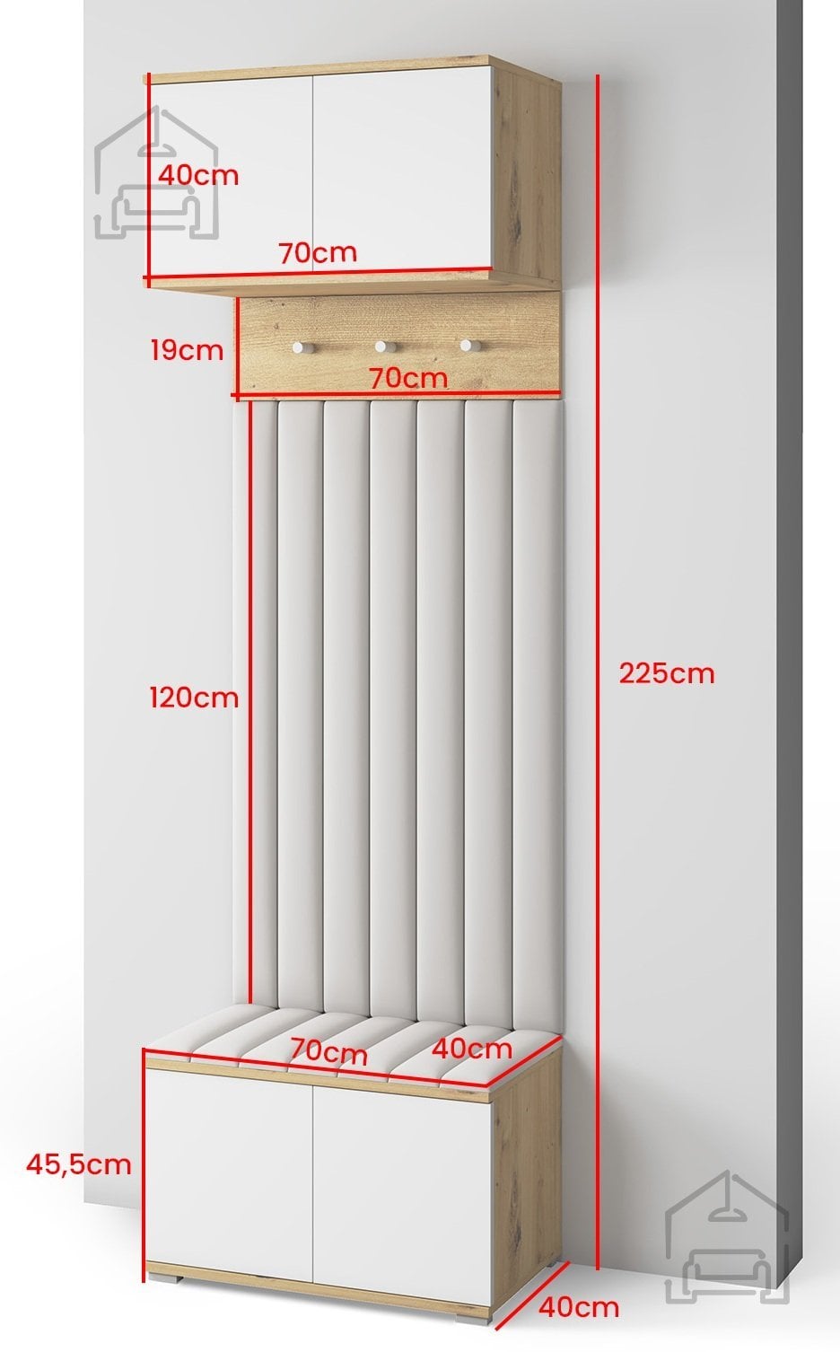 Dimenzije so zasnovane tako, da omogočajo učinkovito izrabo prostora, ne glede na velikost hodnika. Višina 225 cm omogoča dovolj prostora za shranjevanje, globina 40 cm pa zagotavlja, da komplet ne zavzame preveč prostora v prehodnem delu doma.
