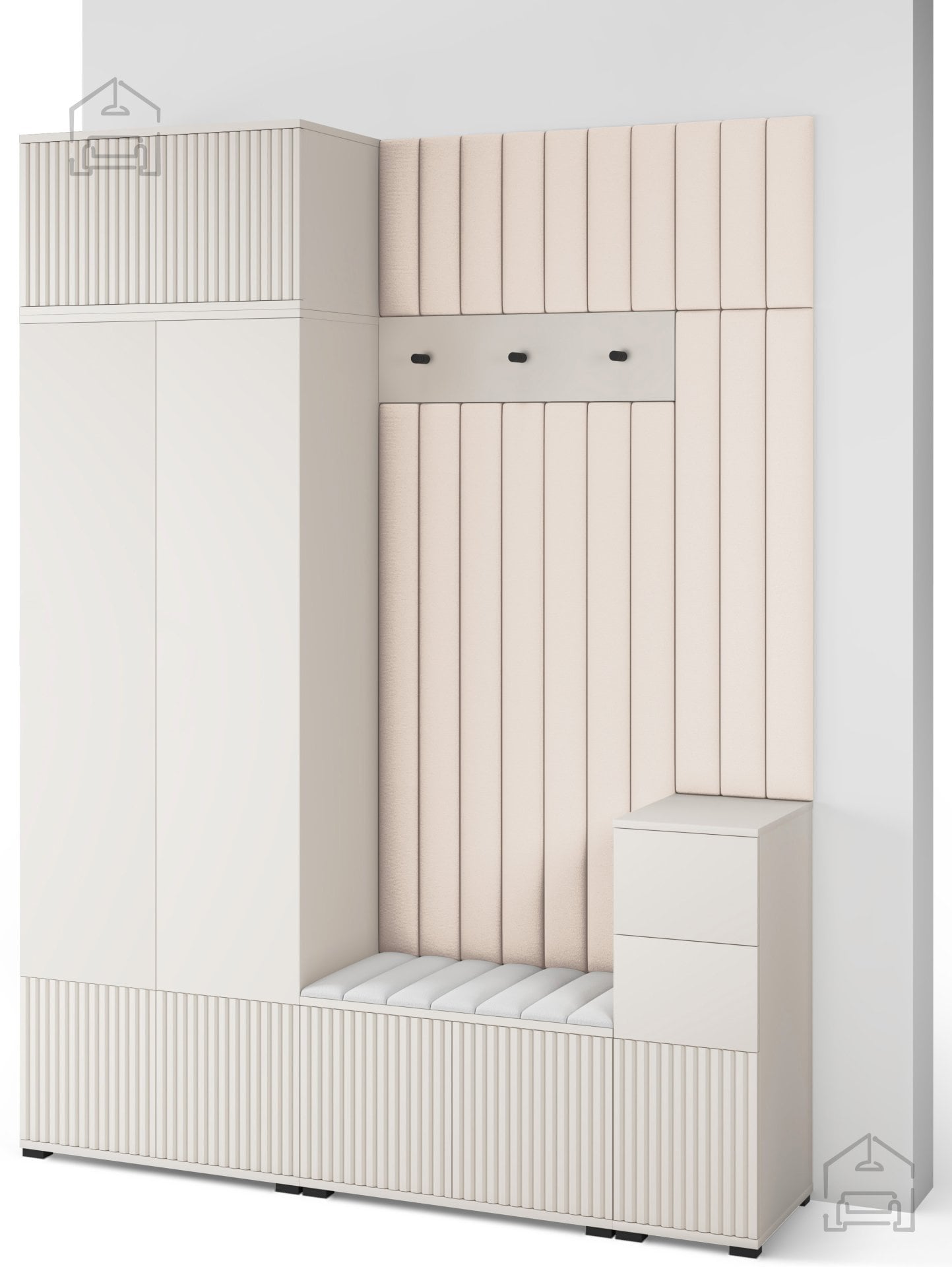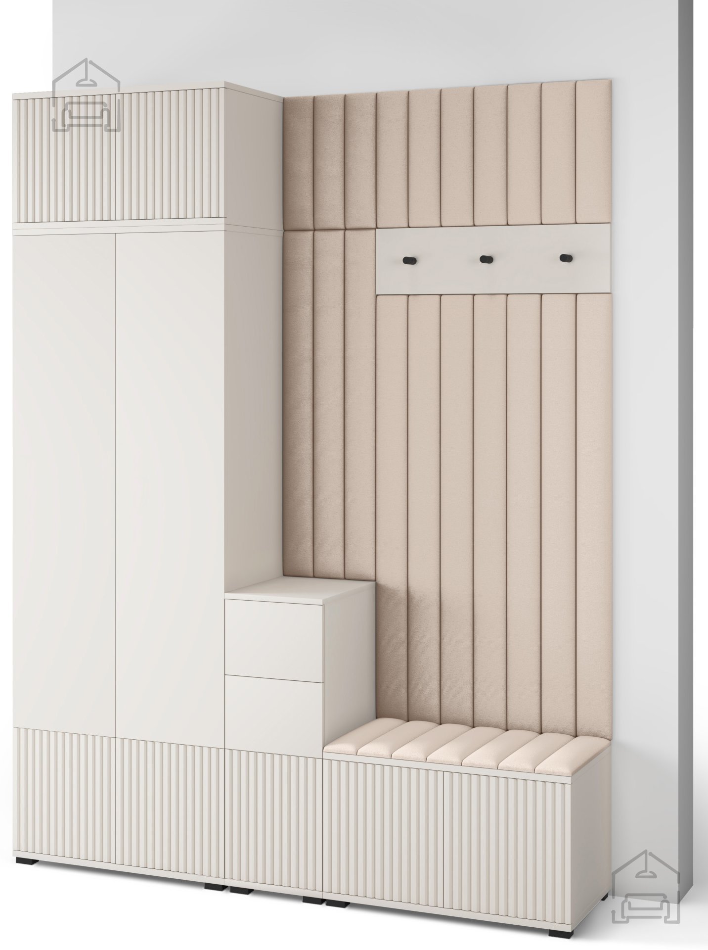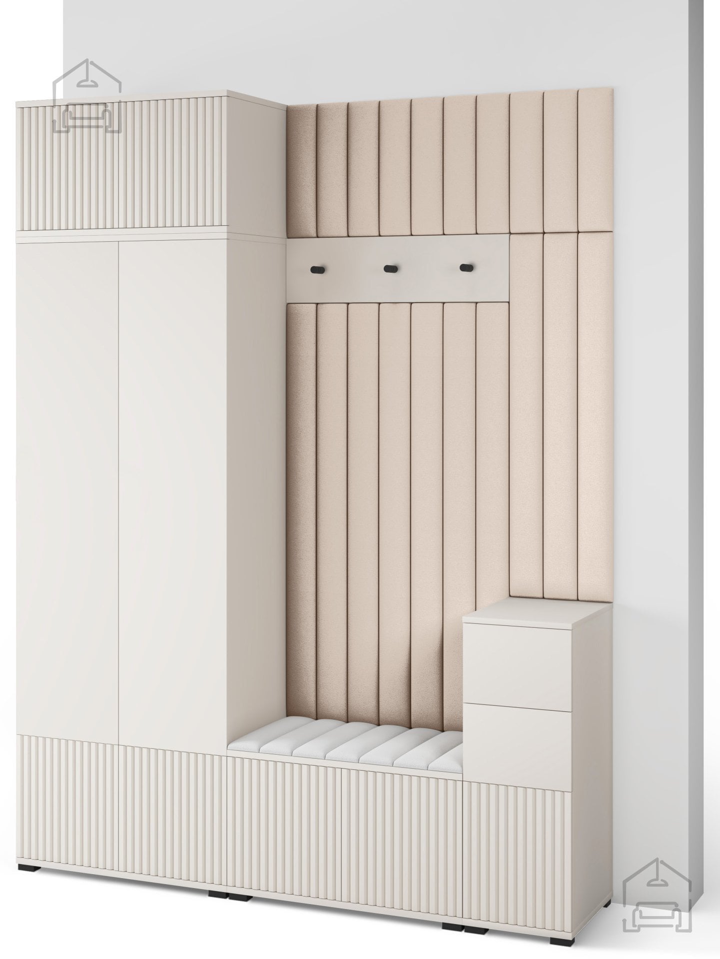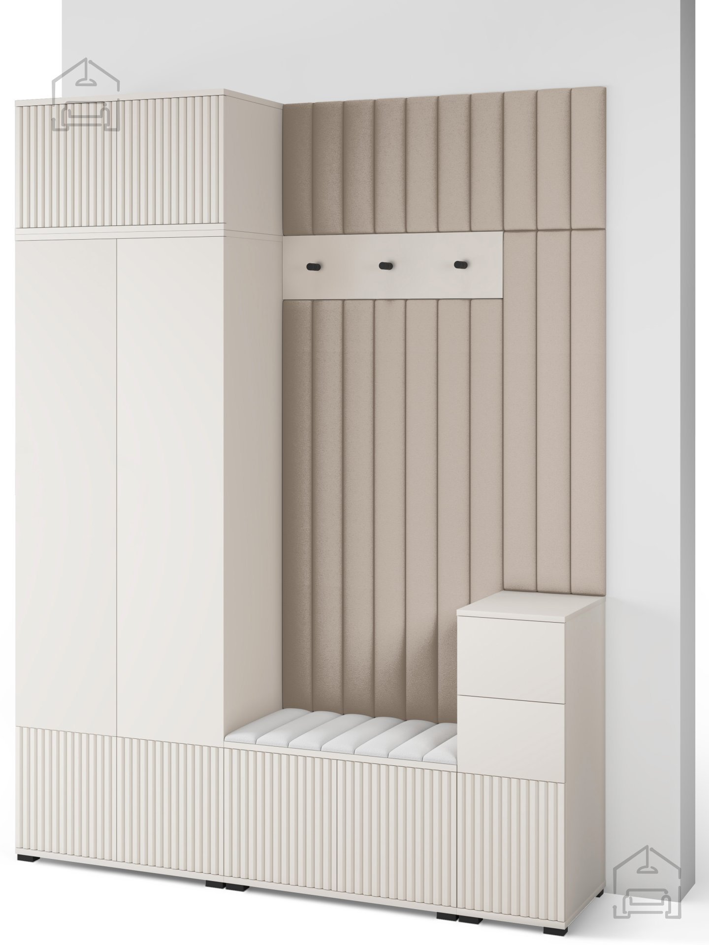Odtenek kašmir prinaša občutek topline in miru, ki ga je enostavno kombinirati z drugimi materiali, kot so naravni les, kovina ali nevtralne tkanine. Površina brez ročajev in jasne, ravne linije ustvarjajo minimalističen videz, ki lepo dopolnjuje sodobne interierje. Črni kovinski kavlji na obešalniku dodajo subtilen kontrast ter poudarijo elegantno preprostost celotnega sestava.