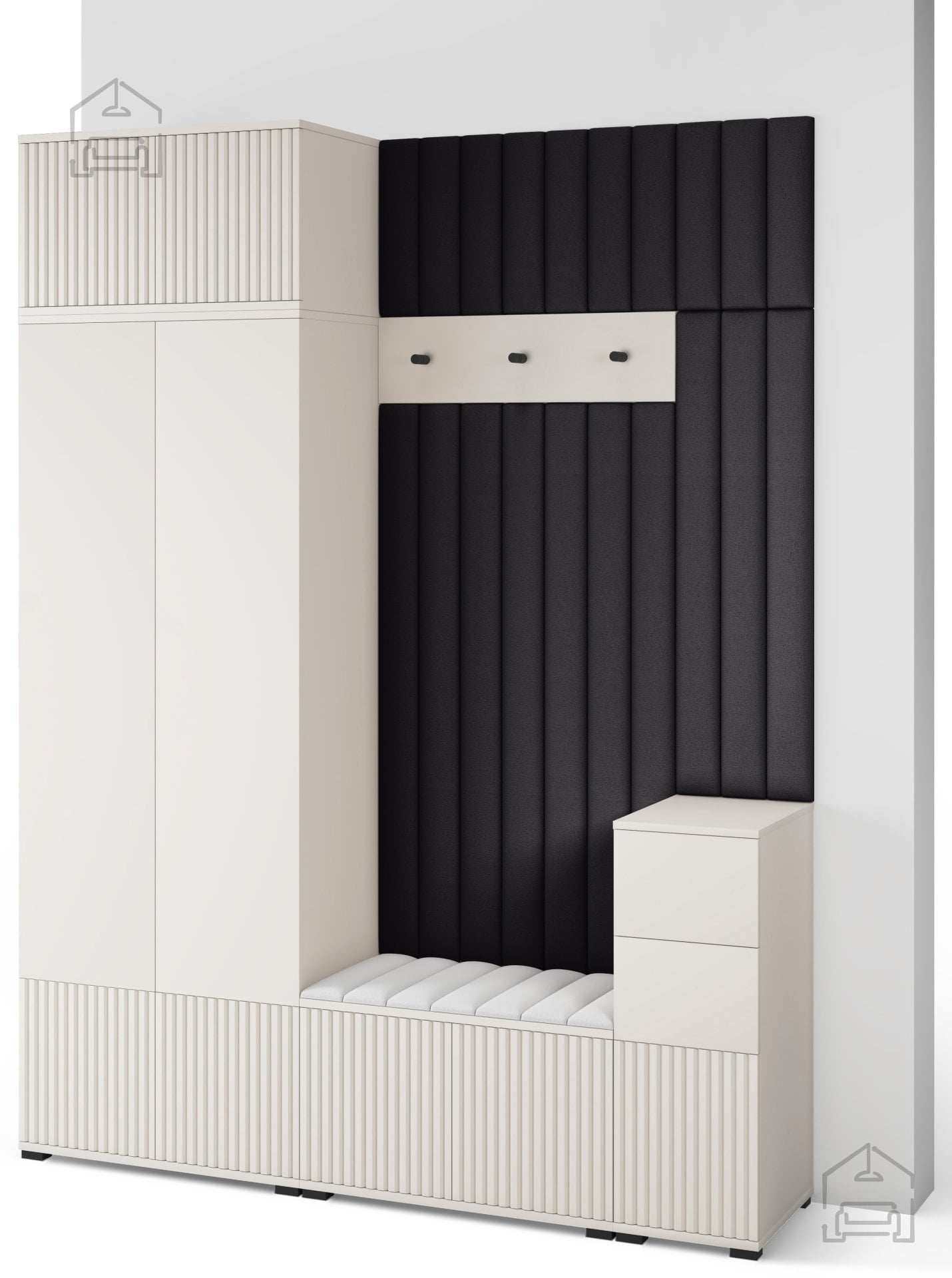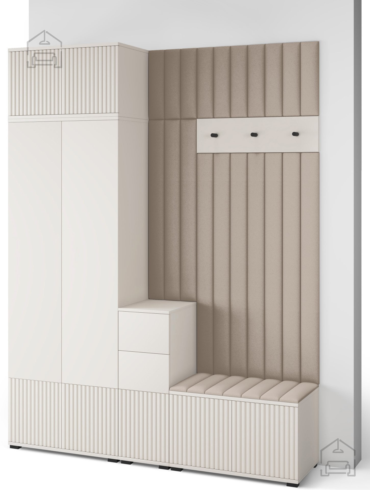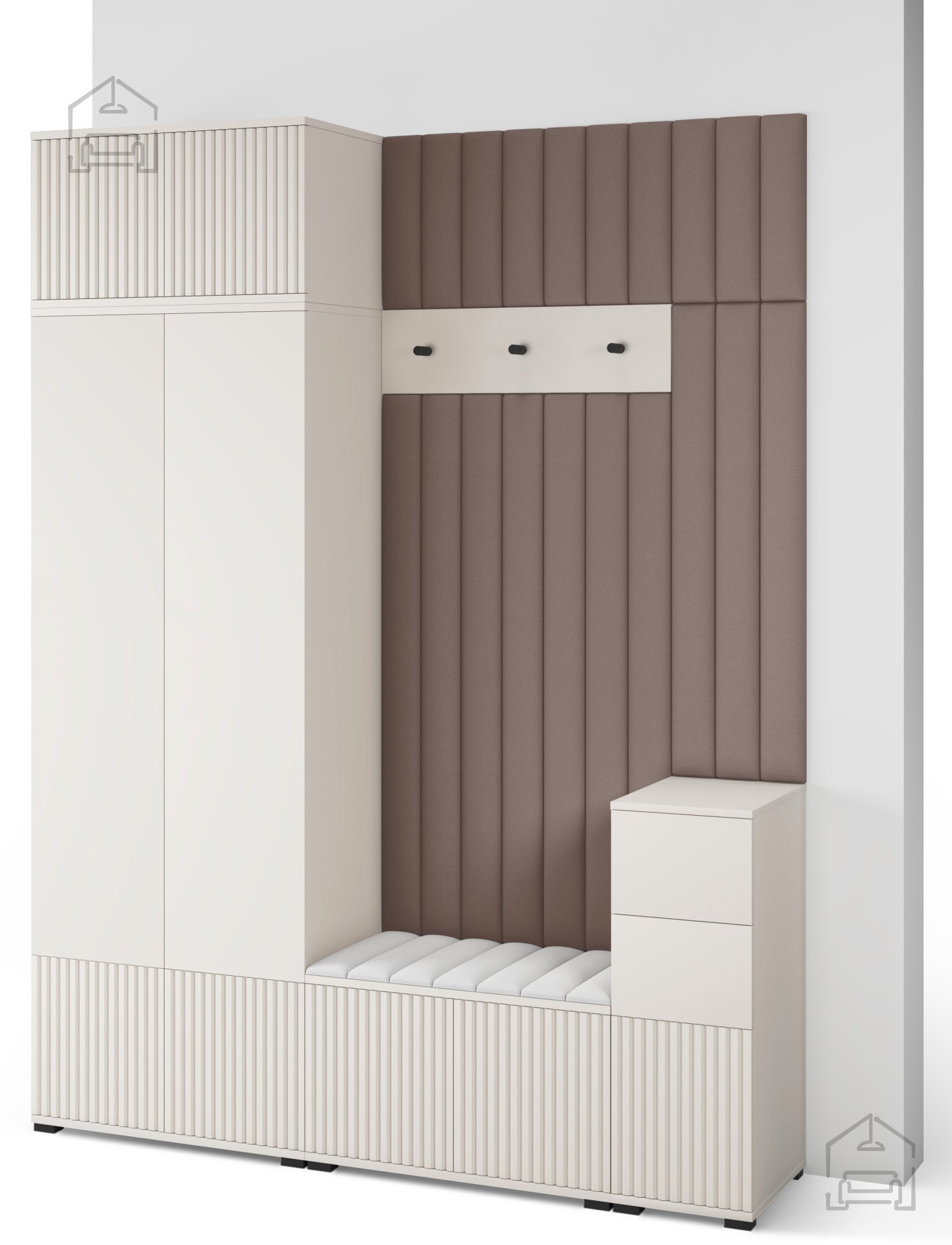 Odtenek kašmir prinaša občutek topline in miru, ki ga je enostavno kombinirati z drugimi materiali, kot so naravni les, kovina ali nevtralne tkanine. Površina brez ročajev in jasne, ravne linije ustvarjajo minimalističen videz, ki lepo dopolnjuje sodobne interierje. Črni kovinski kavlji na obešalniku dodajo subtilen kontrast ter poudarijo elegantno preprostost celotnega sestava.