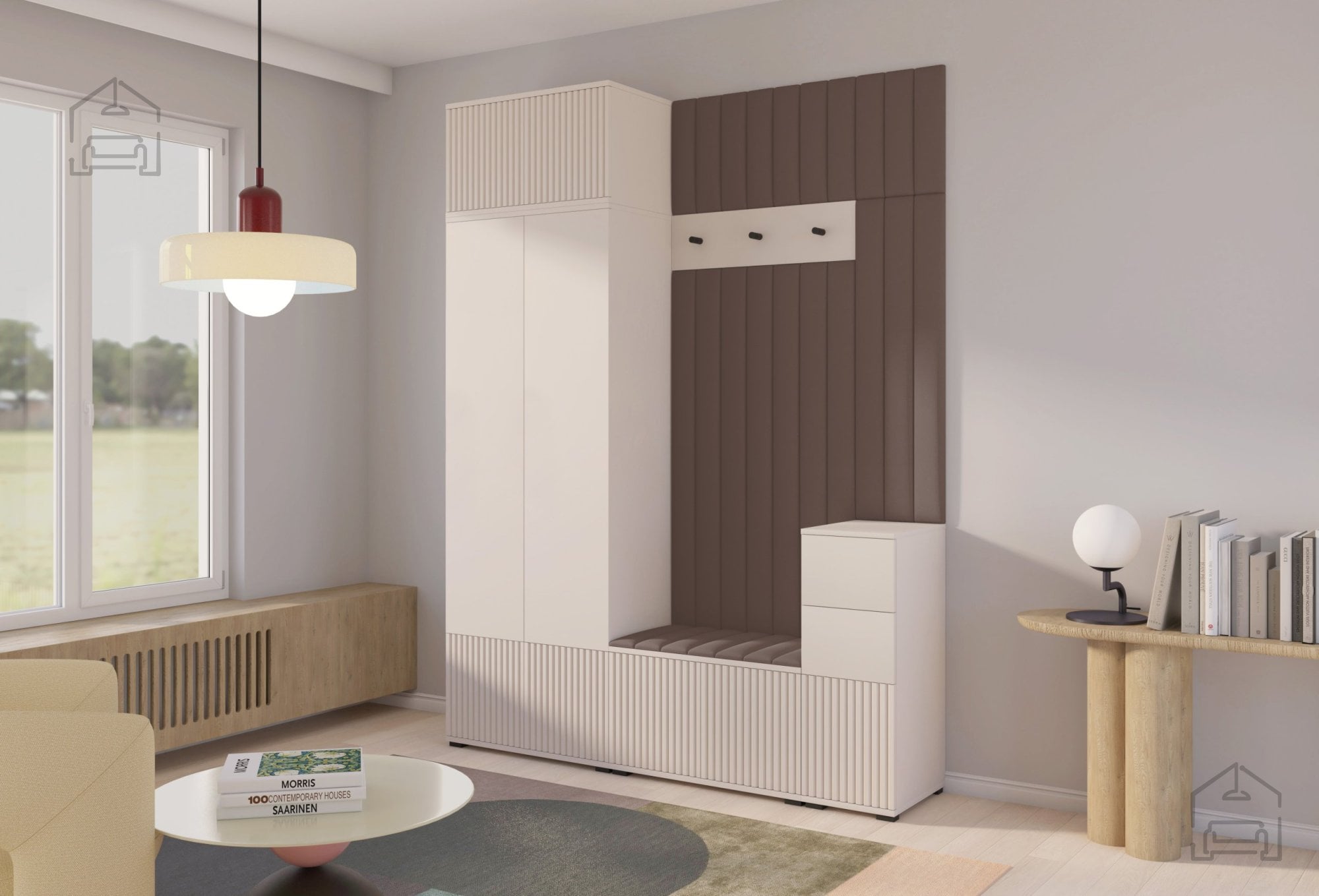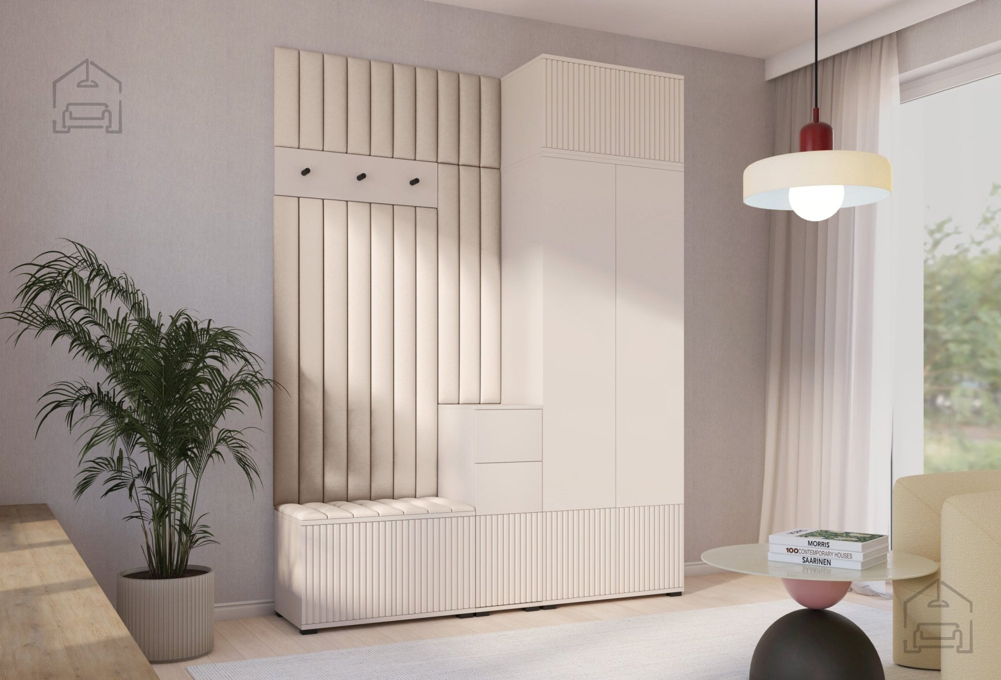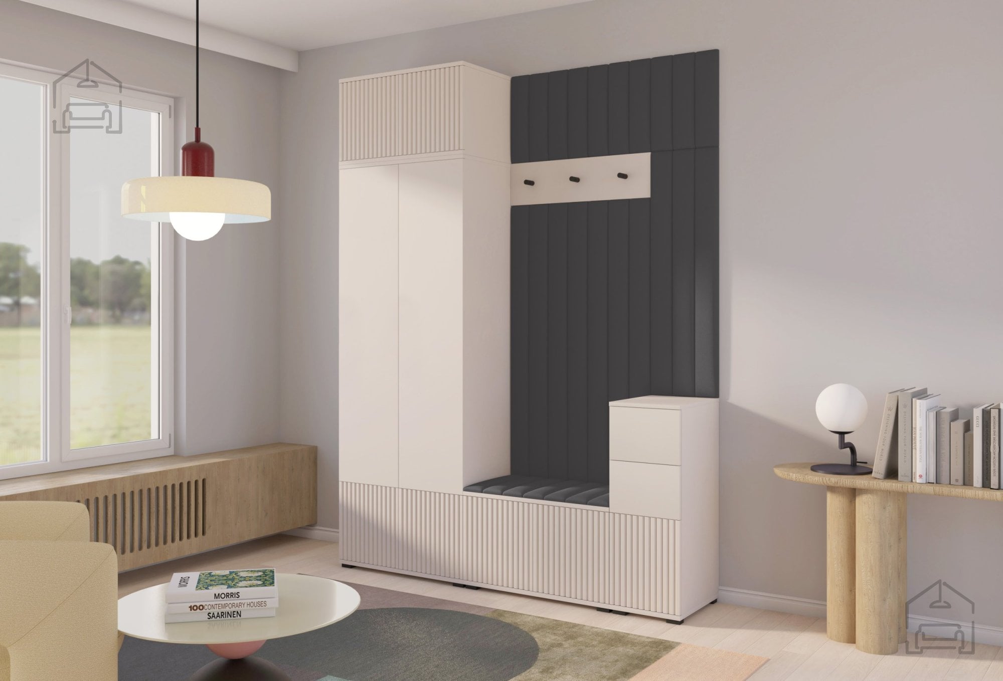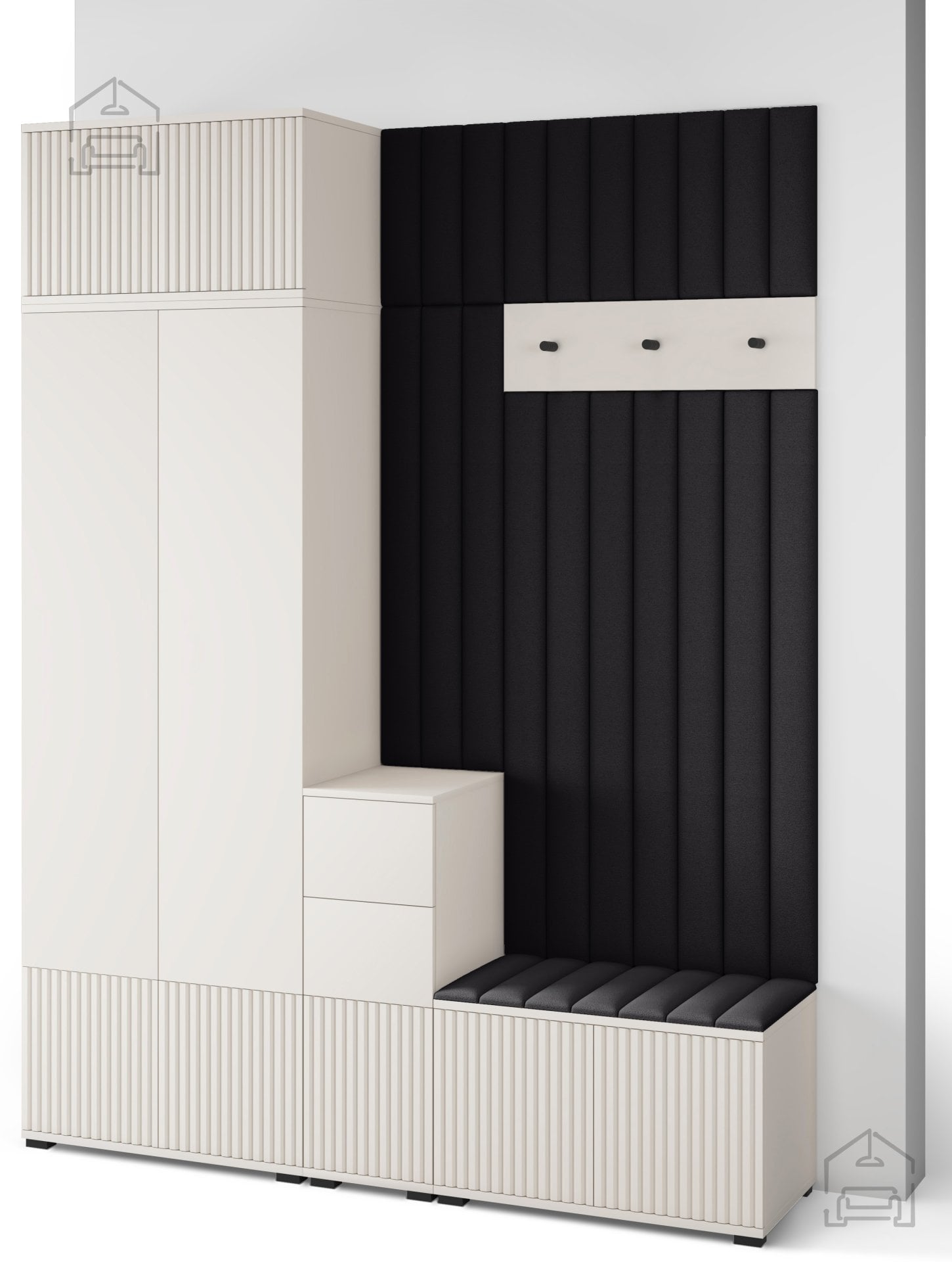 Odtenek kašmir prinaša občutek topline in miru, ki ga je enostavno kombinirati z drugimi materiali, kot so naravni les, kovina ali nevtralne tkanine. Površina brez ročajev in jasne, ravne linije ustvarjajo minimalističen videz, ki lepo dopolnjuje sodobne interierje. Črni kovinski kavlji na obešalniku dodajo subtilen kontrast ter poudarijo elegantno preprostost celotnega sestava.