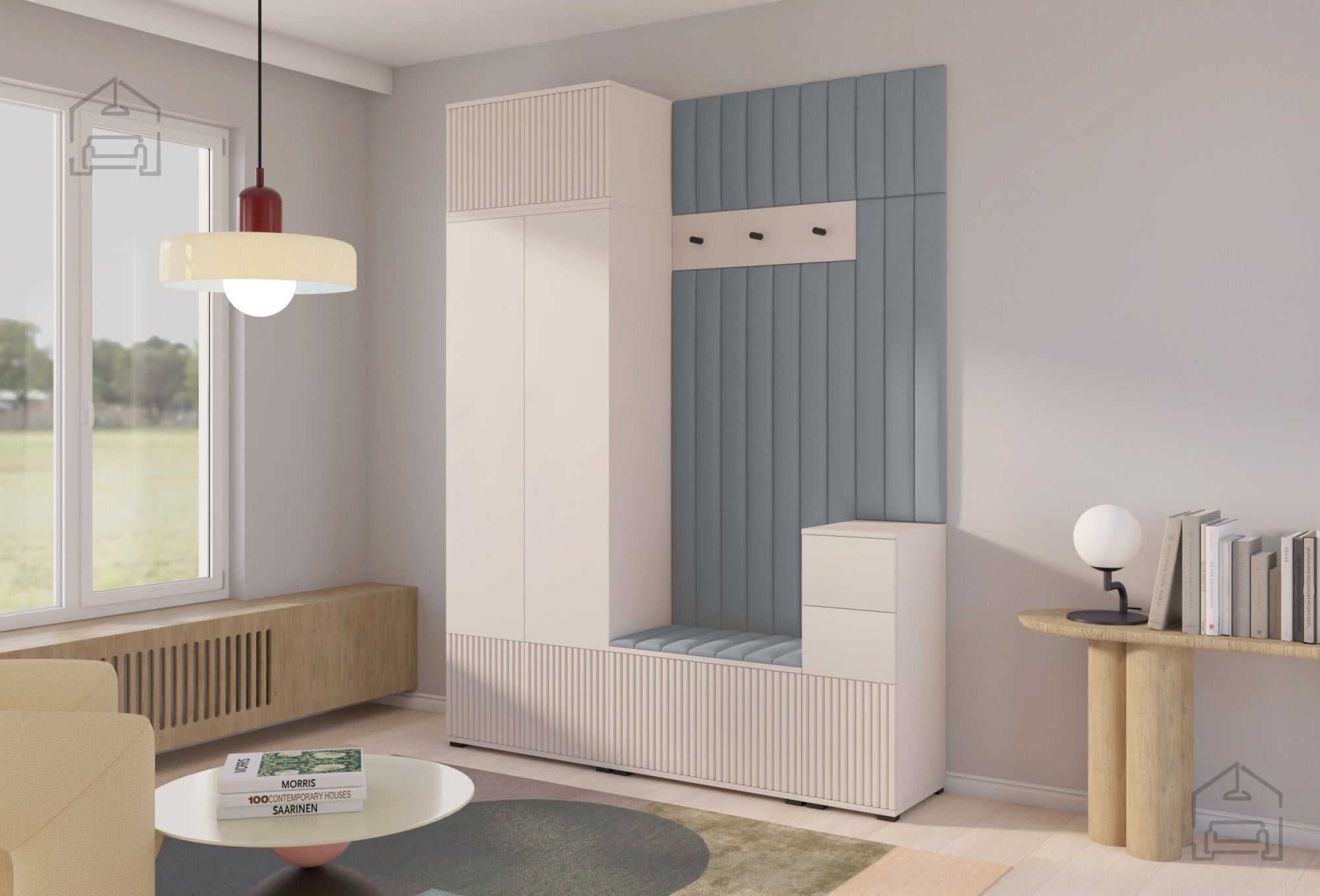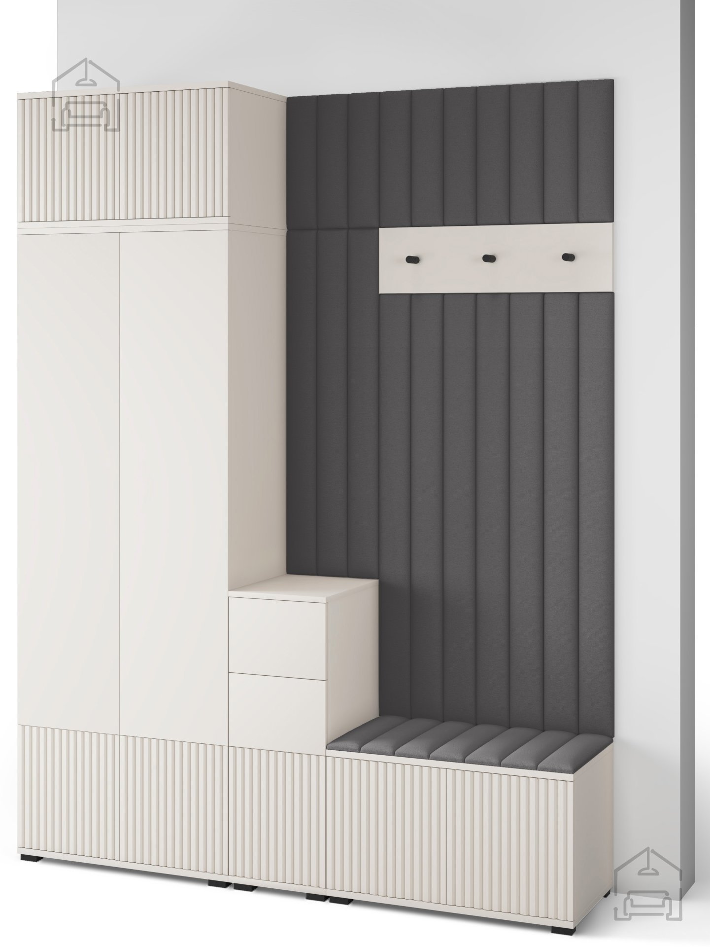 Komplet Rayo 8 je zasnovan tako, da ponuja vse, kar potrebujete za praktično in estetsko dovršeno predsobo. V njem so združeni elementi, ki omogočajo učinkovito shranjevanje oblačil, obutve ter dodatkov, hkrati pa prostor vizualno povezujejo v harmonično celoto. Mehki tapecirani paneli v tkanini Trinity 02 dodajo toplino in prijeten občutek ob dotiku, obenem pa služijo kot dekorativni poudarek.