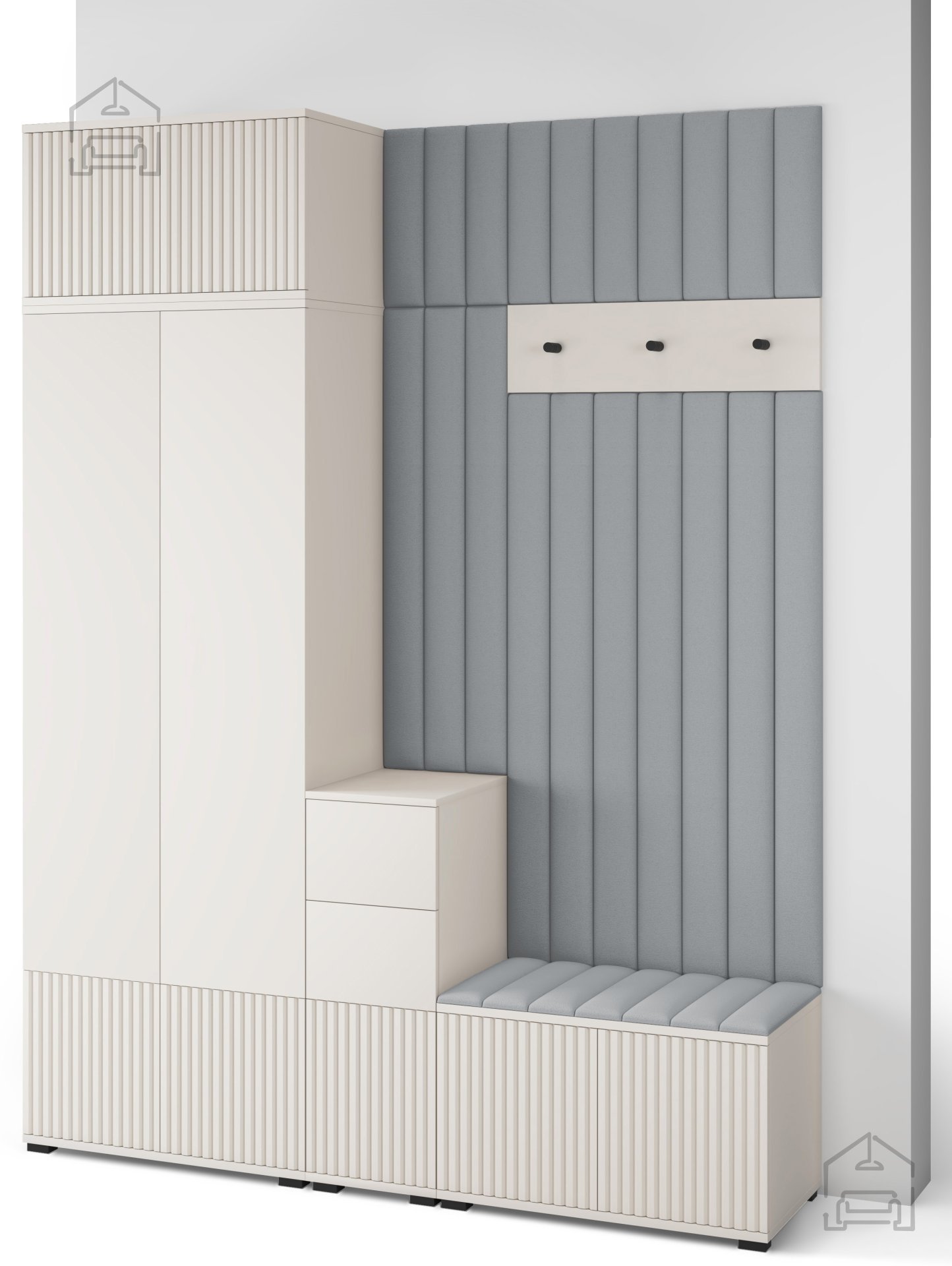 Posebnost kompleta Rayo 8 so dekorativni tapecirani paneli v nežnem odtenku tkanine Trinity 02. Paneli se nameščajo neposredno na steno ali na omaro s pomočjo lepila, kar omogoča hitro in čisto montažo. Poleg estetske funkcije zagotavljajo tudi delno zvočno izolacijo in izboljšujejo akustiko prostora. Zaradi mehke površine so praktični tudi kot zaščita stene pred obrabo ali kot udoben naslon ob obuvanju.