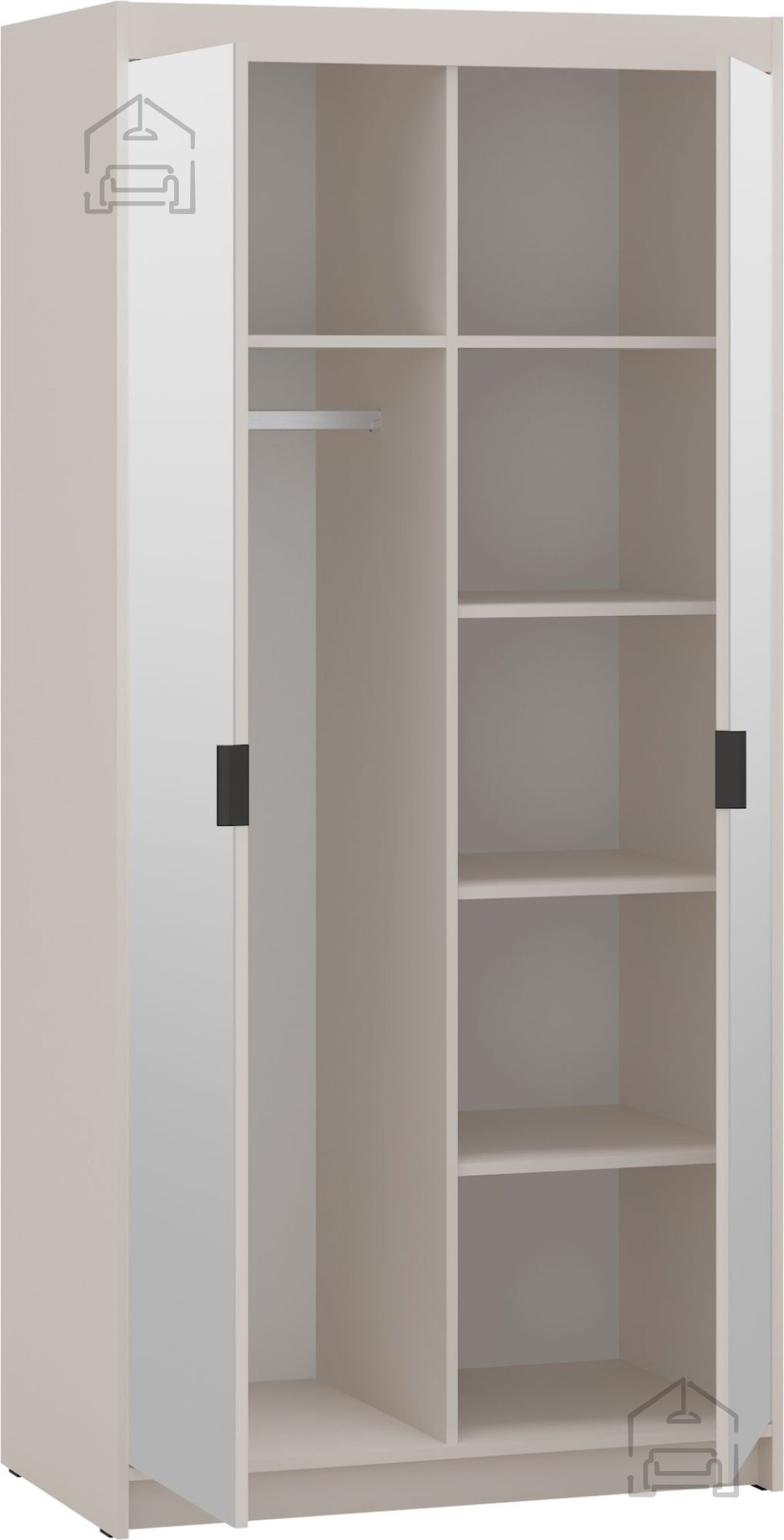 Notranjost omare Elena 2D je zasnovana tako, da omogoča optimalno izrabo prostora. Zgornji del ponuja prostor za police ali shranjevanje sezonskih oblačil, spodnji del pa omogoča obešanje srajc, jaken ali oblek. Ogledalo na vratih vam prihrani prostor, saj odpravlja potrebo po dodatnem samostoječem ogledalu v sobi. To je posebej praktično v manjših spalnicah, hodnikih ali garsonjerah.