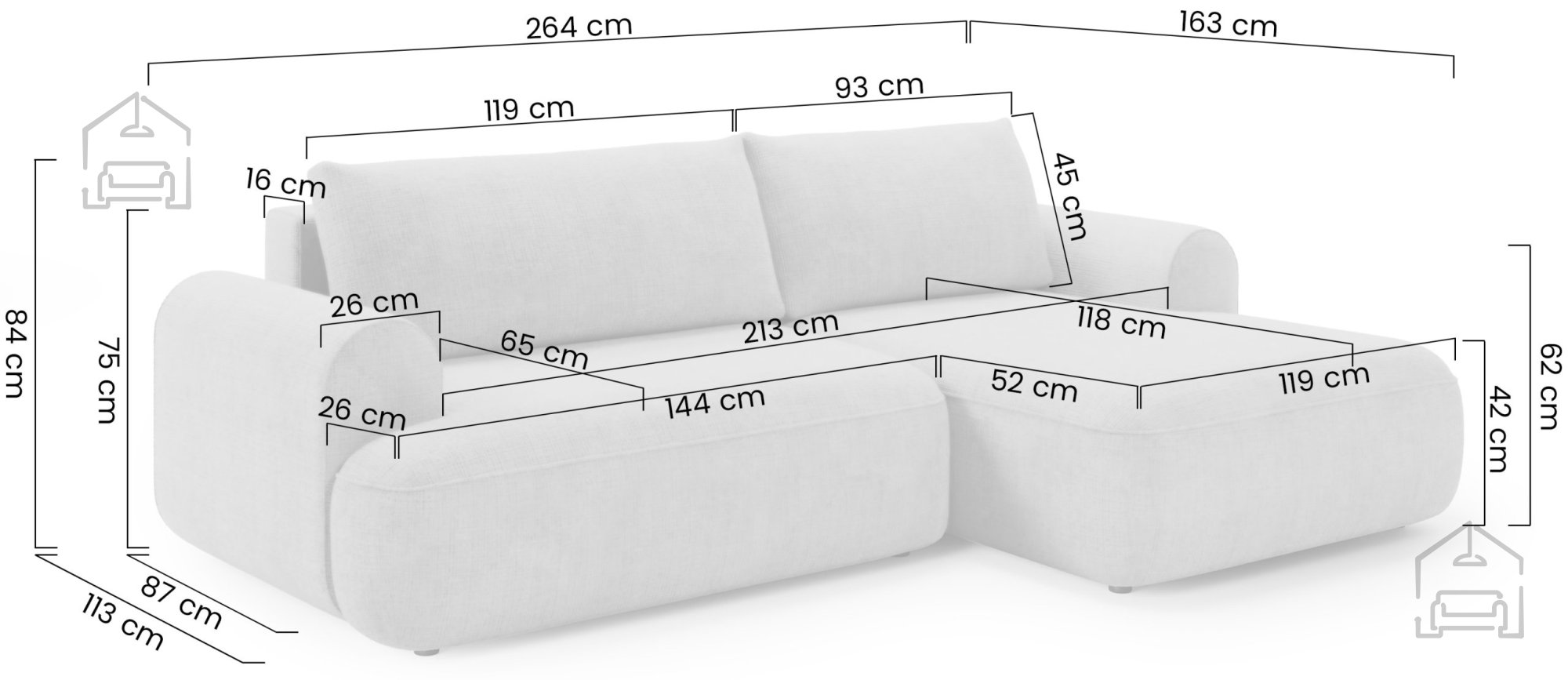 Največja dovoljena obremenitev znaša 150 kg na posamezen sedežni del, kar zadostuje za vsakodnevno družinsko uporabo. Zaradi svoje kompaktne oblike in premišljene konstrukcije je to idealna rešitev za tiste, ki iščejo kakovostno in prostorsko učinkovito sedežno garnituro.