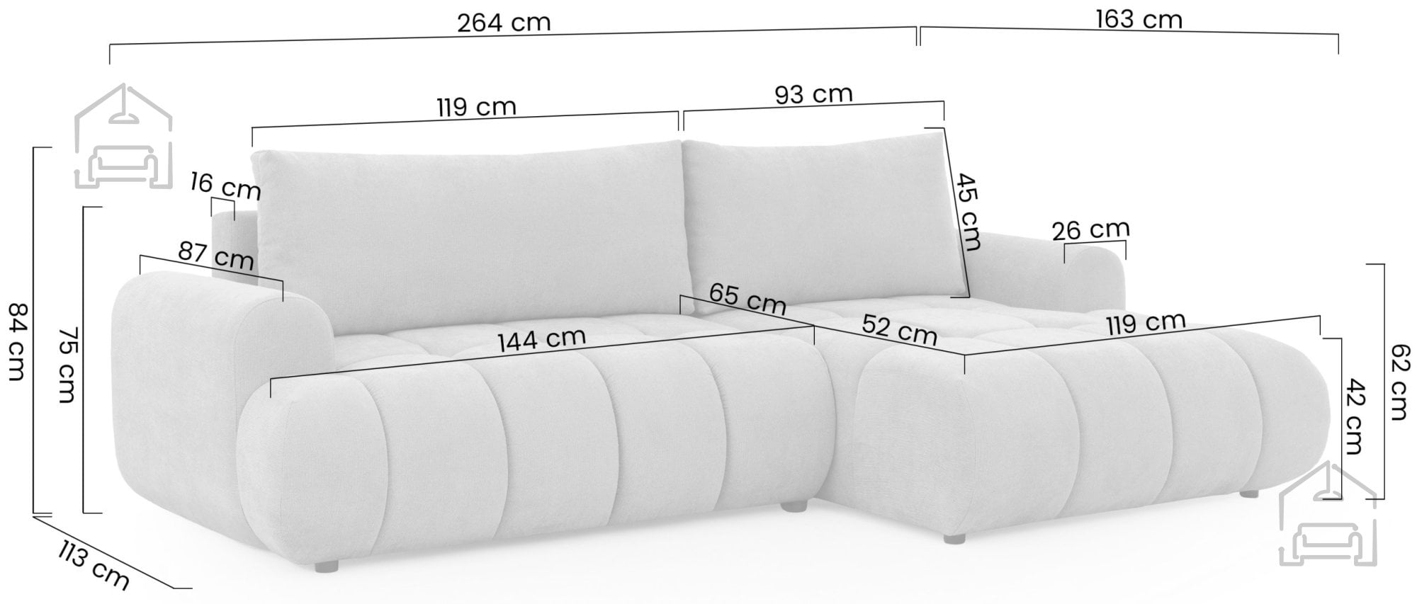 Kotna sedežna garnitura Lutario Mini združuje funkcionalnost, preprostost in estetsko dovršenost sodobnega pohištva. Z dimenzijami 264x163x84 cm ponuja dovolj prostora za udobno sedenje, sprostitev ali druženje s prijatelji. Zaradi svoje kompaktne oblike je idealna izbira za manjše dnevne sobe, kjer želite ohraniti občutek odprtosti in prostornosti, hkrati pa ne sklepati kompromisov pri udobju.
