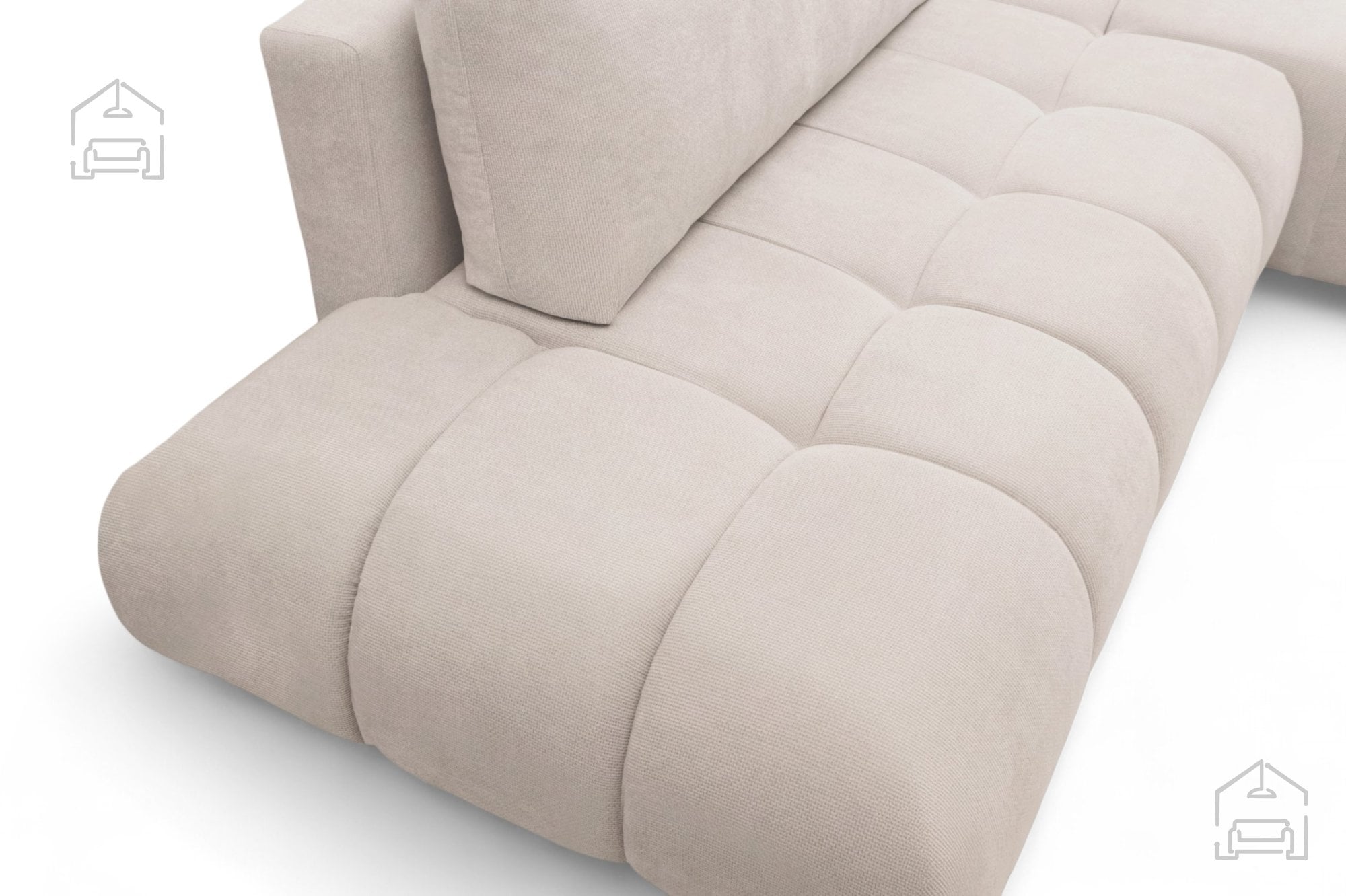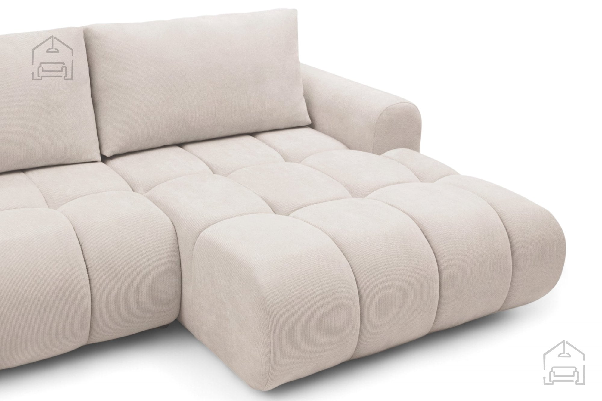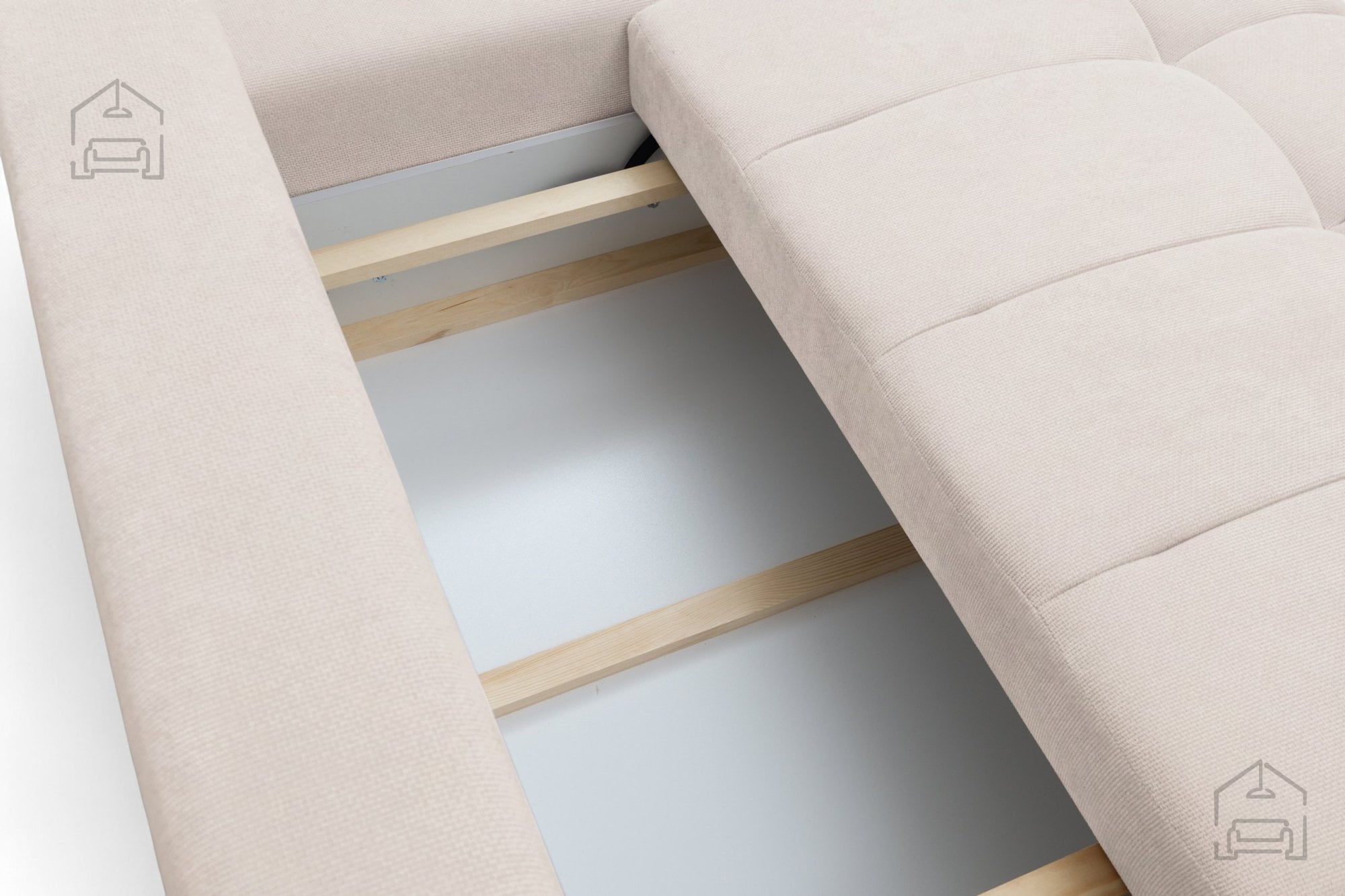 Pod sedežem je vgrajen tudi praktičen predal za posteljnino, kamor lahko shranite odeje, vzglavnike ali druge tekstilne dodatke. Ta rešitev omogoča, da prostor ostane urejen, brez dodatnih omar ali škatel.