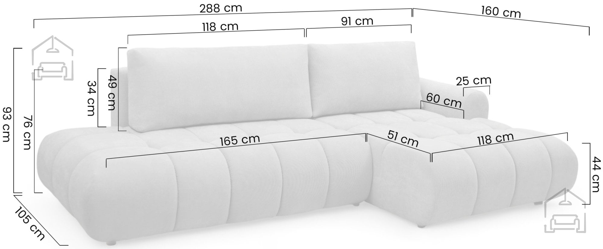 Višina sedeža 44 cm je optimalna za udobno sedenje, tako za krajše počitke kot za dolgotrajno druženje. Z mehanizmom Euro se garnitura preprosto raztegne v ležišče dimenzij 255x145 cm. Ta sistem je znan po svoji zanesljivosti in enostavni uporabi – s potegom sedalnega dela in spustom naslona dobite ravno spalno površino, primerno za občasno spanje ali sproščeno gledanje filmov. Širina spalnega prostora znaša 140 cm, kar zadostuje za dve osebi.