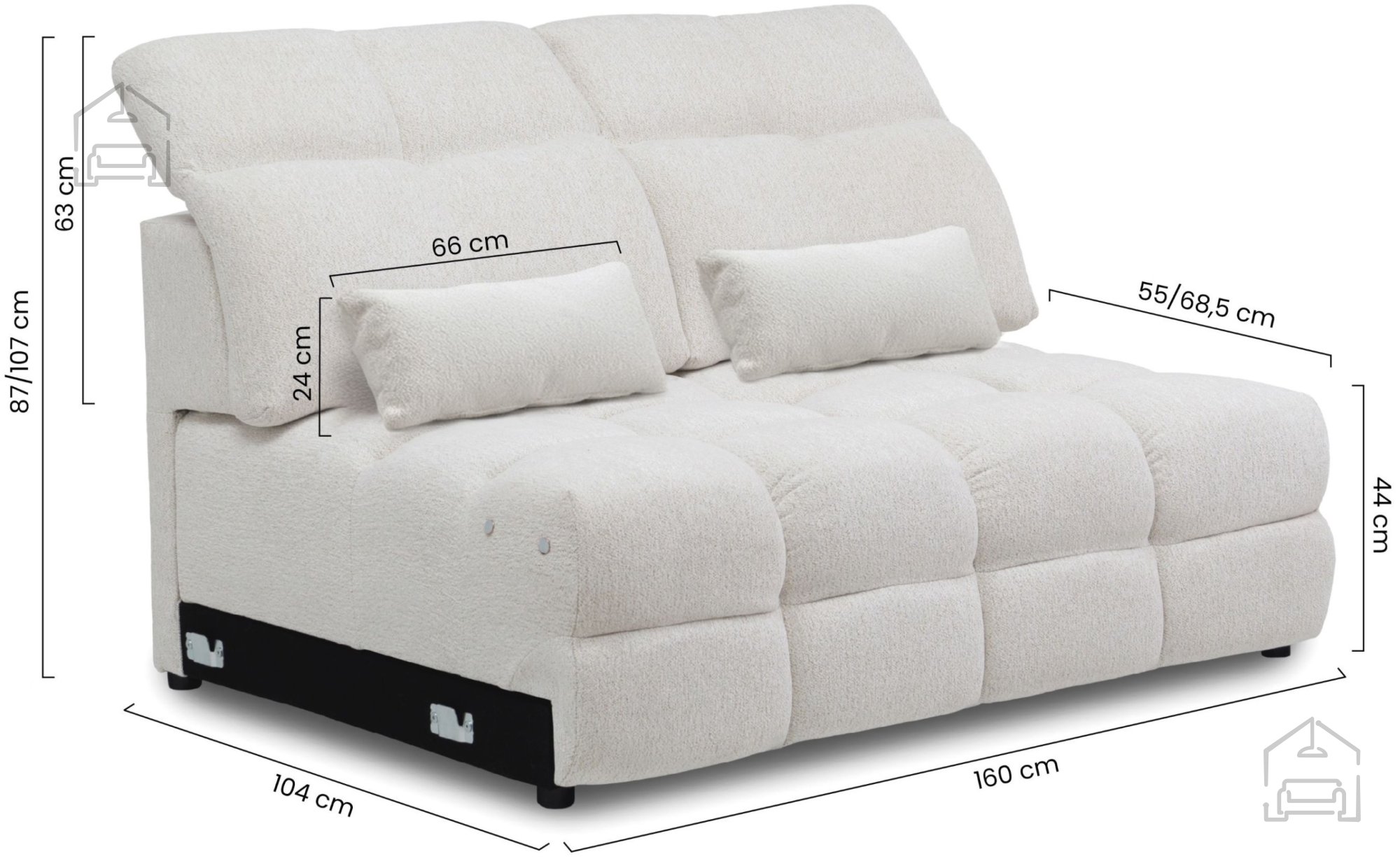 Sistem je brez klasičnega mehanizma za raztegovanje, vendar ponuja možnost električnega izvleka sedeža, kar bistveno poveča udobje pri sedenju ali počitku. Globina izvlečenega sedeža znaša 94 cm, kar omogoča sproščeno in udobno uporabo. Višina sedeža je 44 cm, kar ustreza ergonomskim zahtevam sodobnega sedenja, noge pa so izdelane iz plastike višine 3 cm. Največja dovoljena obremenitev znaša 150 kg na osebo, kar potrjuje trdnost konstrukcije in kakovost uporabljenih materialov.