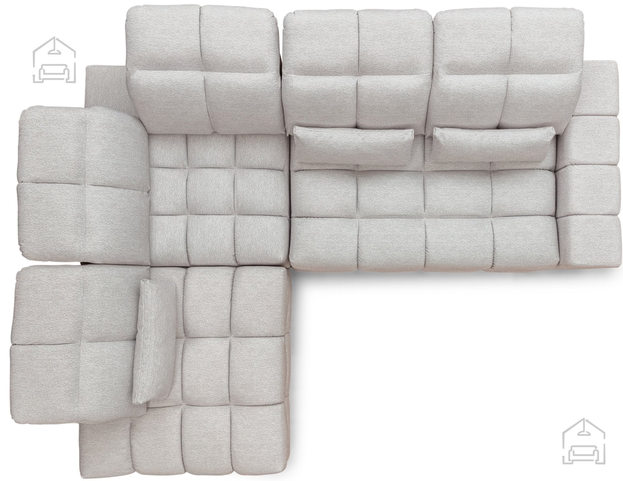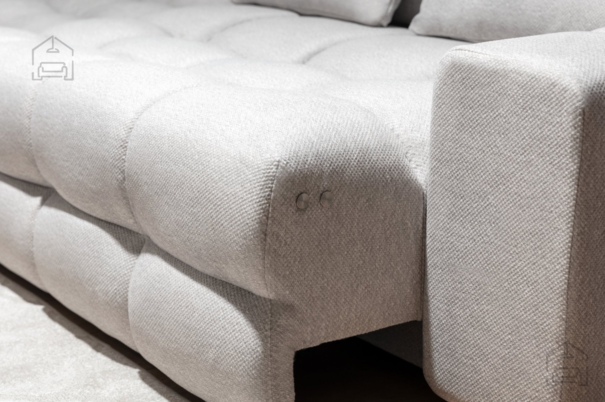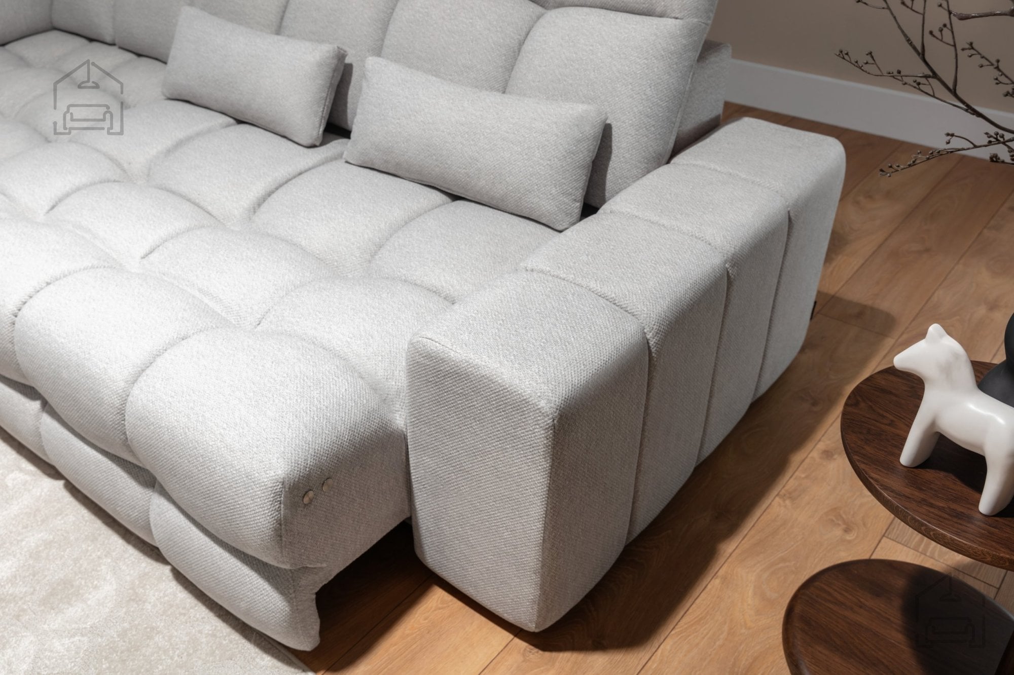 Za trdnost in dolgo življenjsko dobo skrbi kakovosten leseni okvir, dodatno ojačan z iverno ploščo. Takšna kombinacija materialov zagotavlja stabilnost, hkrati pa ohranja prijetno lahkotnost konstrukcije. Sedežni del je izdelan iz visokoelastične HR pene v kombinaciji z vzmetnim jedrom Pocket Springs, kar pomeni, da se sedišče optimalno prilagaja obliki telesa in nudi enakomerno podporo pri sedenju ali ležanju. Naslonjalo je polnjeno z visokoelastično peno, ki skrbi za udobje hrbta tudi pri daljšem sedenju, medtem ko so blazine napolnjene z mešanico pen za prijetno mehkobo in naraven občutek.