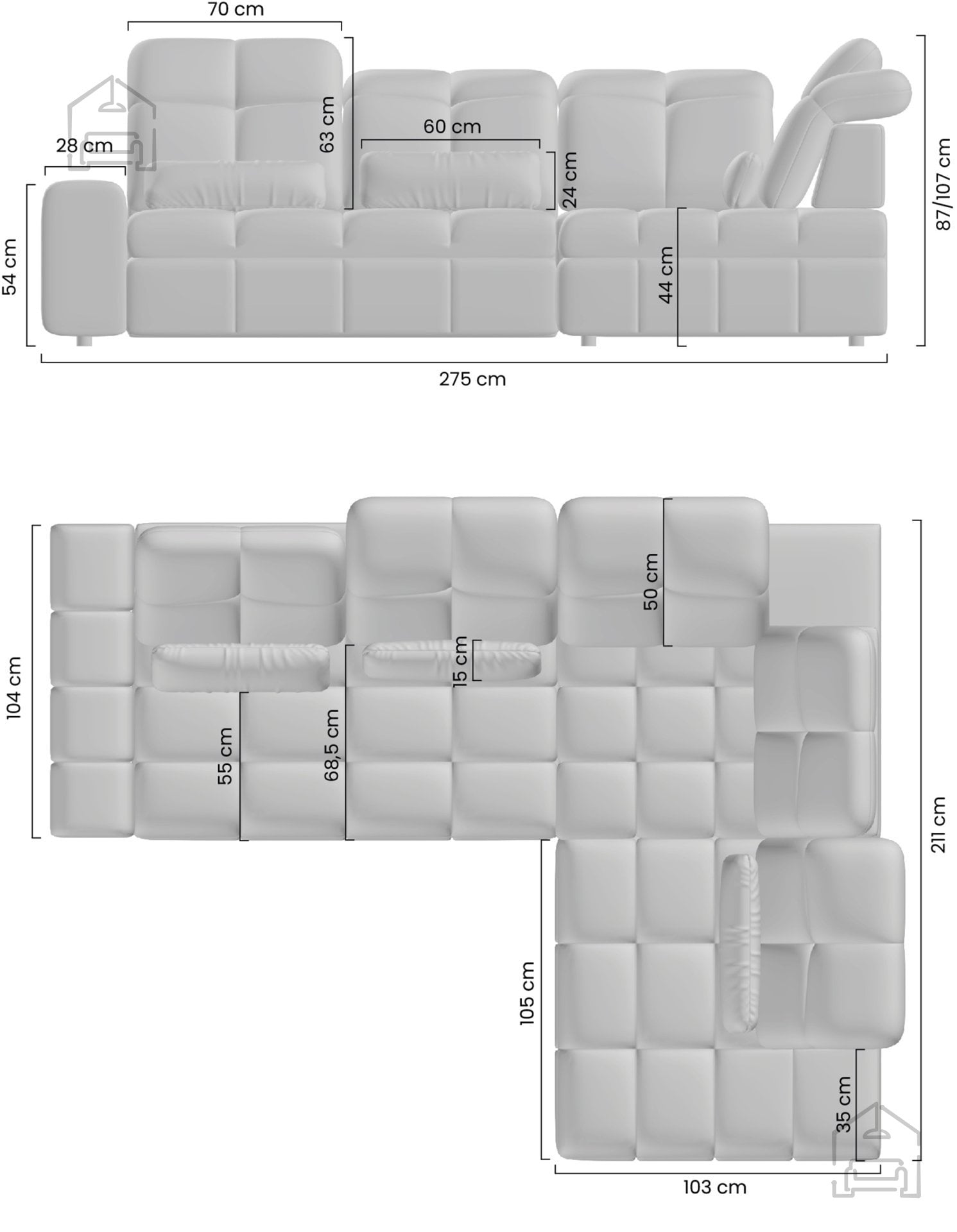 Višina sedišča 44 cm omogoča enostavno vstajanje, kar je še posebej praktično za starejše uporabnike. Garnitura nima predala za posteljnino, kar pomeni, da je vsa pozornost namenjena udobju sedenja in mehanizmu relaksacije. Zaradi svoje oblike in dimenzij je idealna za vogalne postavitve, kjer ustvari naravni center dnevne sobe.