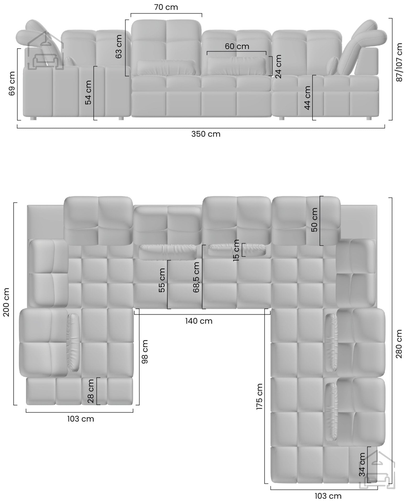 Celotna sedežna garnitura meri 350×280×107 cm in je zasnovana v obliki črke U, kar omogoča prijetno druženje več oseb hkrati. Višina sedeža znaša 44 cm, kar ustreza ergonomskim standardom za udobno sedenje. Ležalna površina meri 273×160 cm, kar omogoča sproščeno ležanje ali kratko popoldansko počivanje. Največja dovoljena obremenitev znaša 150 kg na osebo.