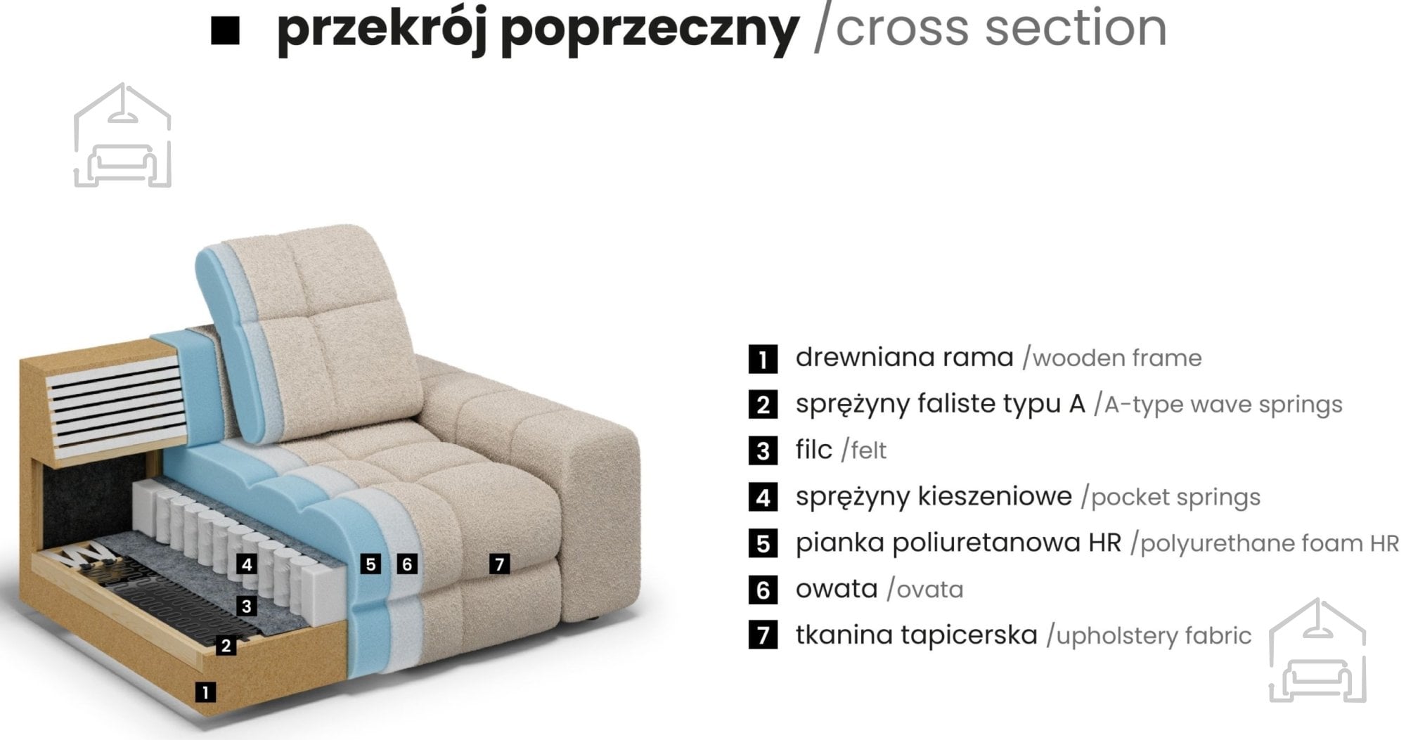 Okvir garniture je izdelan iz lesa in iverne plošče, kar zagotavlja trdnost in stabilnost skozi dolga leta uporabe. Sedežni del je sestavljen iz visokokakovostne pene HR (High Resilience) v kombinaciji z vzmetnim jedrom Pocket Springs. Takšna kombinacija materialov omogoča optimalno podporo telesu, hkrati pa ohranja elastičnost in dolgotrajno udobje sedenja.