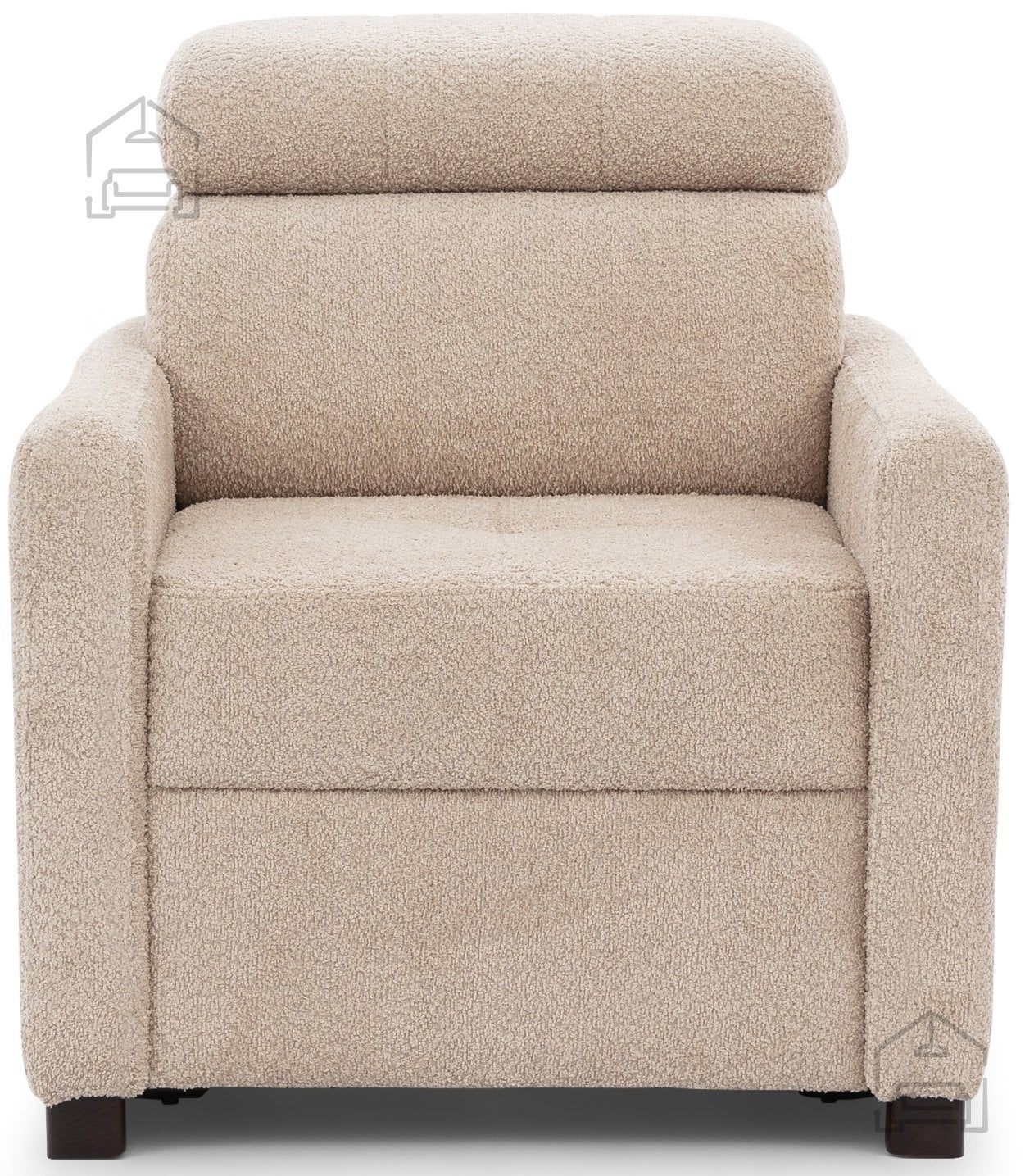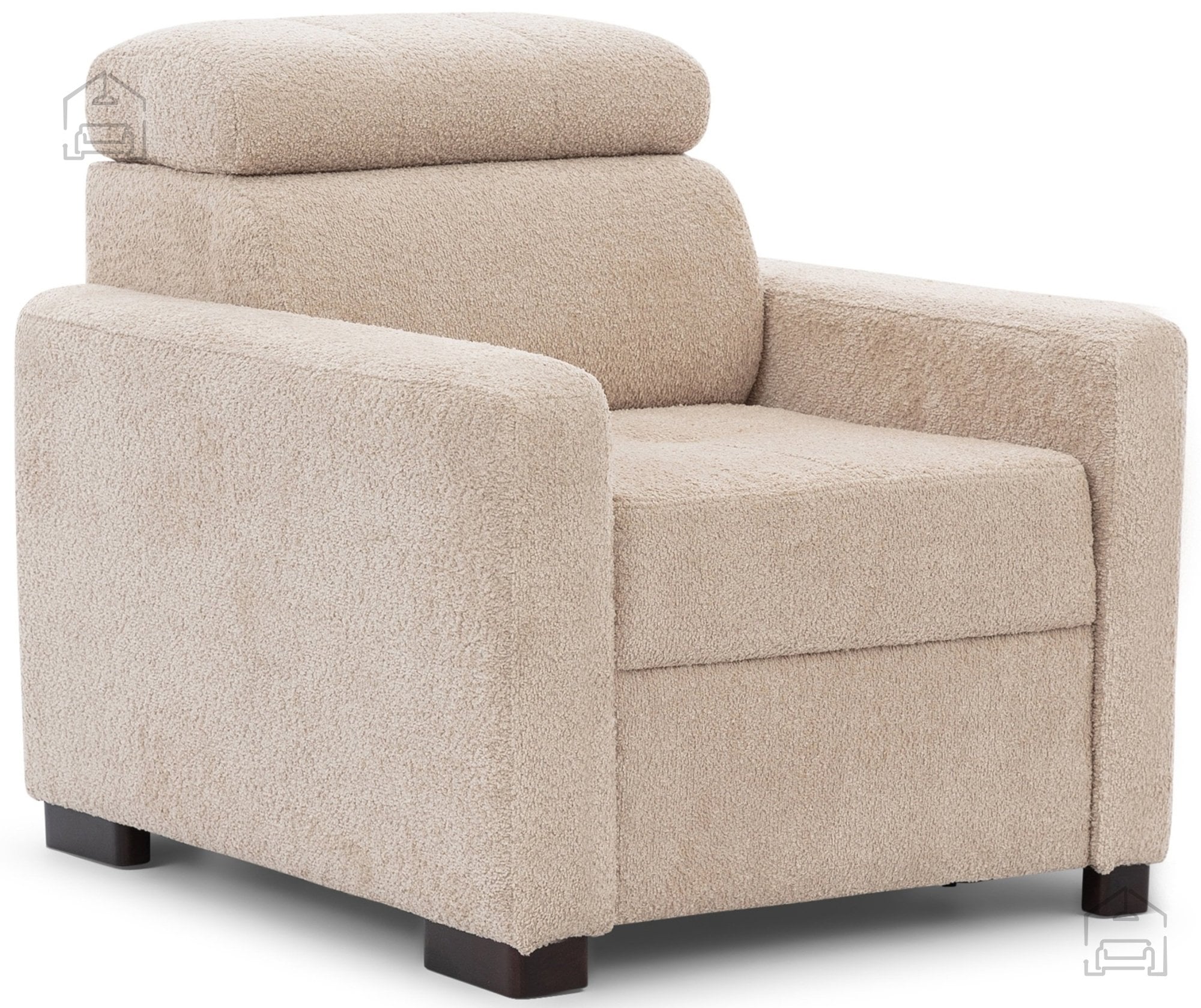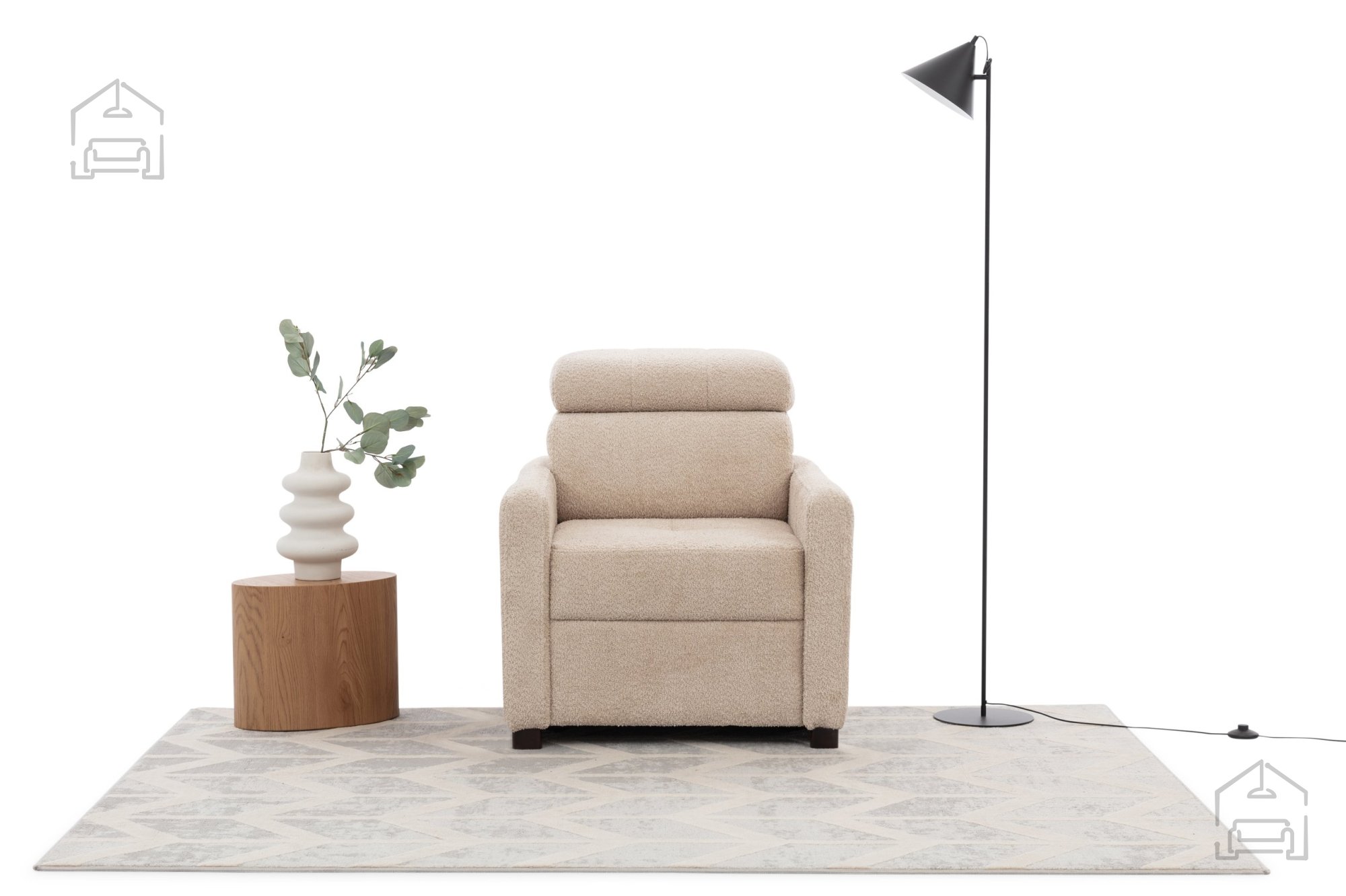 Za zunanjo oblogo je uporabljena kakovostna tkanina, prijetna na dotik in odporna na vsakodnevno uporabo. Lesene noge v barvi wenge dopolnjujejo videz fotelja s toplim, naravnim tonom, hkrati pa zagotavljajo stabilno oporo. Višina nogic znaša 5 cm, kar omogoča enostavno čiščenje tal pod foteljem in ohranja vizualno lahkotnost celotne konstrukcije.