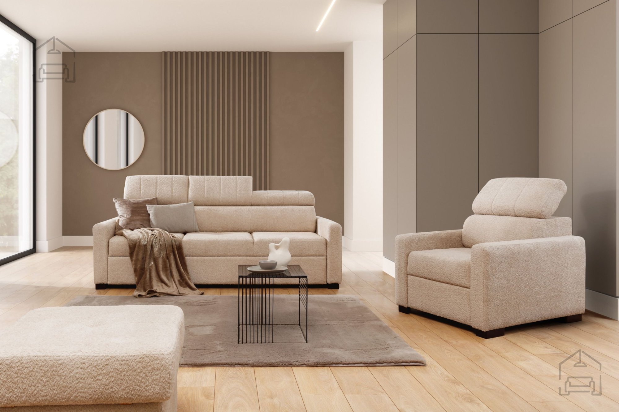 Posebnost modela so nastavljivi vzglavniki, ki jih je mogoče prilagoditi višini in naklonu glede na potrebe uporabnika. Ta funkcionalnost povečuje udobje pri počitku, gledanju televizije ali branju. Taremo je zato odlična izbira za dnevne sobe, bralne kotičke ali prostore za sprostitev, kjer se estetika sreča s praktičnostjo.