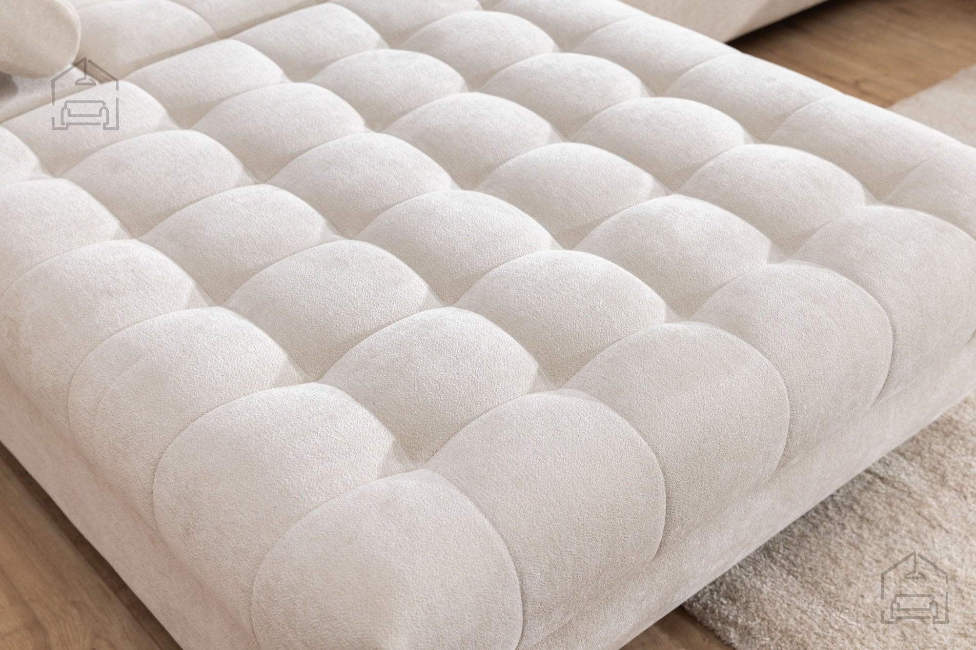 Okvir garniture je izdelan iz lesa in iverne plošče, kar zagotavlja stabilnost ter odpornost na vsakodnevne obremenitve. Sedežni del je napolnjen s peno T30 in podprt z valovitimi vzmetmi (Wave Spring), ki omogočajo optimalno porazdelitev teže in ohranjajo obliko tudi po daljši uporabi. Naslonjala so dodatno oblazinjena s peno T25, kar zagotavlja prijetno mehkobo in podporo hrbtu.