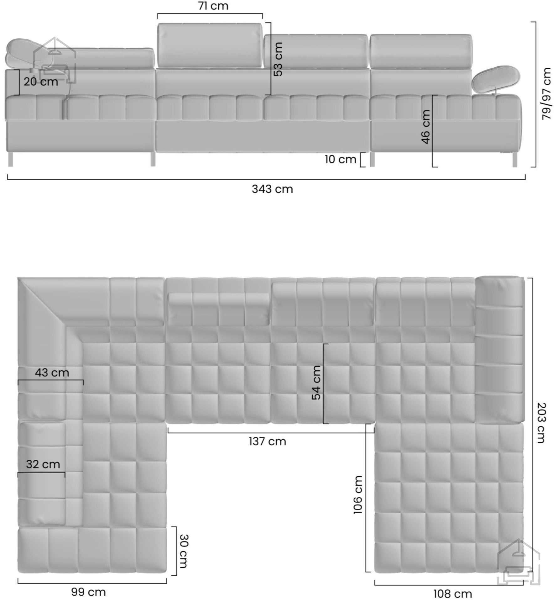 Sedežna garnitura Tyrion II se ponaša z elegantnimi kovinskimi nogami v črni barvi, višine 10 cm, ki prispevajo k modernemu videzu in omogočajo enostavno čiščenje tal pod garnituro. Višina sedeža znaša 46 cm, kar zagotavlja udobno sedenje tako za nižje kot tudi višje uporabnike. Nastavljivi vzglavniki in nasloni za roke omogočajo individualno prilagoditev položaja sedenja, kar dodatno povečuje udobje pri gledanju televizije, branju ali sproščanju po napornem dnevu.
