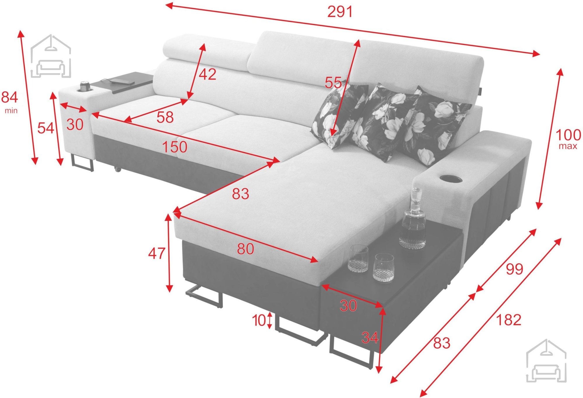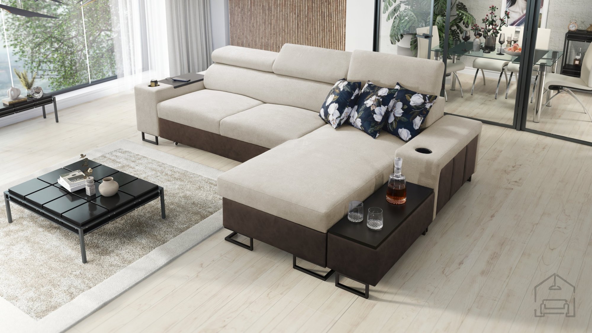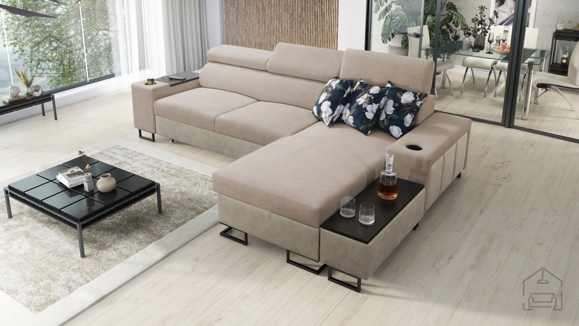 Garnitura je opremljena z zanesljivim mehanizmom Delfin, ki omogoča hitro in enostavno raztegovanje v ležalno površino 226x127 cm. Pod sedežnim delom se skriva prostoren predal za posteljnino, namenjen shranjevanju odej, blazin ali drugih dodatkov. Dodatne funkcionalnosti vključujejo: