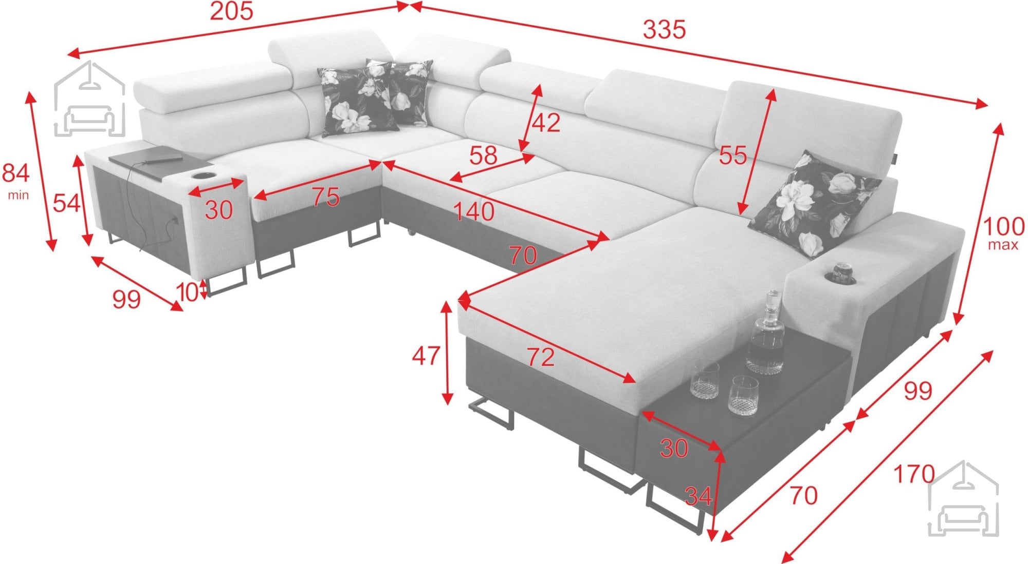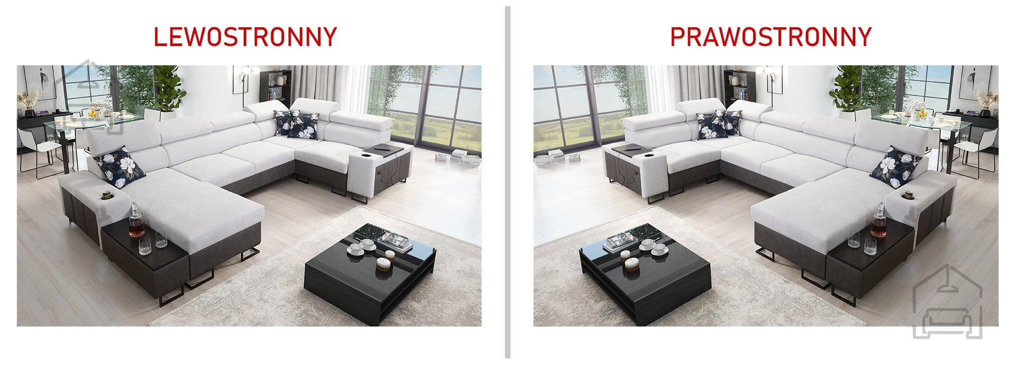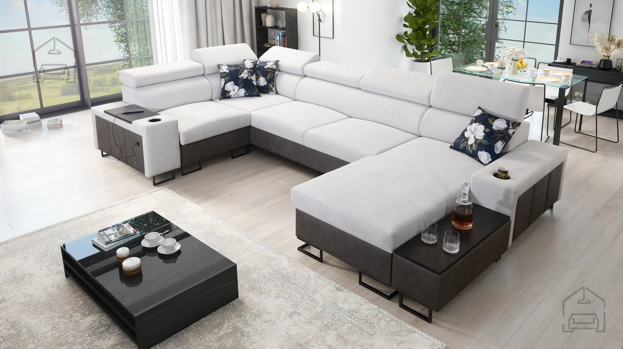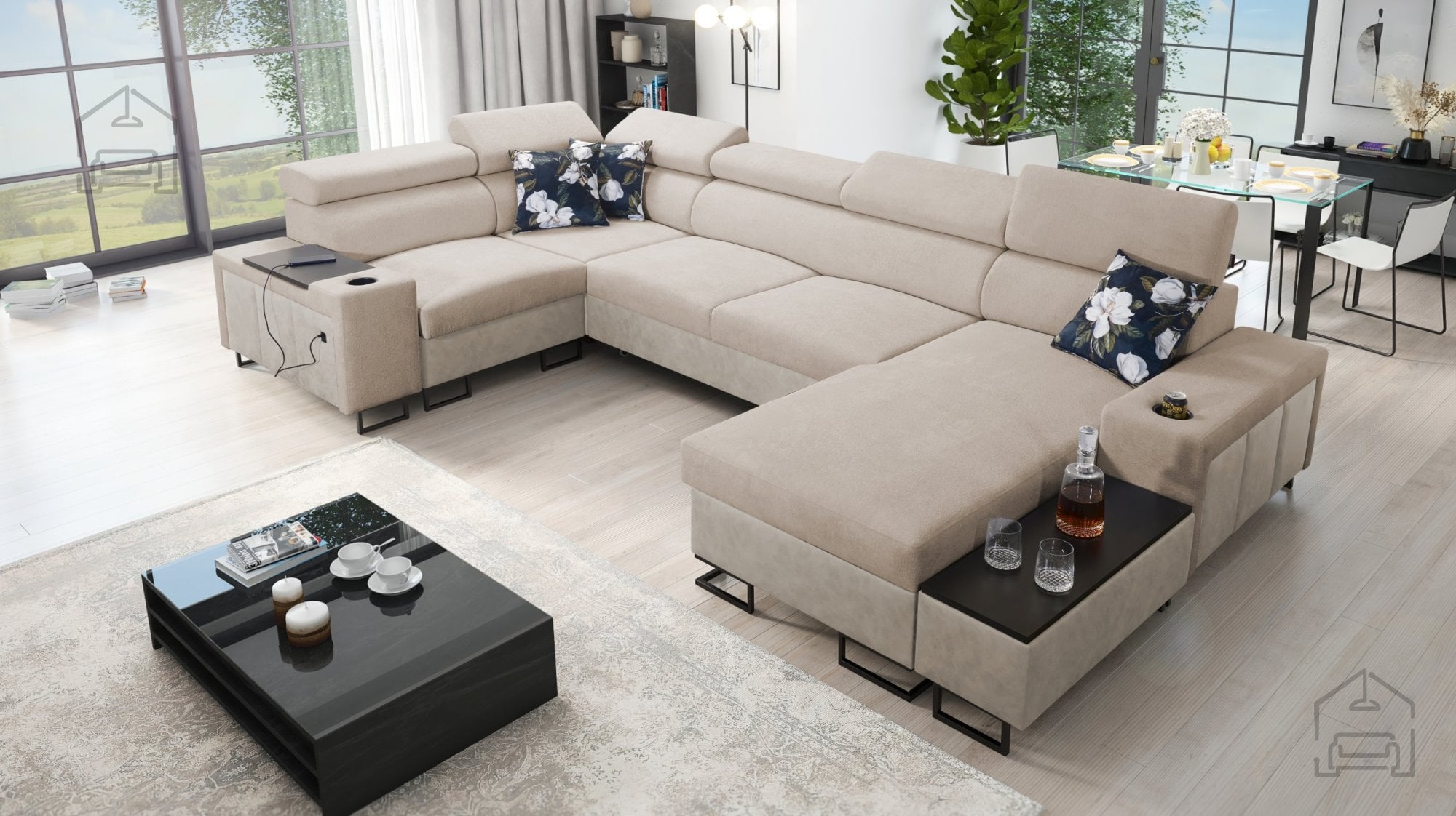 Sedežna garnitura vključuje polico v kotu, ki dopolnjuje uporabnost in dizajn. Možno je naročiti blazine z zadrgo (z doplačilom), kar olajša čiščenje in menjavo prevlek. Površina za spanje je serijsko izdelana v kontrastni barvni kombinaciji, vendar jo je mogoče po želji naročiti tudi v barvi sedežne garniture (z doplačilom). Pri standardni izvedbi proizvajalec naključno izbere barvni odtenek in strukturo površine spanja, kar pomeni, da je vsak kos nekoliko unikaten.