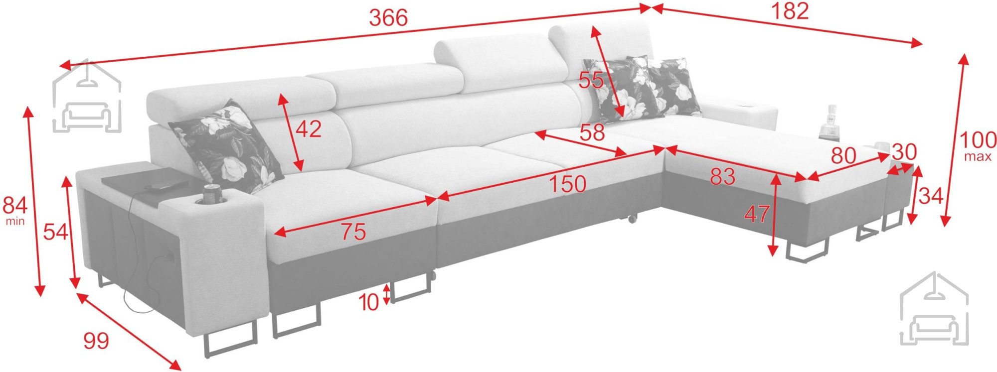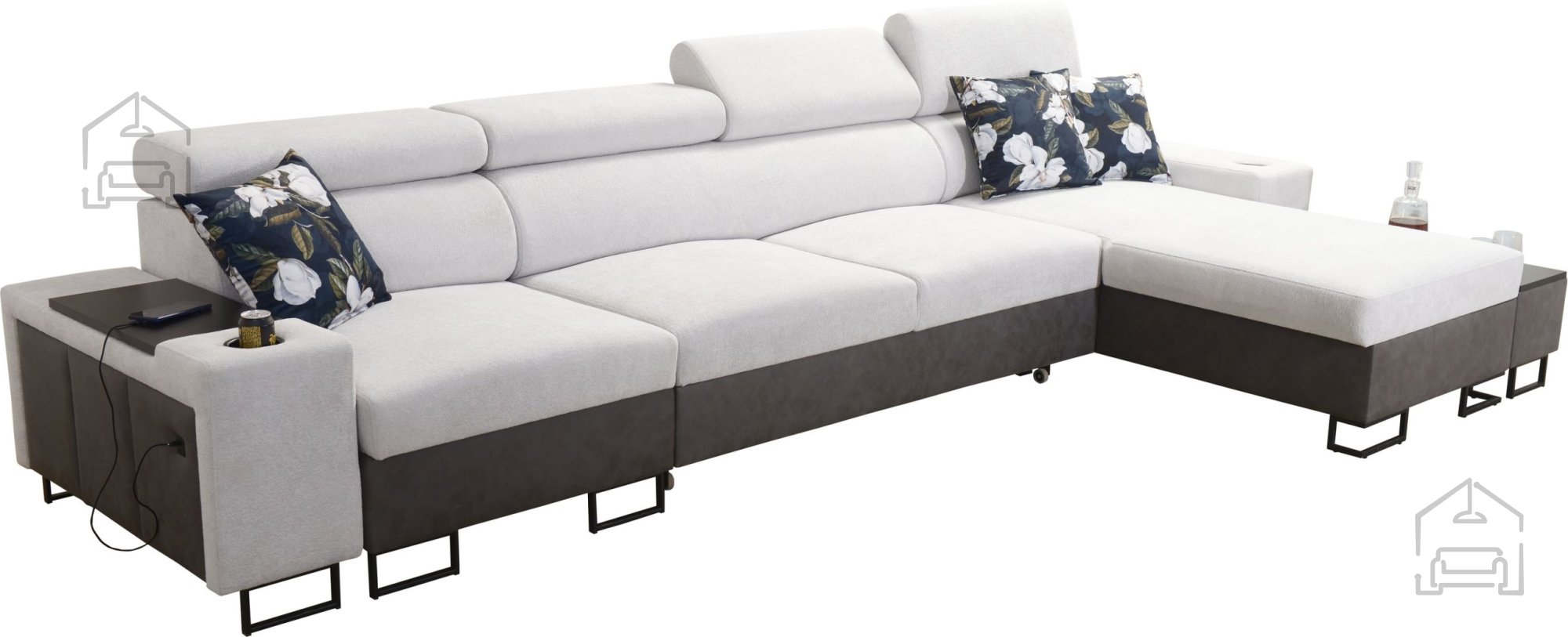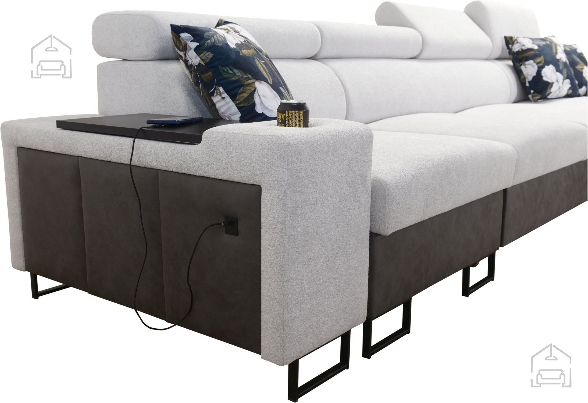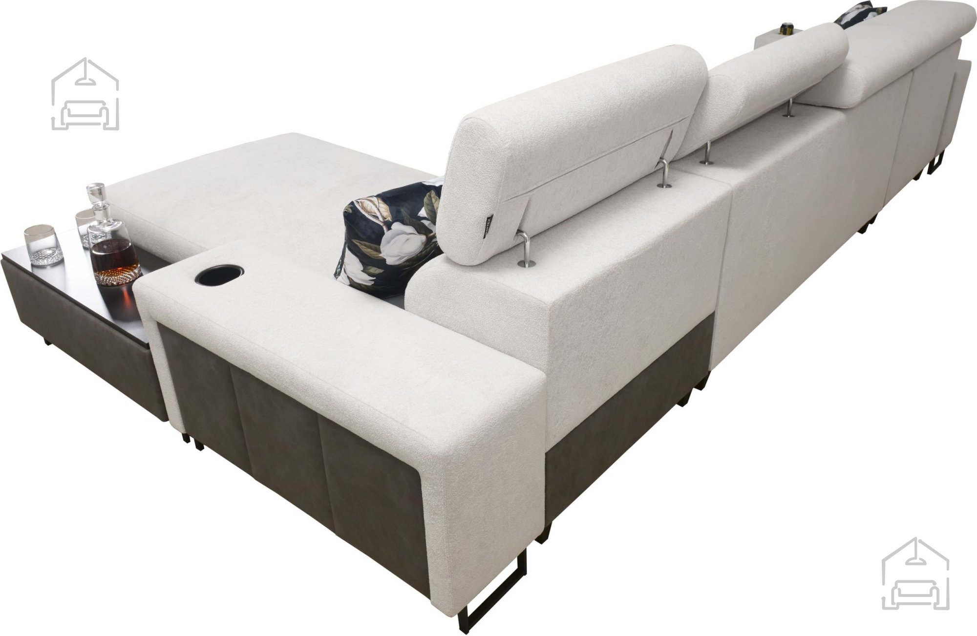 Ta model je zasnovan z mislijo na uporabnost in urejenost prostora. Vgrajena sta dva prostorna predala za posteljnino, ki omogočata preprosto shranjevanje odej ali blazin. Poleg tega ima garnitura štiri nastavljive naslone za glavo, ki jih lahko prilagodite lastnim potrebam, kar povečuje udobje pri sedenju ali gledanju televizije.