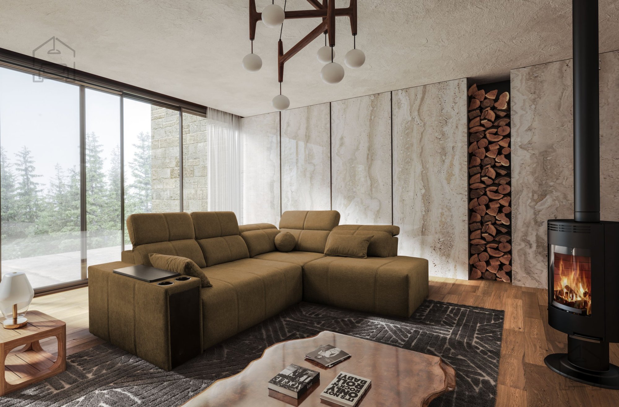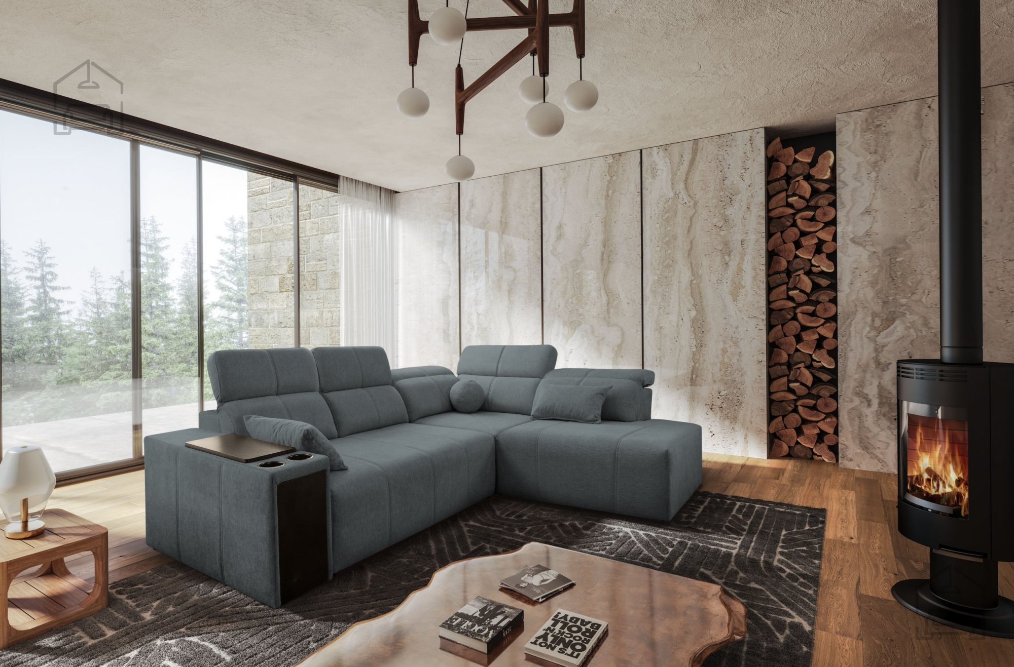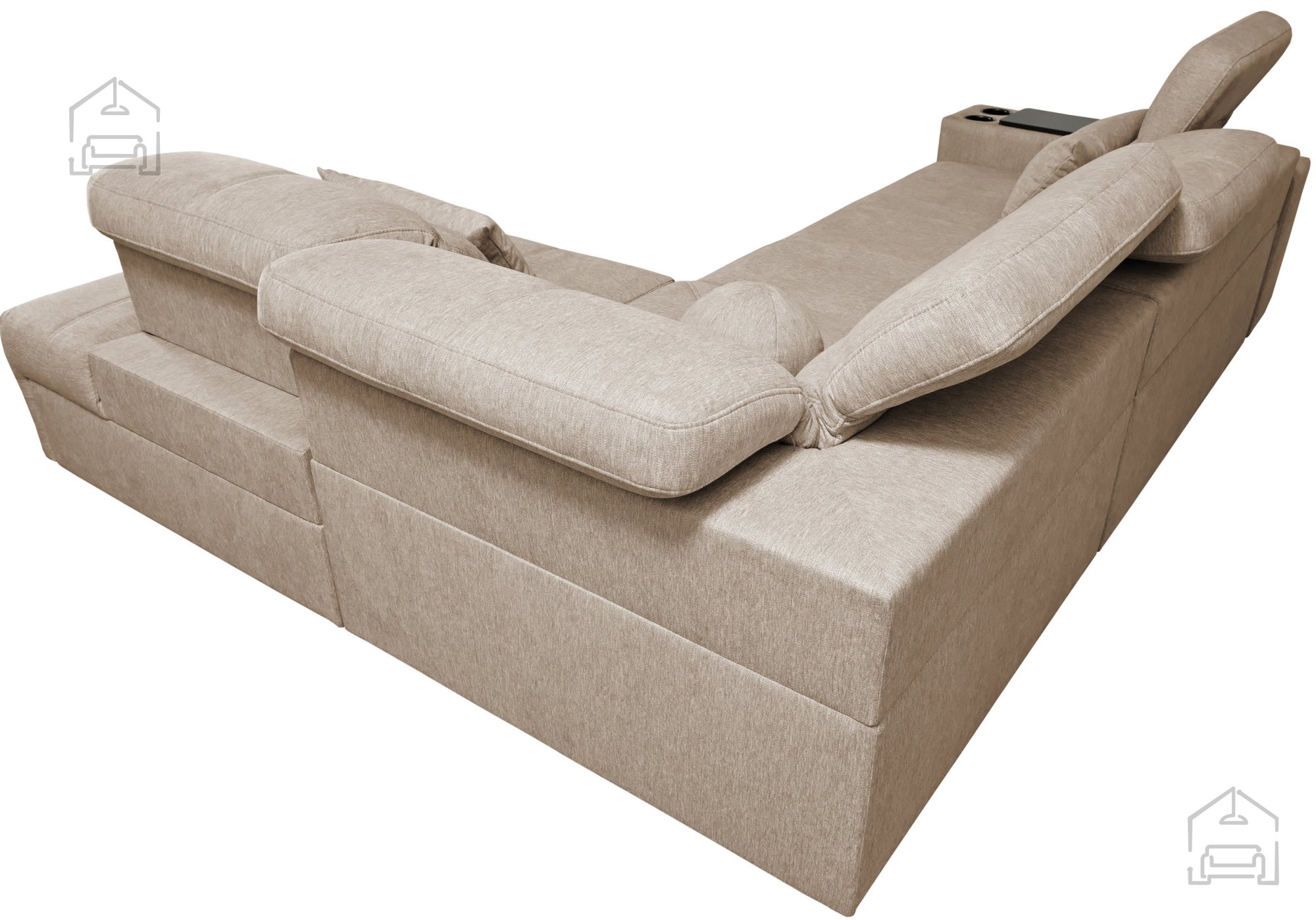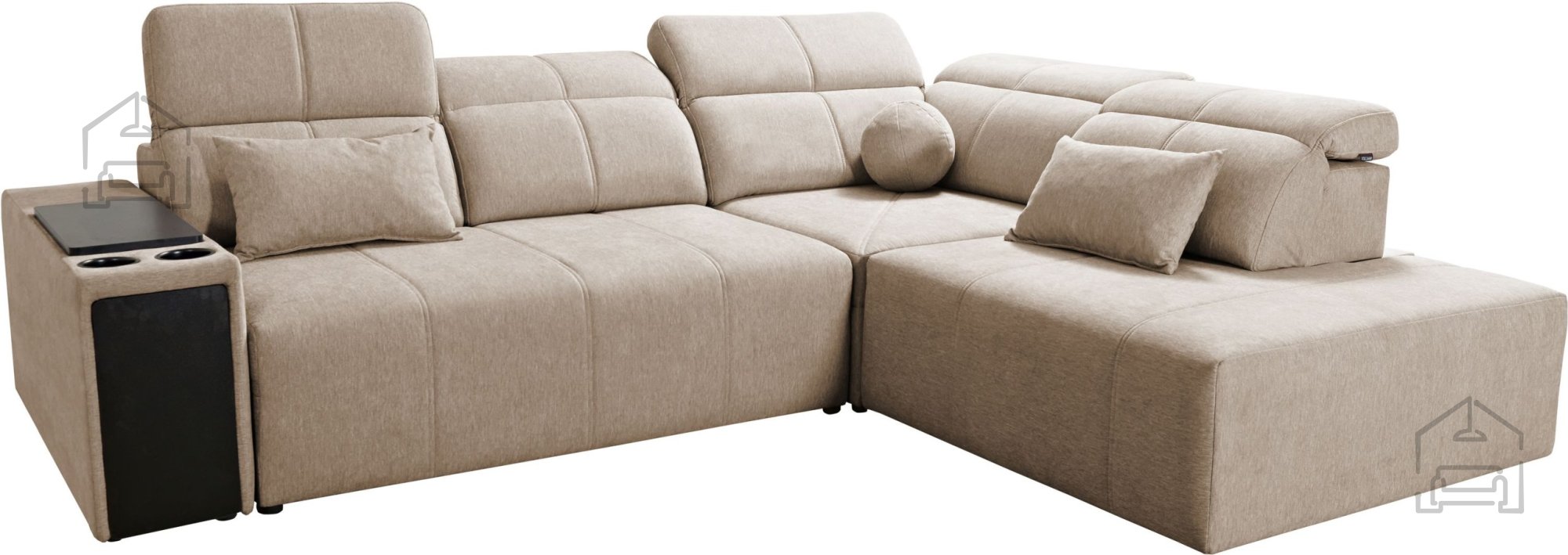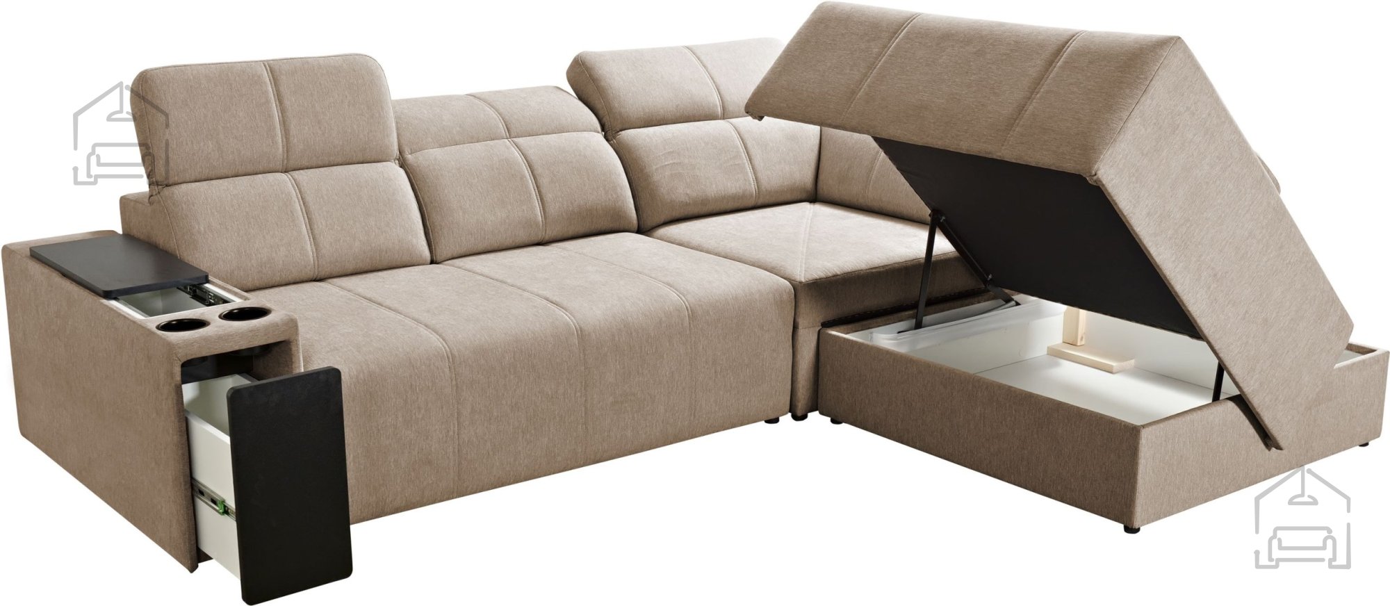 V garnituro je vgrajenih pet nastavljivih vzglavnikov, ki dodatno izboljšajo ergonomijo sedenja in podpirajo vrat ter ramenski del. Višina sedeža meri 43 cm, kar zagotavlja udoben položaj za vstajanje in sedenje. Poleg tega ima garnitura dva odpirajoča se stranska predala (barki) ter držalo za pijačo (cup holder), s katerim bo vaš prostor za sprostitev popoln.