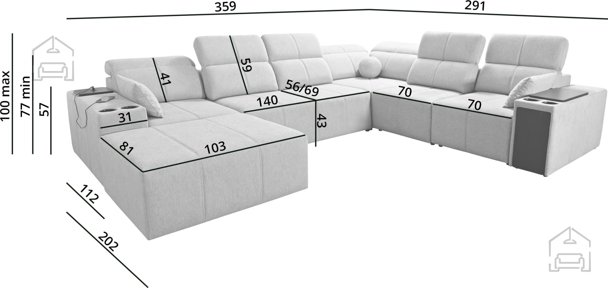 Mindy VIII s svojimi dimenzijami 359x291x100 cm prinaša udobje za vso družino. Sedeži temeljijo na sistemu valovitih vzmeti in polnilu iz utrjene pene T-30 debeline 10 cm, kar omogoča optimalno podporo telesu in dolgotrajno elastičnost. Višina sedeža znaša 43 cm, kar zagotavlja udoben in naraven položaj sedenja. Posebnost tega modela so regulirana naslonjala, ki omogočajo nastavitev globine sedeža od 56 do 69 cm, tako da lahko vsak uporabnik prilagodi položaj svojim potrebam. Glavni modul ima enoten, v celoti drsni naslon, medtem ko ima ležalni del prav tako možnost premikanja naslona.