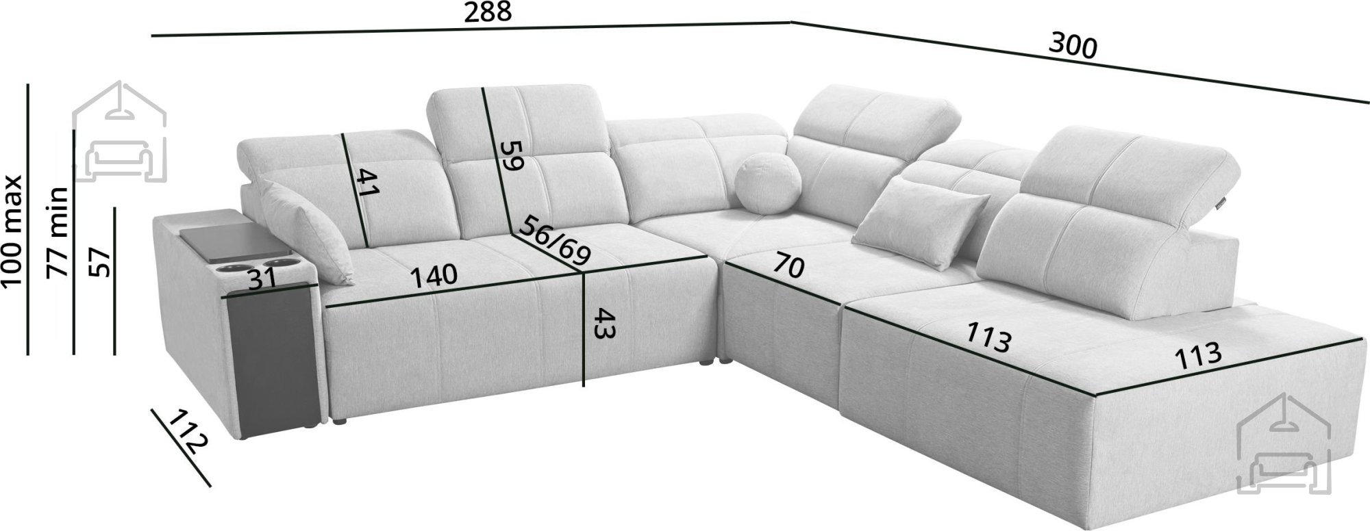 Mindy IX omogoča nastavljiva naslonjala, s katerimi lahko prilagodite globino sedeža od 56 do 69 cm. Tako si lahko vsak uporabnik prilagodi sedenje glede na svoje potrebe – od sproščenega ležanja do pokončne drže. Garnitura ima šest nastavljivih vzglavnikov, ki dodatno povečajo udobje in podpirajo vratni del pri daljšem sedenju ali gledanju televizije.