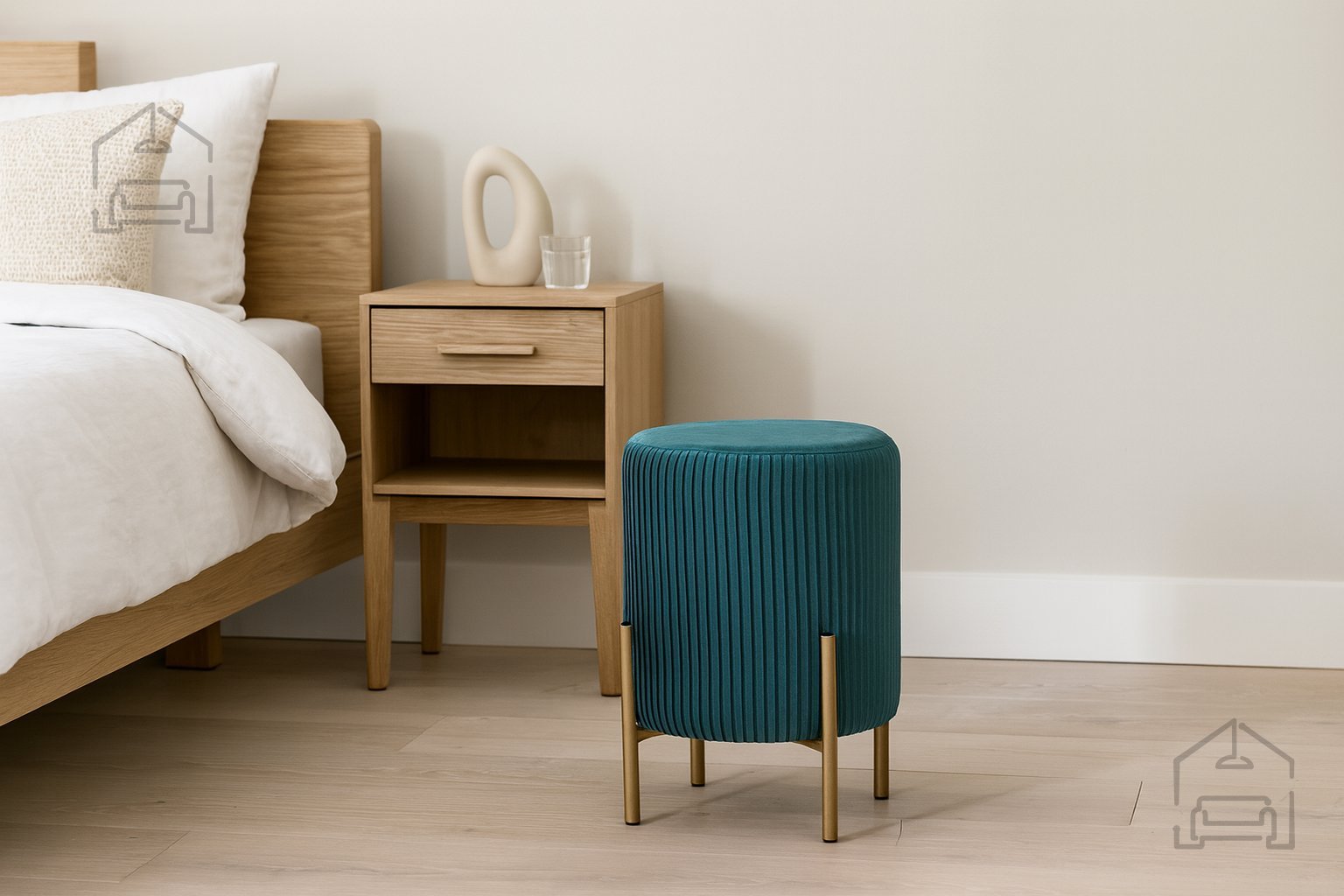 Tabure PHO4217 iz tovarne Chomik, izdelan na Poljskem, odraža značilno evropsko kakovost in pozornost do detajlov. Kovinske nogice v zlati barvi zagotavljajo odlično stabilnost in nosilnost do 80 kg, hkrati pa ustvarjajo zanimiv kontrast z mehko turkizno tkanino. Žametna površina je prijetna na otip, enostavna za čiščenje in ohranja svoj izgled tudi ob pogosti uporabi. Zaradi brezčasne oblike se tabure lepo ujema s sodobnimi, skandinavskimi ali glamuroznimi interierji.