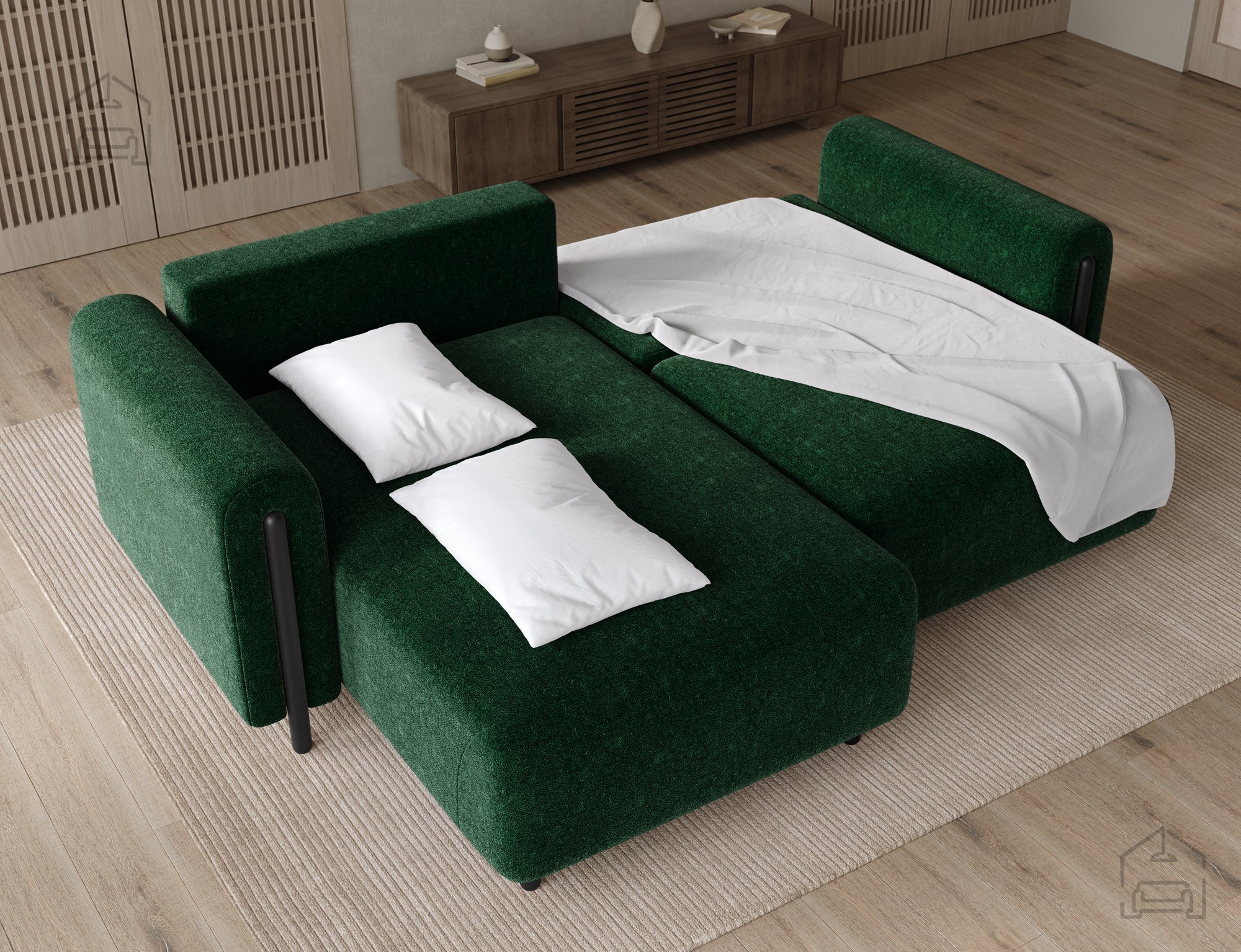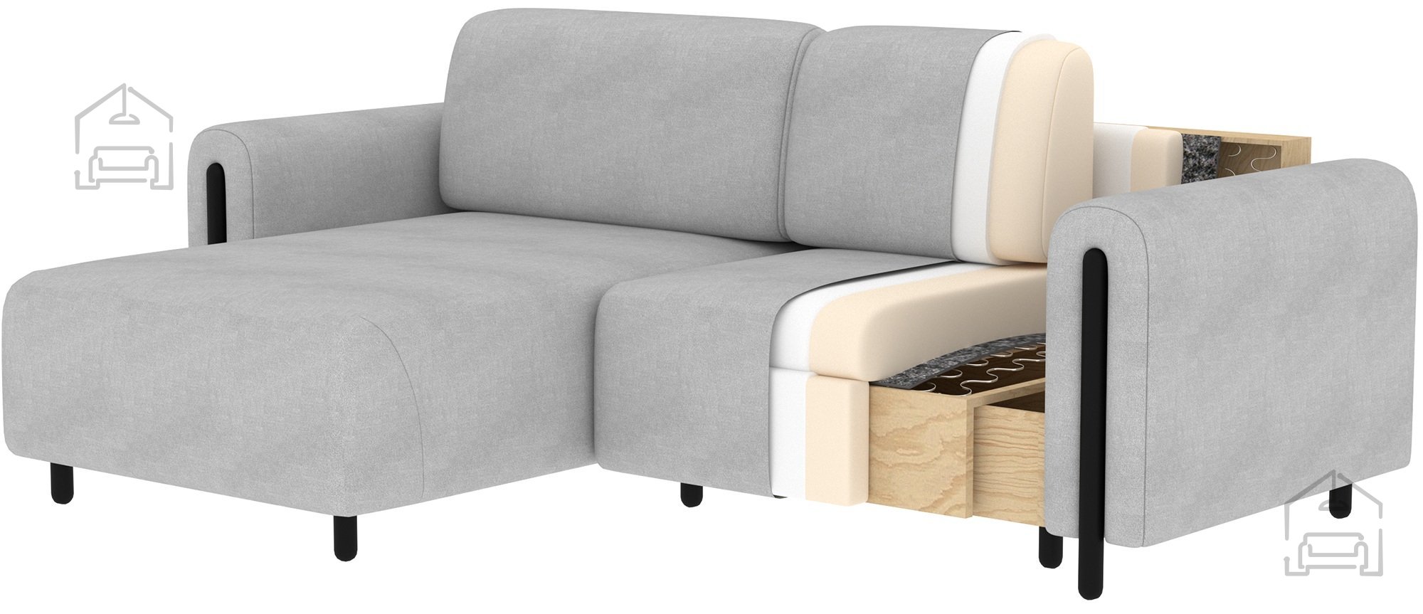 Mehanizem Euro omogoča hitro in preprosto preoblikovanje sedežne garniture v posteljo. Ta sistem je zasnovan tako, da ne zahteva veliko napora – izvlečni del se premika gladko, brez sunkov ali dodatne obremenitve konstrukcije. Zaradi premišljene zasnove je primerno podprt, kar povečuje stabilnost raztegnjenega ležišča in udobje med spanjem.
