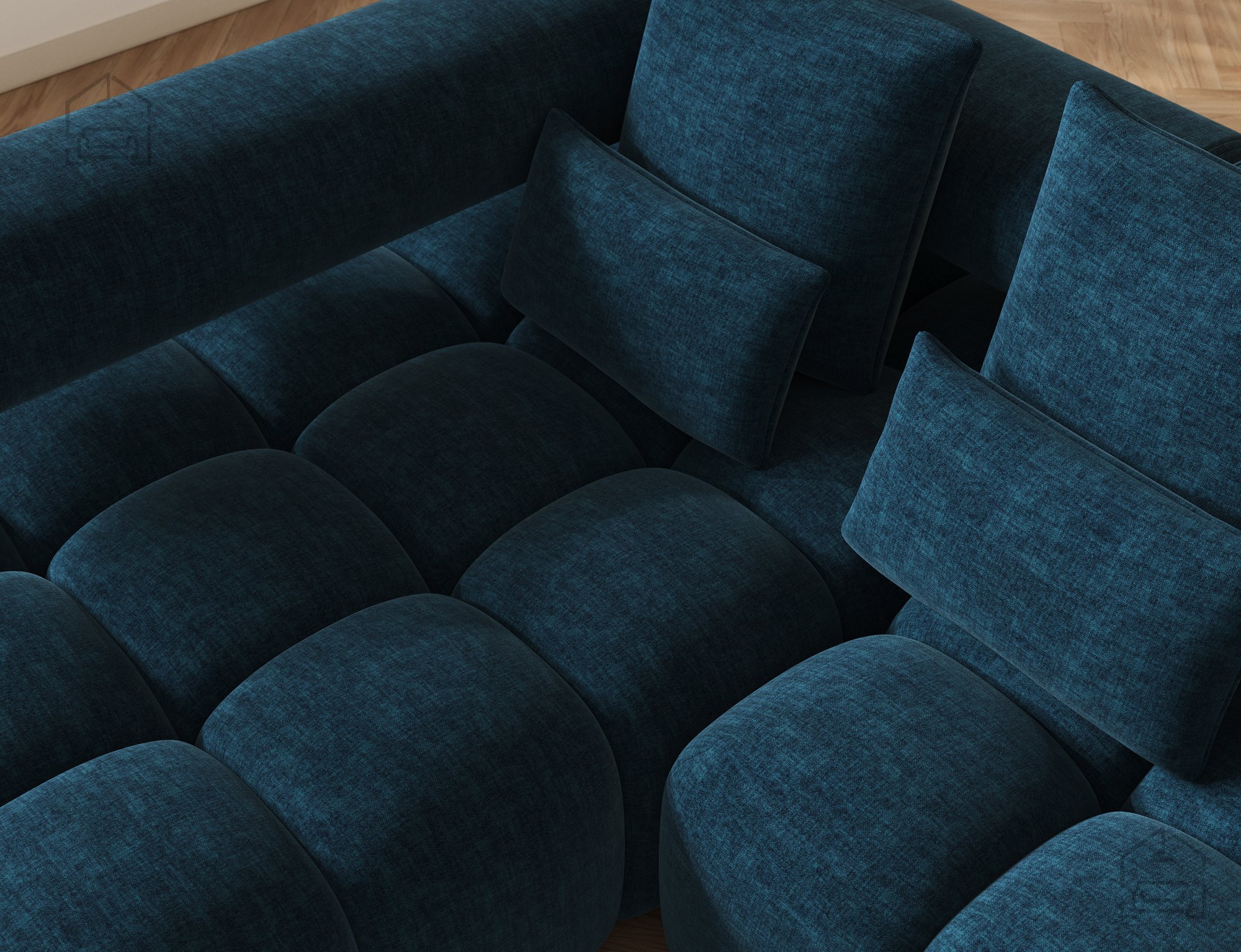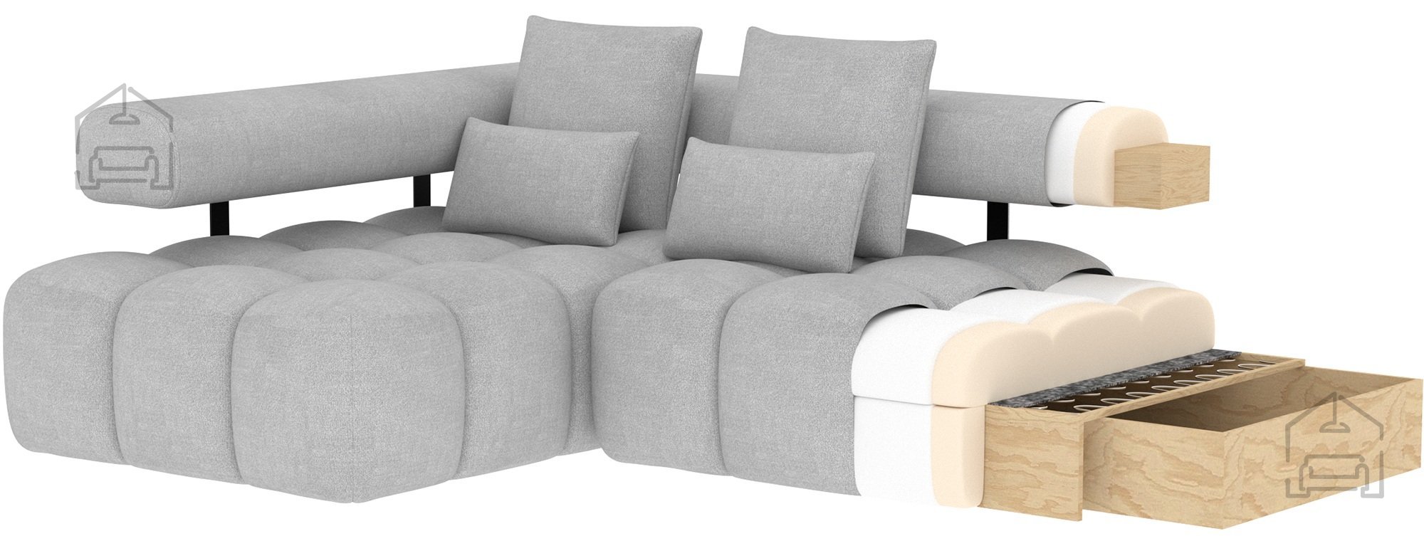 Okvir garniture je izdelan iz trpežnega lesa, kar zagotavlja stabilnost in trdnost konstrukcije. Sedežni del vsebuje vzmetno jedro Wave Spring v kombinaciji z visokoelastično peno HR3030, ki se odlikuje po odlični odpornosti proti deformacijam in dolgotrajnem udobju sedenja. Naslon je polnjen s peno T2130, ki nudi mehko, a hkrati podporno oporo hrbtu. Ta skrbno izbrana kombinacija materialov omogoča ergonomsko sedenje in ohranja garnituro v popolni obliki še dolgo po nakupu.
