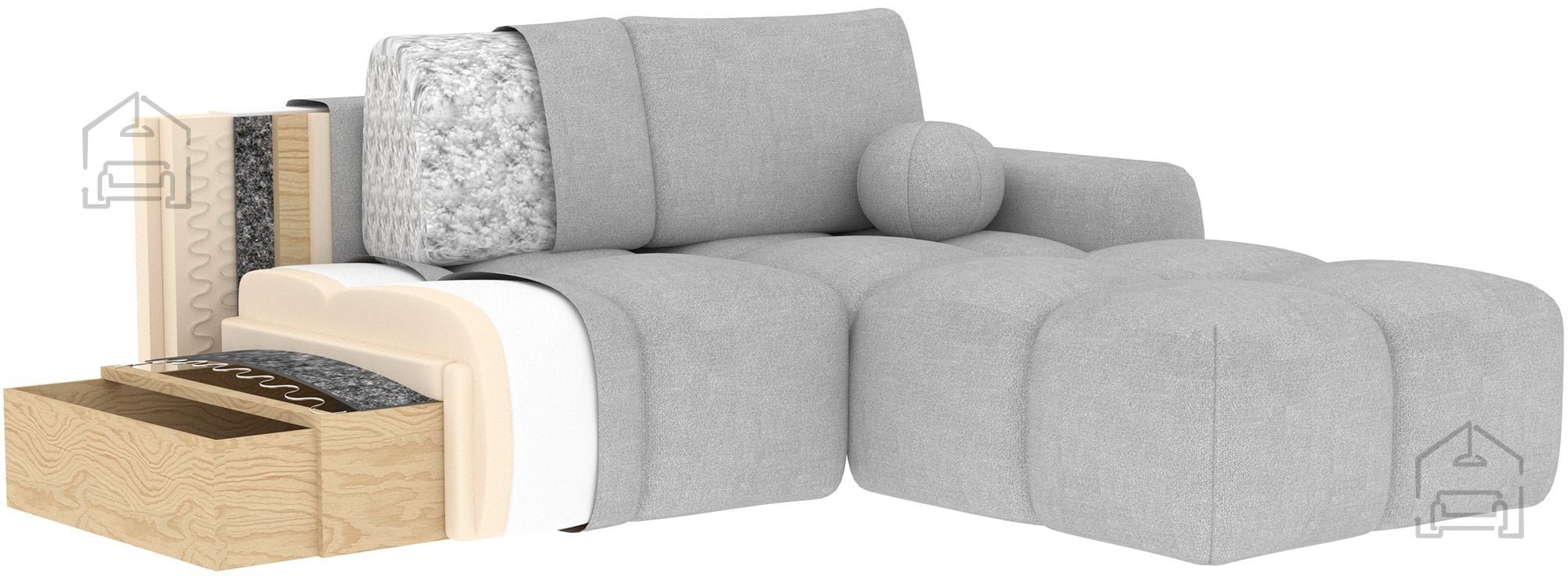 Okvir garniture je izdelan iz lesa, kar zagotavlja stabilnost in dolgo življenjsko dobo. Sedežni del vsebuje wave spring vzmetno jedro, dopolnjeno s kakovostnima penama HR3030 in T2315, ki skupaj zagotavljata popolno ravnovesje med mehkobo in podporo. Naslon sestavljajo mehke blazine, polnjene s penastim granulatom, ki se prilagodi obliki telesa in nudi prijeten občutek sproščenosti.